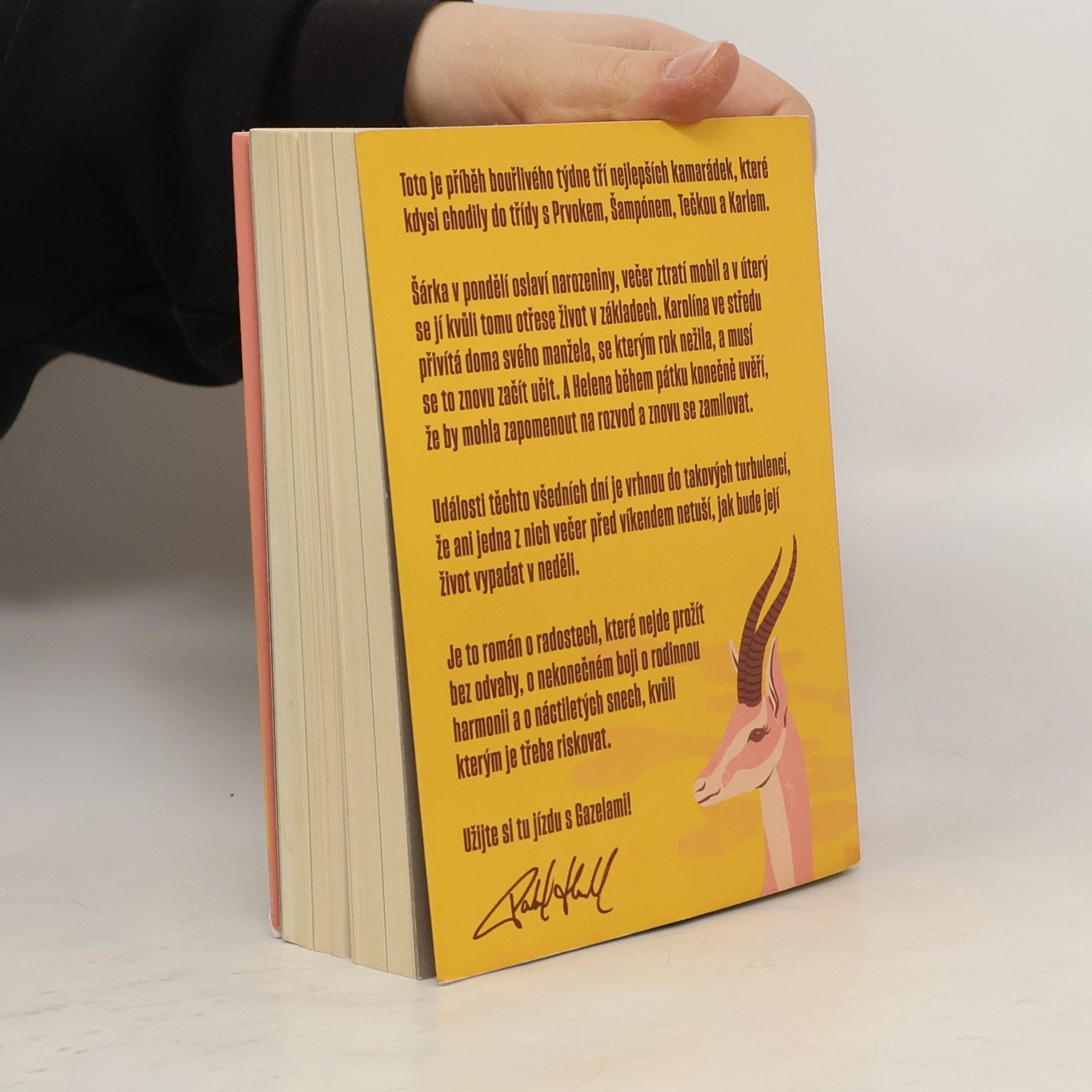Gazely vypráví příběh jednoho bouřlivého týdne tří blízkých kamarádek, které kdysi chodily do školy s Prvokem, Šampónem, Tečkou a Karlem. Šárka začíná týden narozeninovou oslavou, ale ztráta mobilu jí už v úterý převrátí život naruby. Karolína se ve středu setkává se svým manželem, se kterým po roce odloučení zkouší obnovit vztah. Helena v pátek zjišťuje, že by mohla nechat rozvod za sebou a znovu najít lásku. Během těchto několika dní se jejich životy ocitnou ve víru změn, takže ani jedna z nich nemá tušení, jaké překvapení je čeká do neděle. Tento román je o radosti, která vyžaduje odvahu, o neustálém úsilí najít rovnováhu v rodině a o snech z mládí, kvůli kterým stojí za to riskovat.