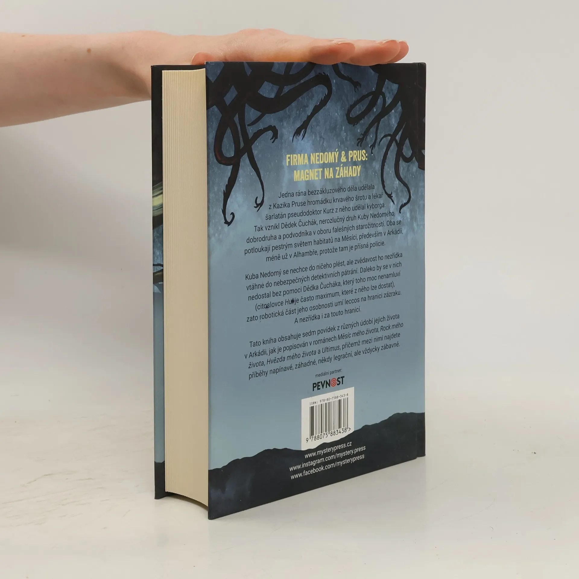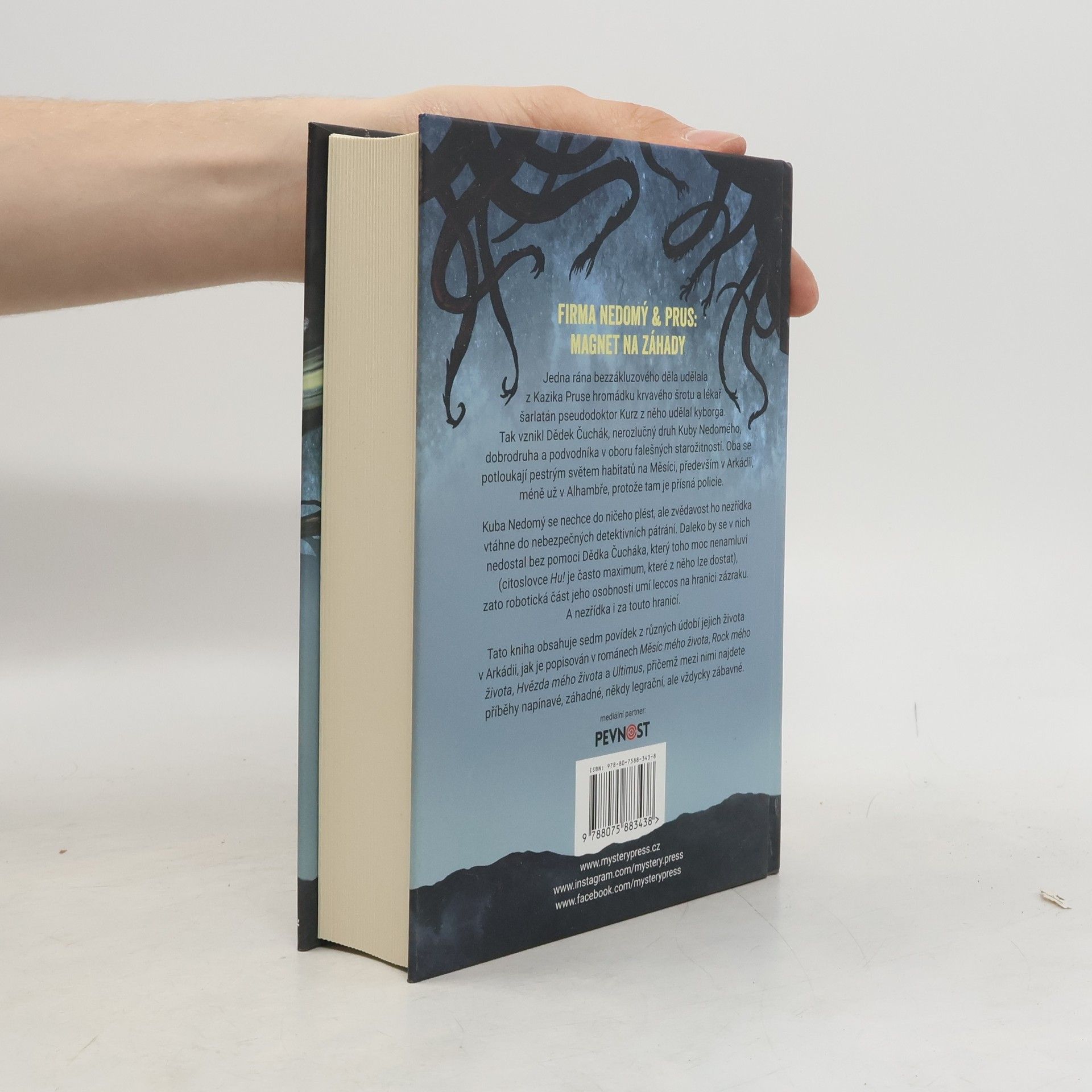 FIRMA NEDOMÝ & PRUS: MAGNET NA ZÁHADY. Jedna rána bezzákluzového děla udělala z Kazika Pruse hromádku krvavého šrotu a lékař šarlatán pseudodoktor Kurz z něho udělal kyborga. Tak vznikl Dědek Čuchák, nerozlučný druh Kuby Nedomého, dobrodruha a podvodníka v oboru falešných starožitností. Oba se potloukají pestrým světem habitatů na Měsíci, především v Arkádii, méně už v Alhambře, protože tam je přísná policie. Kuba Nedomý se nechce do ničeho plést, ale zvědavost ho nezřídka vtáhne do nebezpečných detektivních pátrání. Daleko by se v nich nedostal bez pomoci Dědka Čucháka, který toho moc nenamluví (citoslovce Hu! je často maximum, které z něho lze dostat), zato robotická část jeho osobnosti umí leccos na hranici zázraku. A nezřídka i za touto hranicí. Tato kniha obsahuje sedm povídek z různých údobí jejich života v Arkádii, jak je popisován v románech Měsíc mého života, Rock mého života, Hvězda mého života a Ultimus, přičemž mezi nimi najdete příběhy napínavé, záhadné, někdy legrační, ale vždycky zábavné.