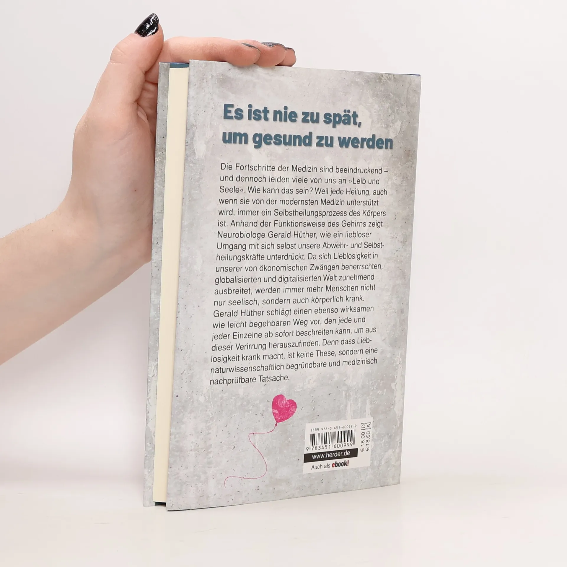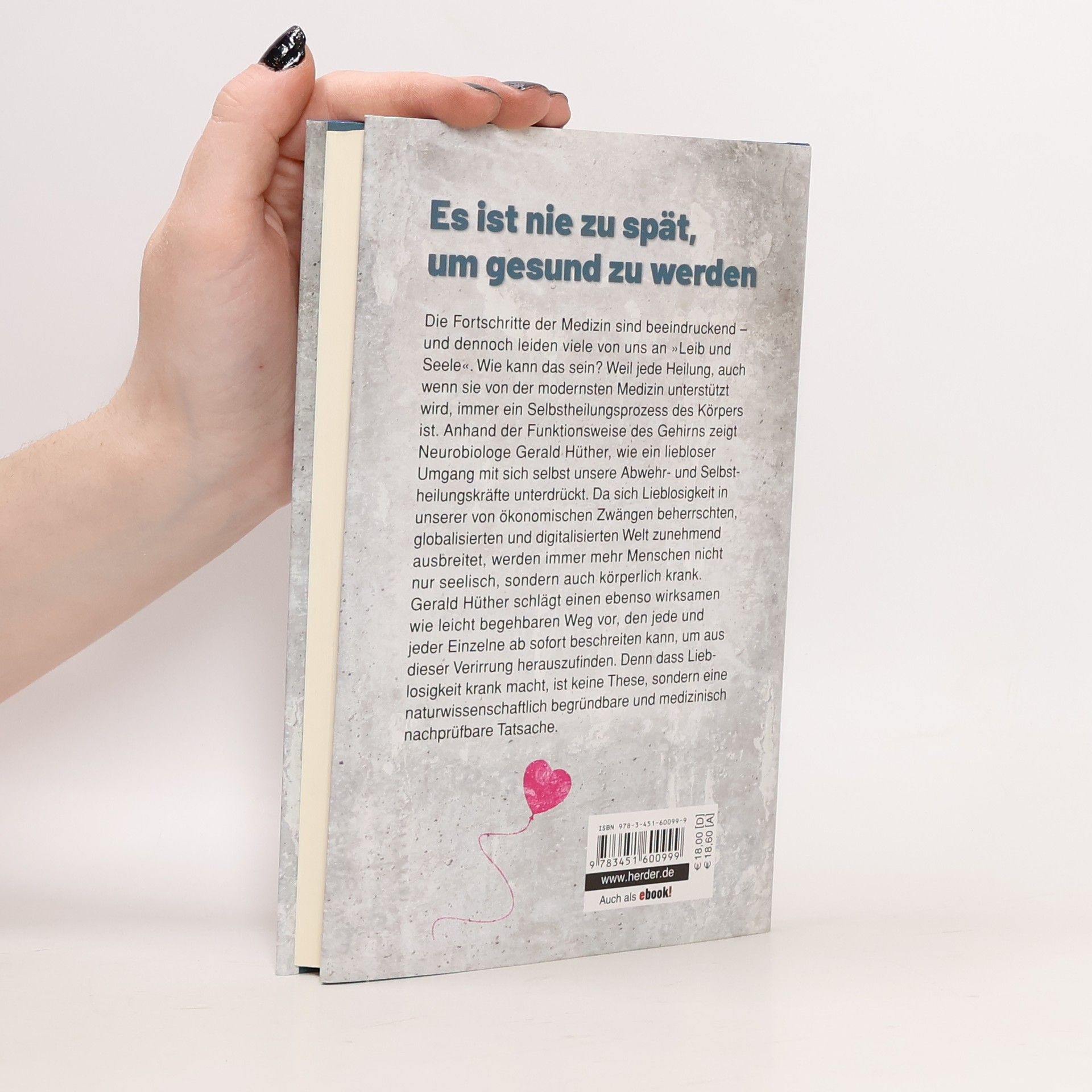 Die Fortschritte der Medizin sind beeindruckend – und dennoch leiden viele von uns an „Leib und Seele“. Wie kann das sein? Gerald Hüther, Gehirnforscher, Vorstand der Akademie für Potentialentfaltung und Bestsellerautor geht der Frage nach, weshalb uns das beste und teuerste Gesundheitssystem der Welt nicht gesünder macht: Weil jeder Heilungsprozess, auch wenn er von der modernsten Medizin unterstützt wird, letztlich immer ein Selbstheilungsprozess des Körpers ist. Anhand der Funktionsweise des Gehirns macht der Autor auf bemerkenswert einfache und überzeugende Weise verständlich, wie sehr unsere Selbstheilungsfähigkeit durch liebloses Verhalten sich selbst und anderen gegenüber unterdrückt wird. Weil sich Lieblosigkeit in unserer, von ökonomischen Zwängen beherrschten, globalisierten und digitalisierten Welt zunehmend ausbreitet, werden immer mehr Menschen nicht nur seelisch sondern auch körperlich krank. Gerald Hüther schlägt einen ebenso wirksamen wie leicht begehbaren Weg vor, den jede und jeder Einzelne ab sofort beschreiten kann, um aus dieser Verirrung herauszufinden.