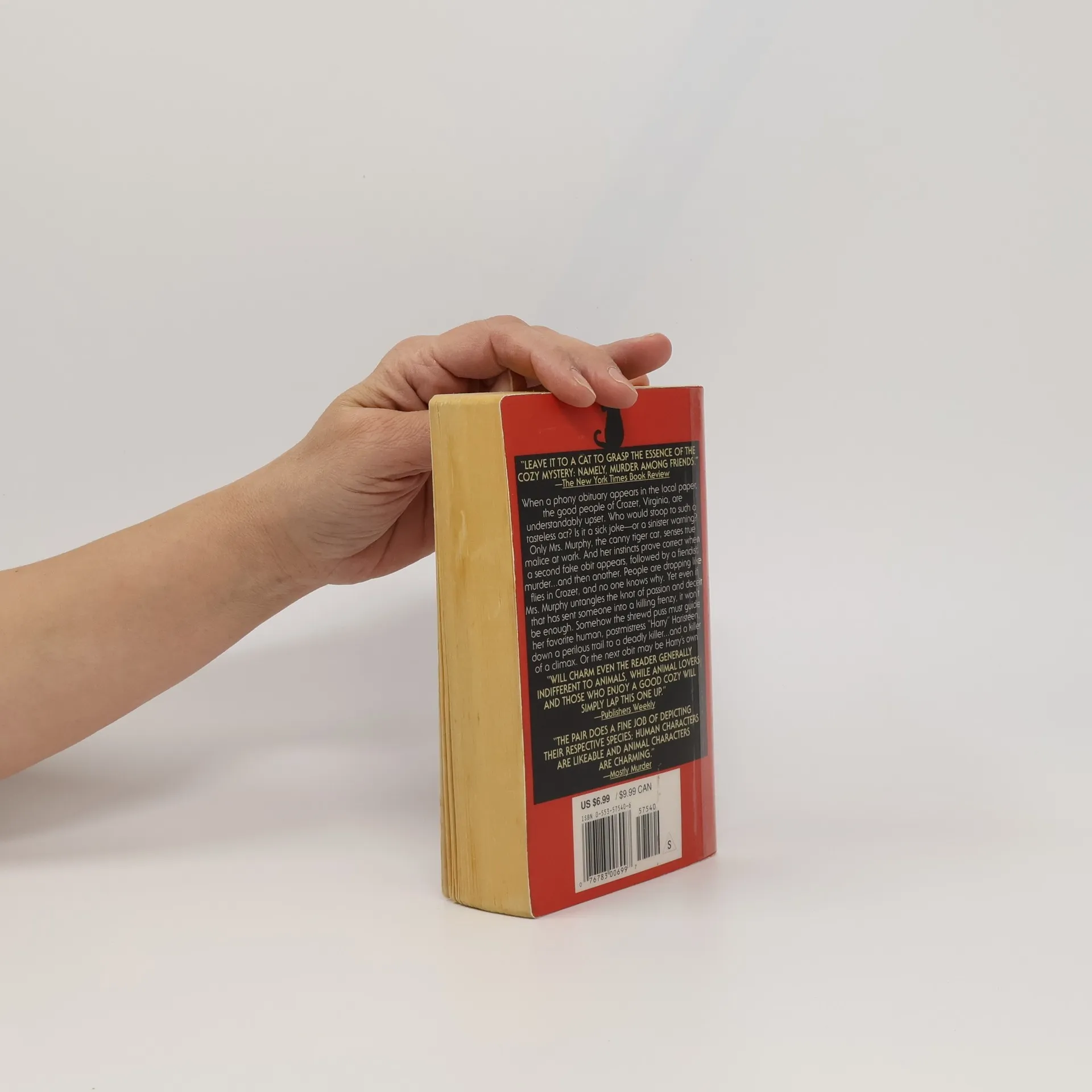 an alternate cover edition can be found hereAs the principal of St. Elizabeth's, an exclusive private school that caters to Crozet, Virginia's, best families, Roscoe Fletcher has proven himself to be a highly effective and vastly popular administrator. So when his obituary appears in the local paper, everyone in town is upset. Yet nothing compares to the shock they feel when they discover that Roscoe Fletcher isn't dead at all. Someone has stooped to putting a phony obituary in the newspaper. But is it a sick joke or a sinister warning? Only Mrs. Murphy, the canny tiger cat, senses the pure malice behind the act. And when a second false obit appears, this time of a Hollywood has-been who is Roscoe Fletcher's best friend, Mrs. Murphy invites her friends, the corgi Tee Tucker, and fat cat Pewter, to do a bit of sleuthing. It's obvious to this shrewd puss that two phony death notices add up to deadly trouble. And her theory is borne out when one of the men is fiendishly murdered. "Harry" Haristeen, in her position as Crozet's postmistress, is the first to hear all the theories on whodunit - starting with the man's jealous wife. Then a second bloody homicide follows, and a third. People are dropping like flies in Crozet and no one seems to know why.