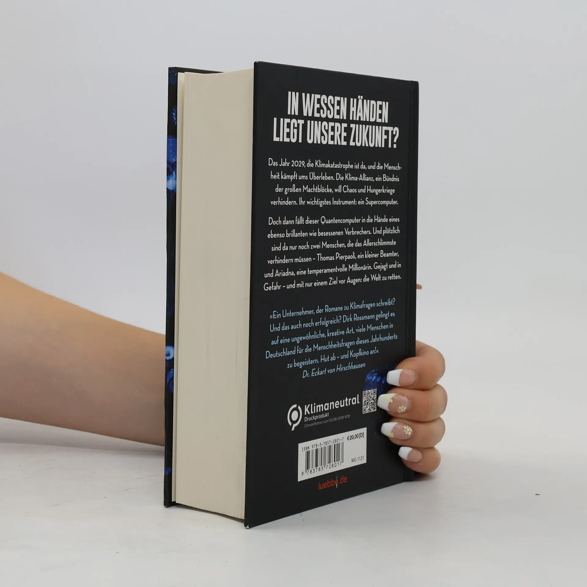 In wessen Händen liegt unsere Zukunft? Das Jahr 2029, die Klimakatastrophe ist da, und die Menschheit kämpft ums Überleben. Die Klima-Allianz, ein Bündnis der großen Machtblöcke, will Chaos und Hungerkriege verhindern. Ihr wichtigstes Instrument: ein Supercomputer. Doch dann fällt dieser Quantencomputer in die Hände eines ebenso brillanten wie besessenen Verbrechers. Und plötzlich sind da nur noch zwei Menschen, die das Allerschlimmste verhindern müssen - Thomas Pierpaoli, ein kleiner Beamter, und Ariadna, eine temperamentvolle Millionärin. Gejagt und in Gefahr - und mit nur einem Ziel vor Augen: die Welt zu retten.