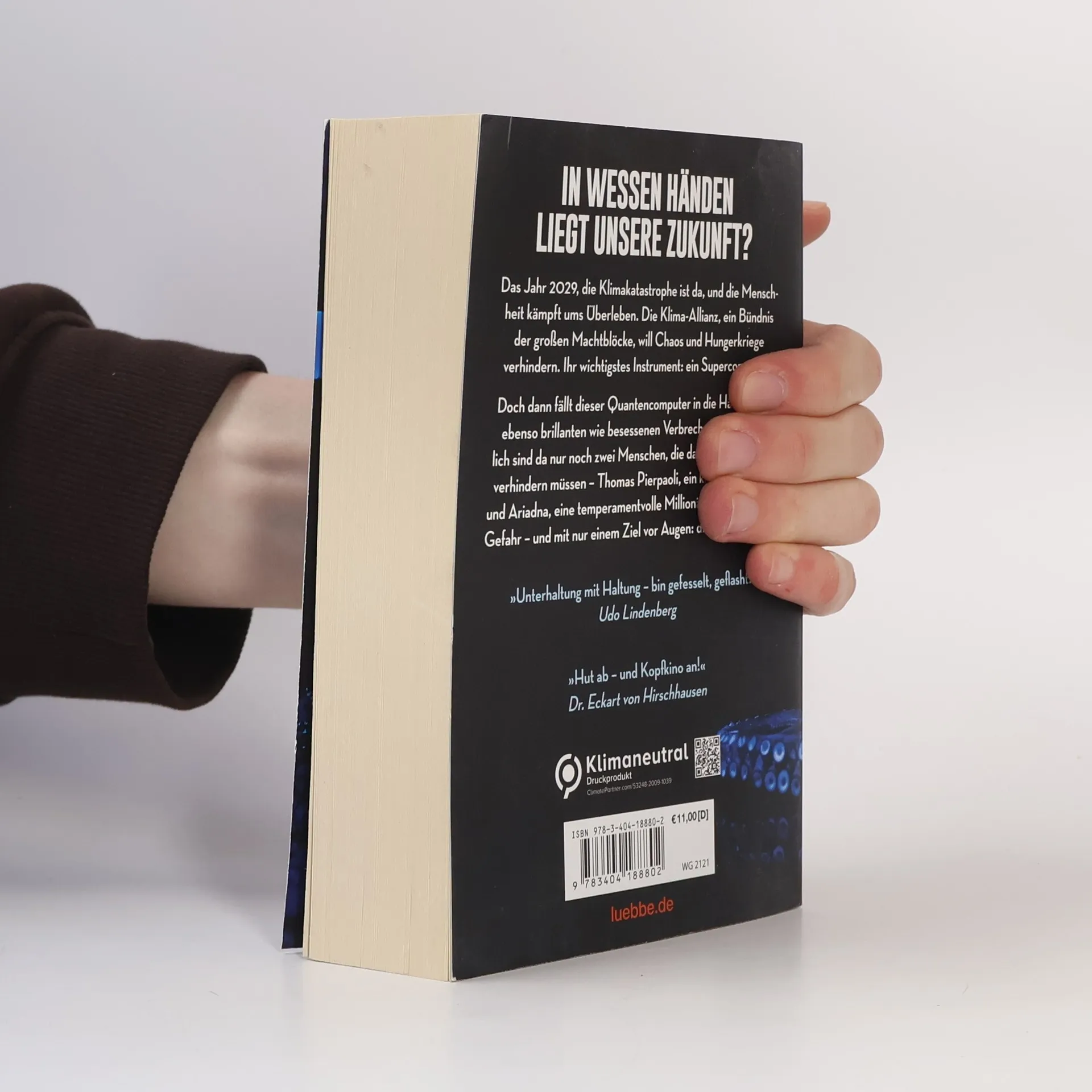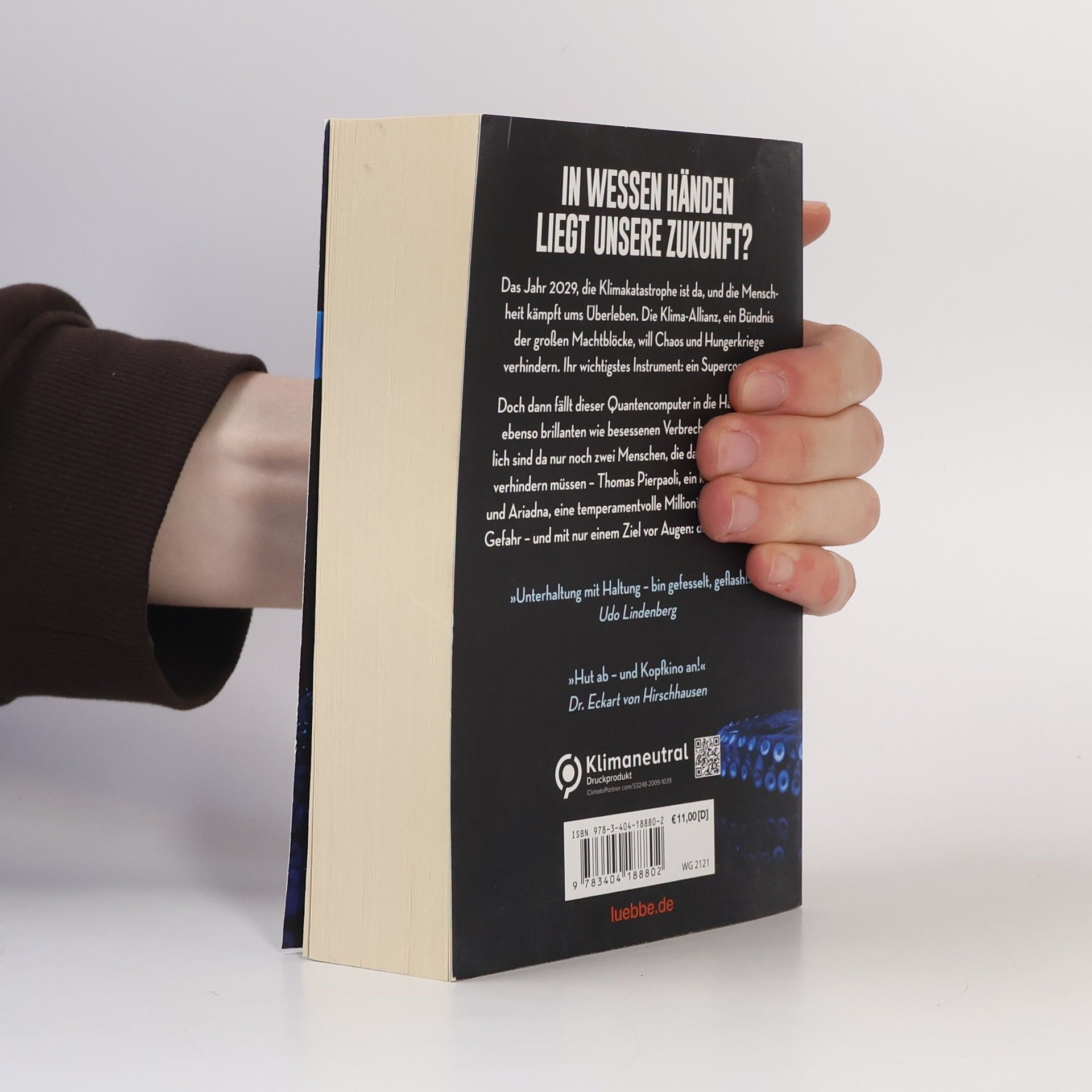 Das Jahr 2029, die Klimakatastrophe ist da, und die Menschheit kämpft ums Überleben. Die Klima-Allianz, ein Bündnis der großen Machtblöcke, will Chaos und Hungerkriege verhindern. Ihr wichtigstes Instrument: ein Supercomputer. Doch dann fällt dieser Quantencomputer in die Hände eines ebenso brillanten wie besessenen Verbrechers. Und plötzlich sind da nur noch zwei Menschen, die das Allerschlimmste verhindern müssen - Thomas Pierpaoli, ein kleiner Beamter, und Ariadna, eine temperamentvolle Millionärin. Gejagt und in Gefahr - und mit nur einem Ziel vor Augen: die Welt zu retten.