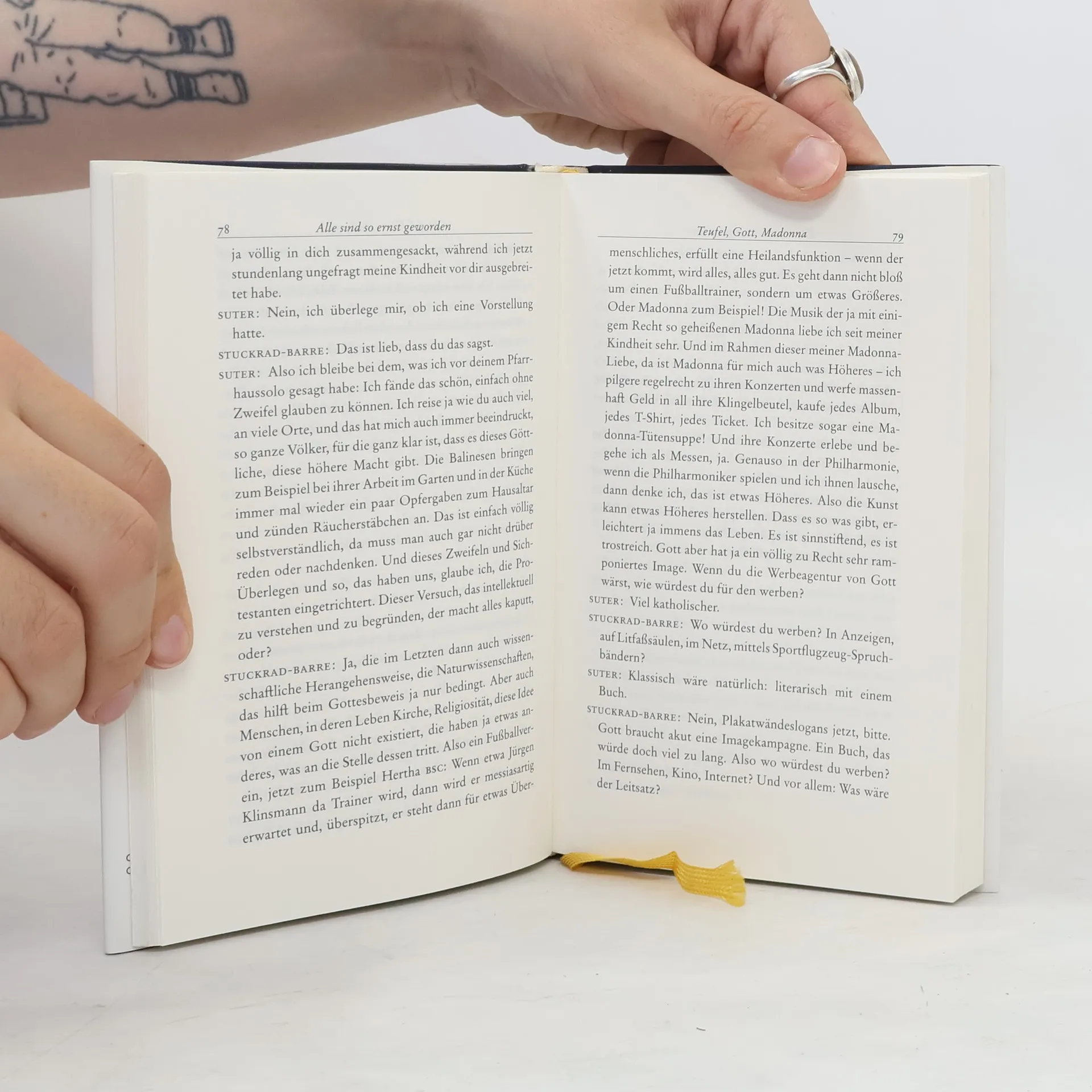 Martin Suter und Benjamin von Stuckrad-Barre unterhalten sich über: Badehosen, Glitzer, Äähm, Hochzeiten, LSD, Teufel, Gott, Madonna, Arbeit, Ibiza, Kochen, Rechnungen, Siri, Fotos, Mundharmonika, Geldscheine, Verliebtheit, Wiedersehen.