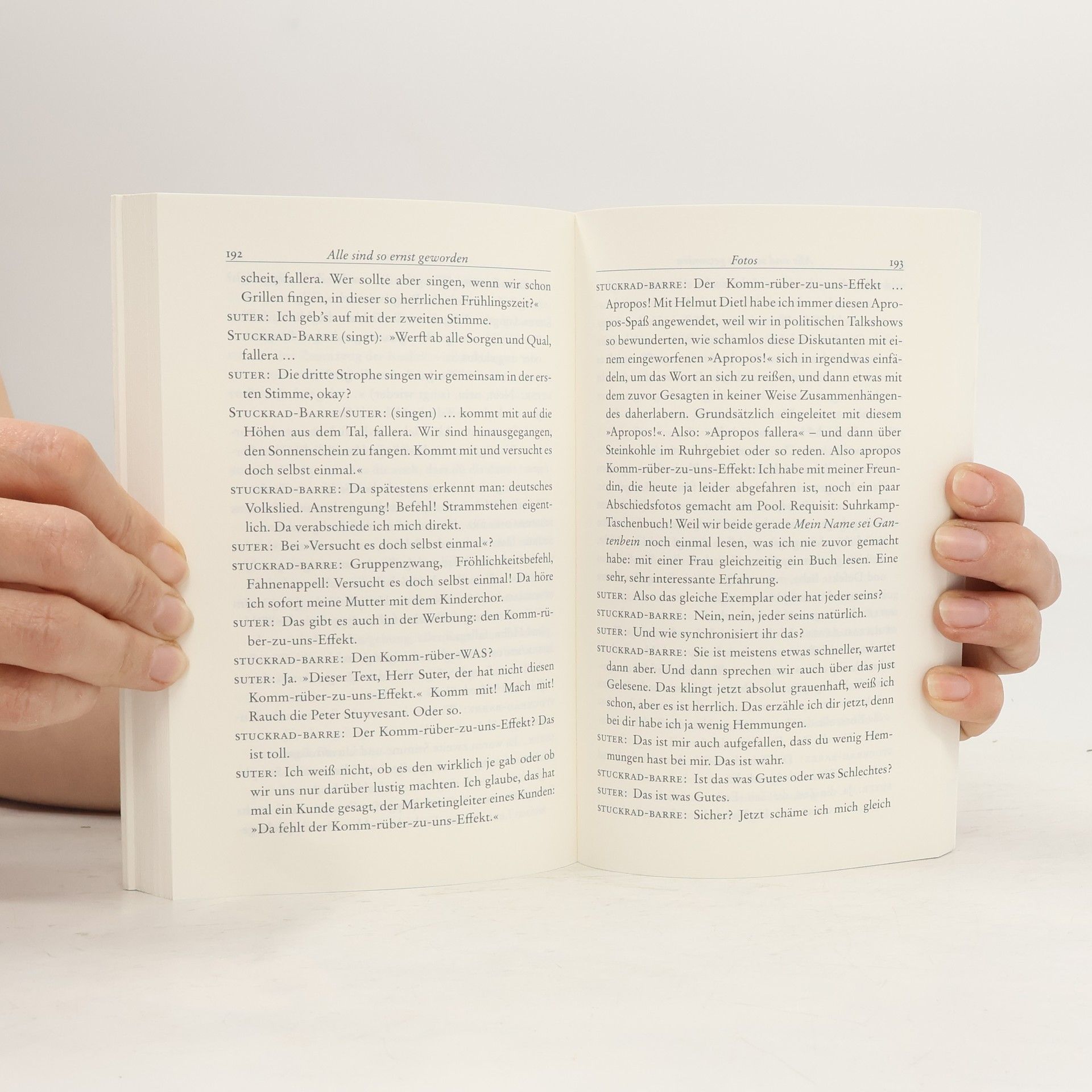Martin Suter und Benjamin von Stuckrad-Barre unterhalten sich über: Badehosen, Glitzer, Äähm, Hochzeiten, LSD, Teufel, Gott, Madonna, Arbeit, Ibiza, Kochen, Rechnungen, Siri, Fotos, Mundharmonika, Geldscheine, Verliebtheit, Wiedersehen.