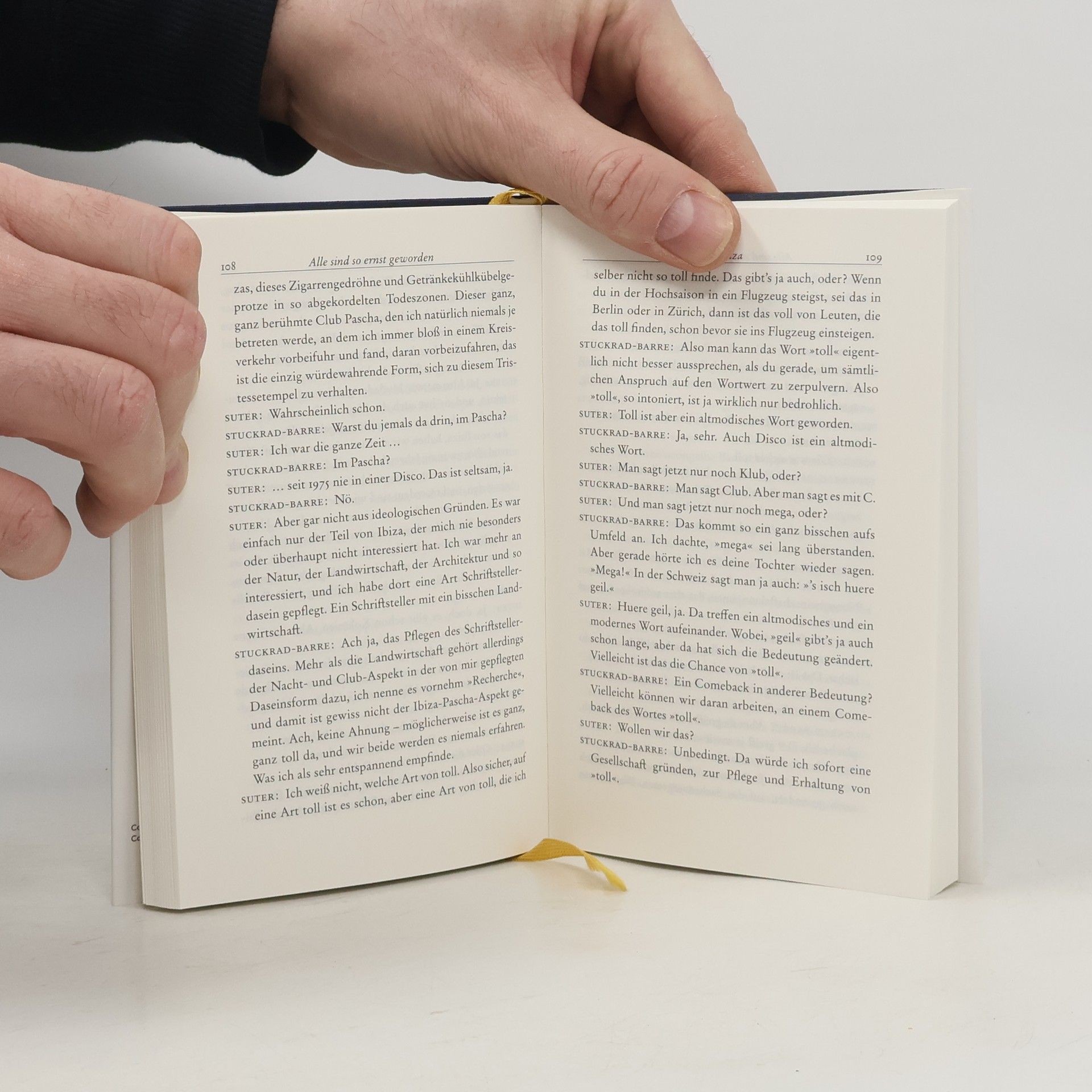 Martin Suter und Benjamin von Stuckrad-Barre unterhalten sich über: Badehosen, Glitzer, Äähm, Hochzeiten, LSD, Teufel, Gott, Madonna, Arbeit, Ibiza, Kochen, Rechnungen, Siri, Fotos, Mundharmonika, Geldscheine, Verliebtheit, Wiedersehen.