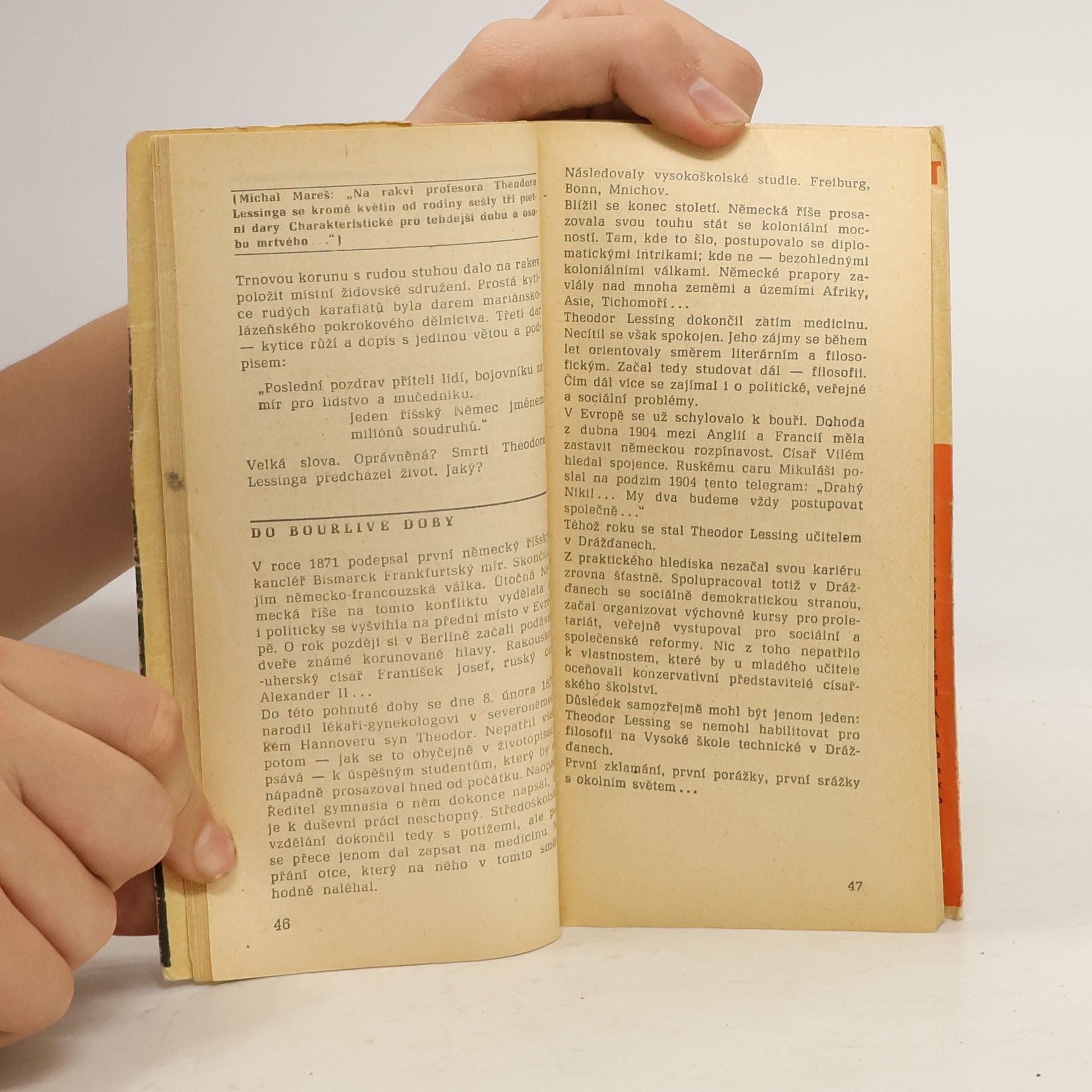 Pokus o reportážní rekonstrukci vraždy profesora Lessinga v roce 1933, jako oběť fašistického teroru.