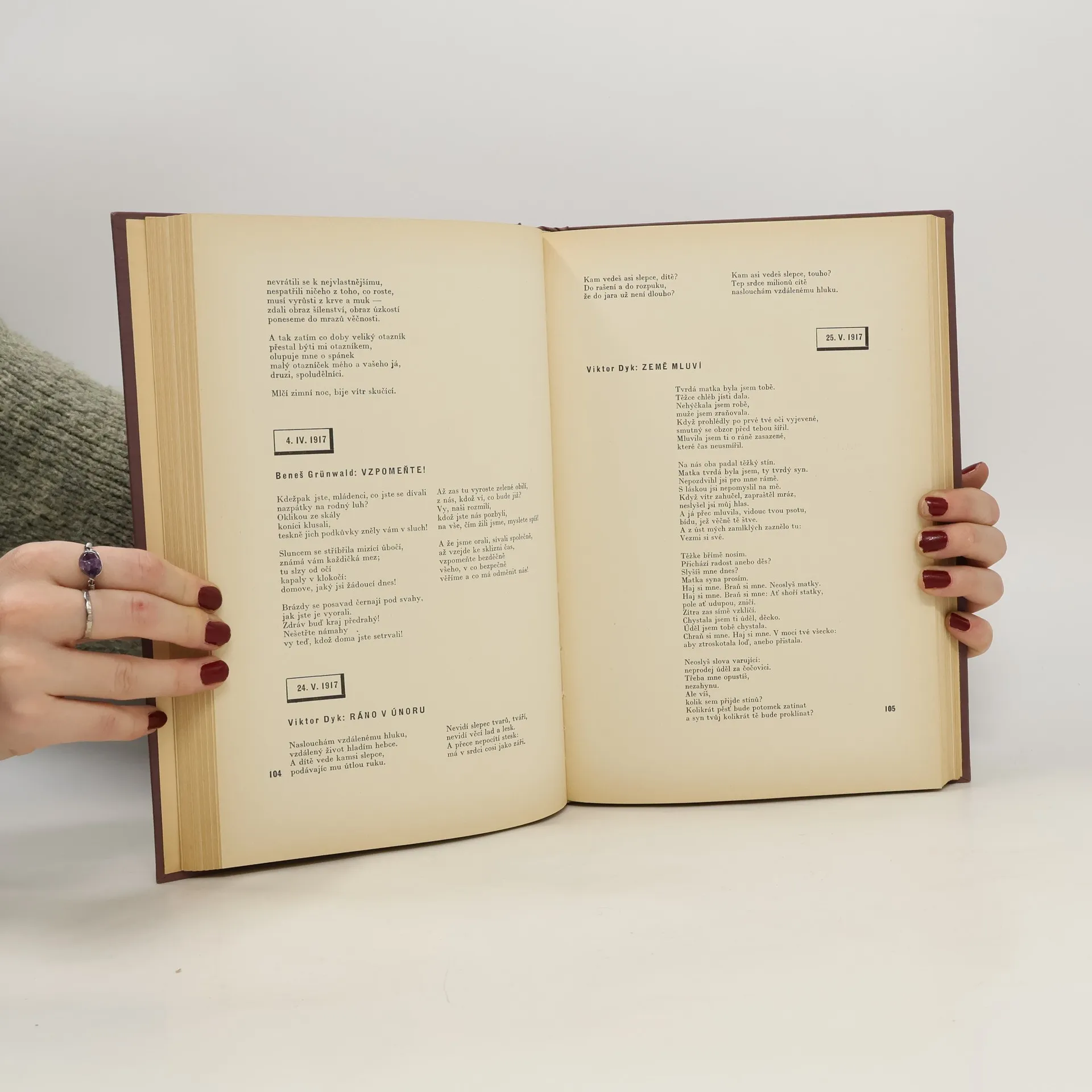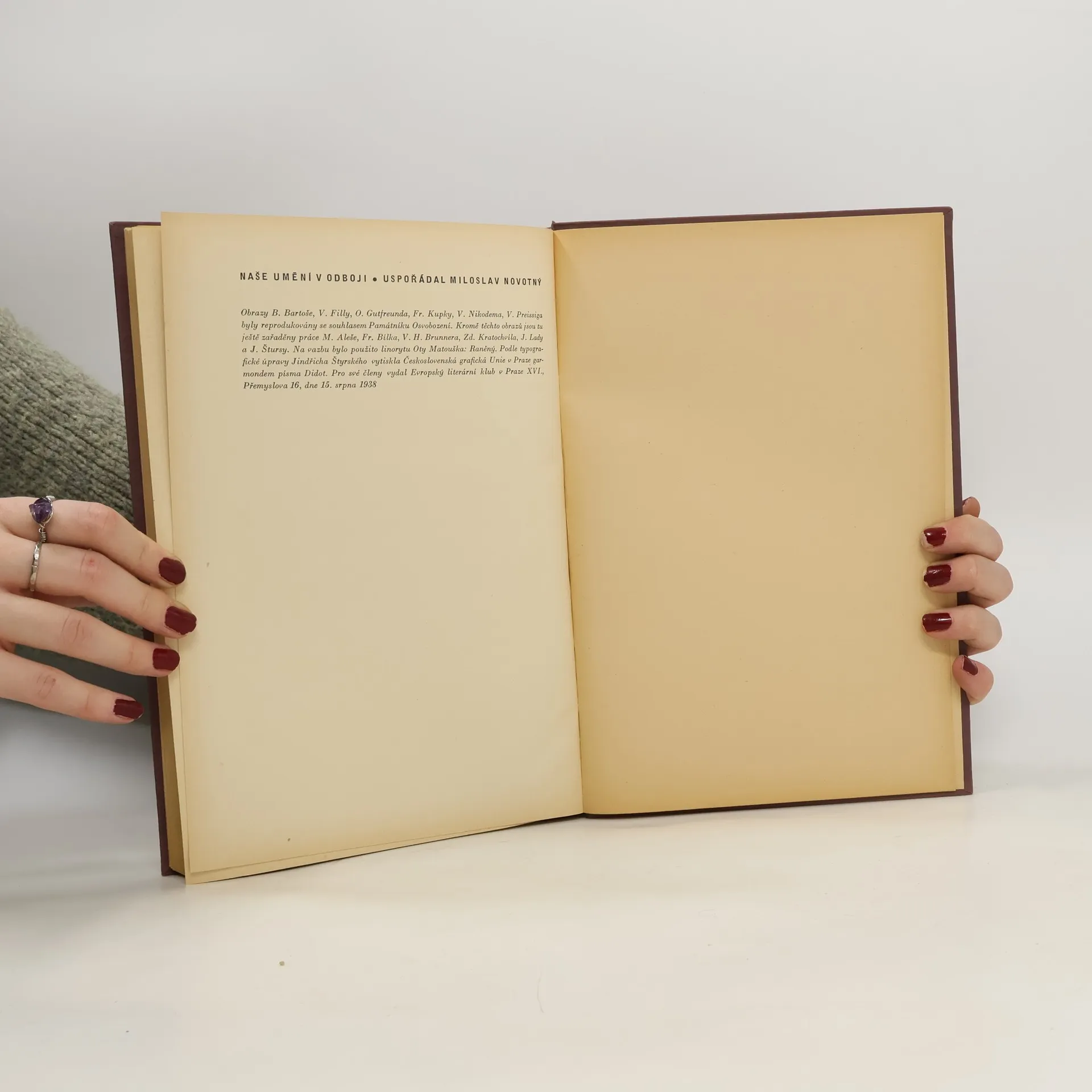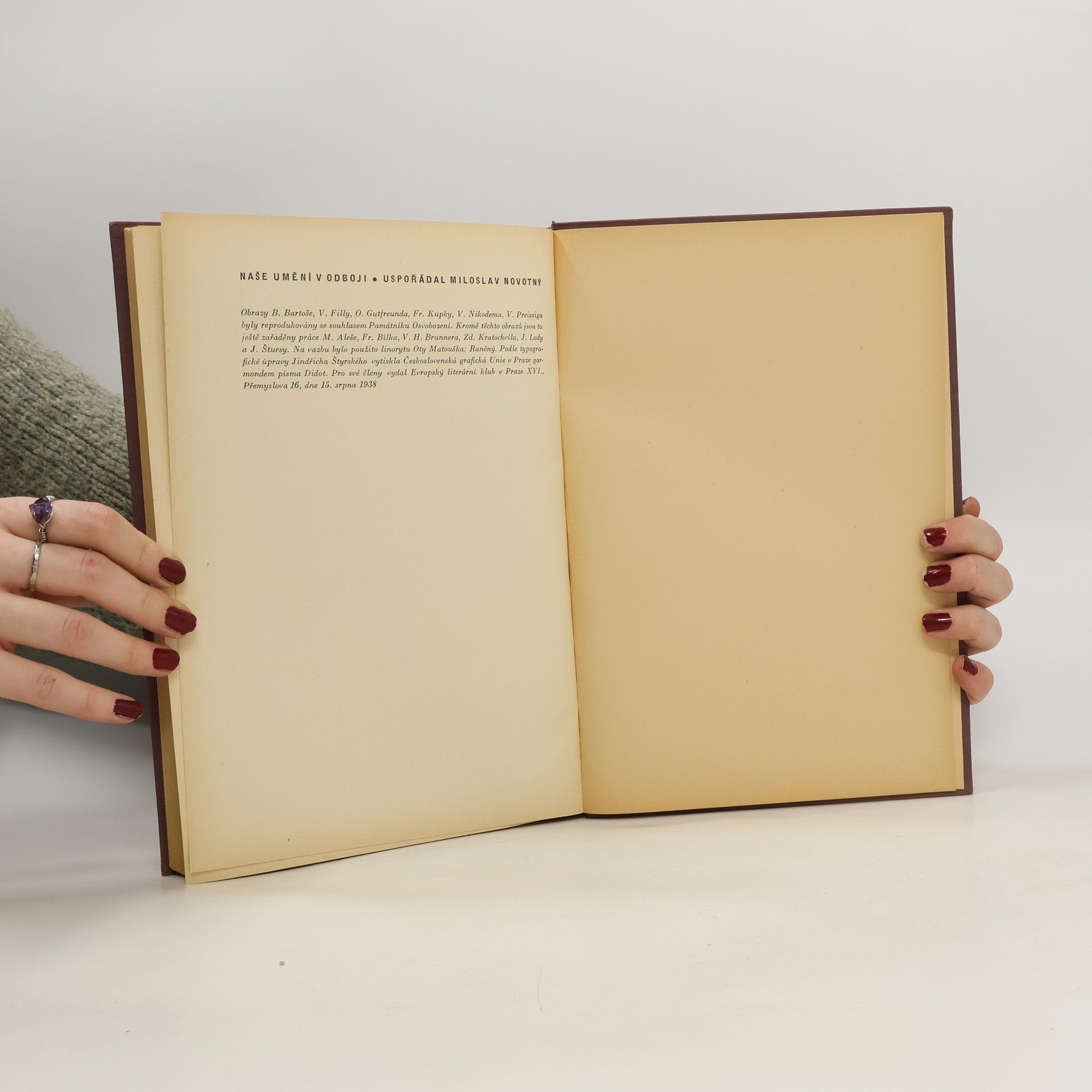 Kniha obsahuje texty velkého množství českých básníků, literátů a obrazy B. Bartoše, E. Filly, O. Gutfreunda, F. Kupky, V. Nikodema, V. Preissiga, M. Aleše, F. Bílka, V. H. Brunnera, Z. Kratochvíla, J. Lady a J. Štursy. Na vazbu bylo použito linorytu Oty Matouška: Raněný. Typo Jindřich Štýrský.