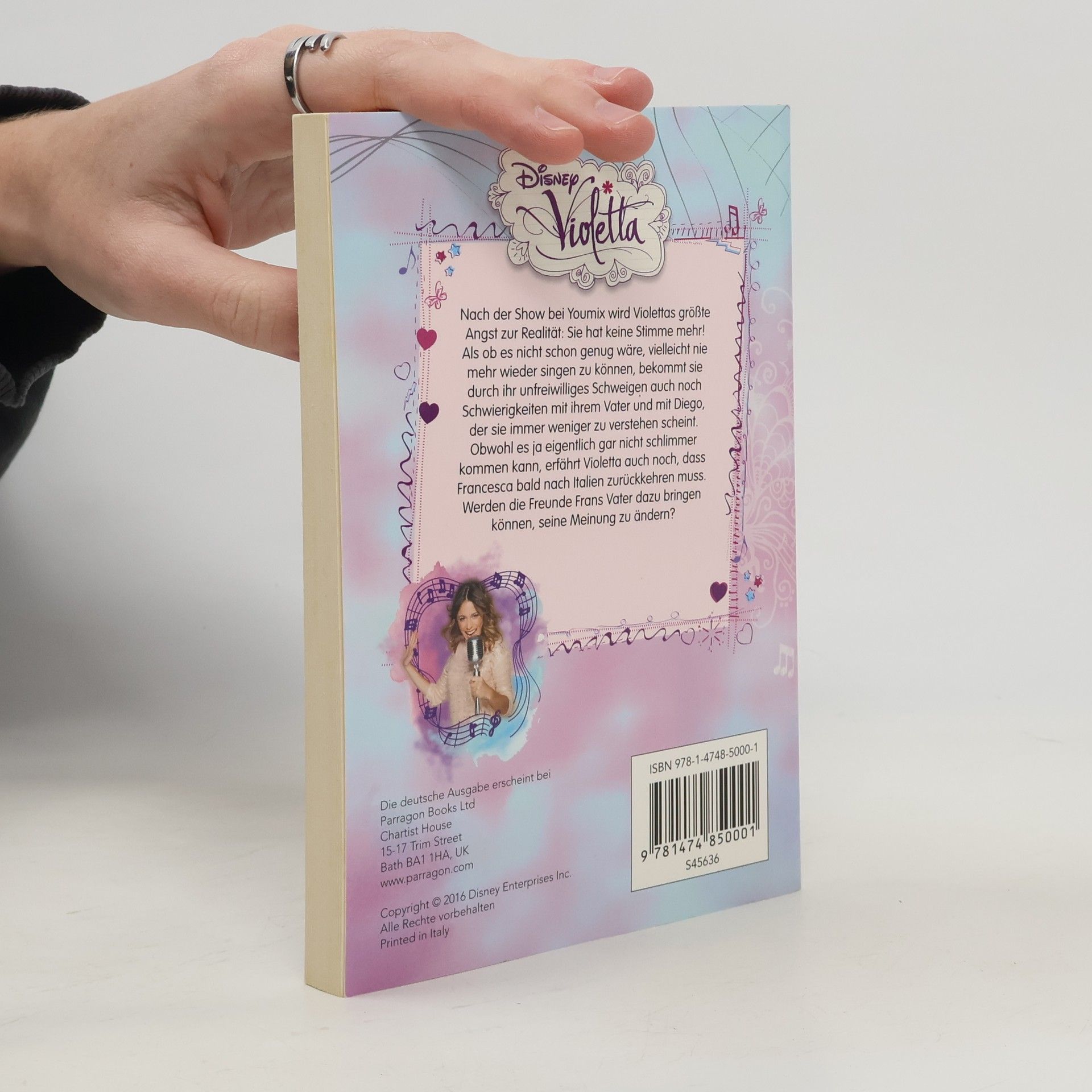 Erlebe Violettas turbulente Abenteuer jetzt auch als Buch - Die Romanreihe zur Disney-Erfolgsserie - Liebevoll und gut verständlich geschrieben - Tolle Gestaltung im Violetta-Look - Ein beliebtes Geschenk für Fans der Serie Nach einer Show bei Youmix wird Violettas größte Angst zur Realität: Sie hat keine Stimme mehr! Wird sie je wieder singen können? Zu allem Überfluss drohen auch noch Schwierigkeiten mit ihrem Vater und mit Diego, die sie immer weniger zu verstehen scheinen. Und dann erfährt Violetta auch noch, dass ihre gute Freundin Francesca bald nach Italien zurückgehen soll. Werden die Freunde Francescas Vater dazu bringen können, seine Meinung zu ändern? Gewinne neue spannende Einblicke in Violettas Welt. Begleite Violetta, Germán, León, Tomás und alle ihre Freunde in Buenos Aires bei ihren aufregenden Erlebnissen und sei hautnah dabei. Das Softcover-Buch im handlichen Format ist mit einer gut lesbaren Schrift ideal für Kinder und Jugendliche. Die Romanreihe ist ein unverzichtbarer Begleiter zur erfolgreichen Serie des Disney-Channels. Für alle V-Lover ab 8 Jahren.