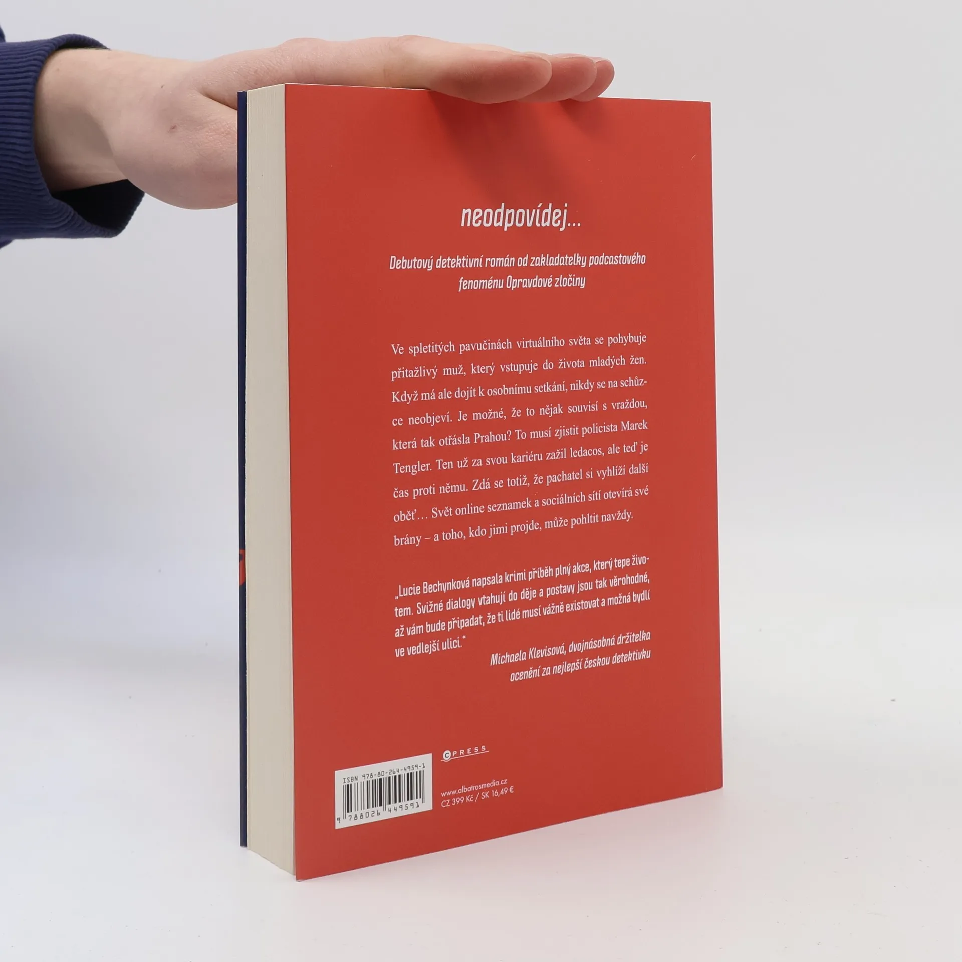 Debutový detektivní román od zakladatelky podcastového fenoménu Opravdové zločiny Ve spletitých pavučinách virtuálního světa se pohybuje přitažlivý muž, který vstupuje do života mladých žen. Když má ale dojít k osobnímu setkání, nikdy se na schůzce neobjeví. Je možné, že to nějak souvisí s vraždou, která tak otřásla Prahou? To musí zjistit policista Marek Tengler. Ten už za svou kariéru zažil ledacos, ale teď je čas proti němu. Zdá se totiž, že pachatel si vyhlíží další oběť Svět online seznamek a sociálních sítí otevírá své brány – a toho, kdo jimi projde, může pohltit navždy.