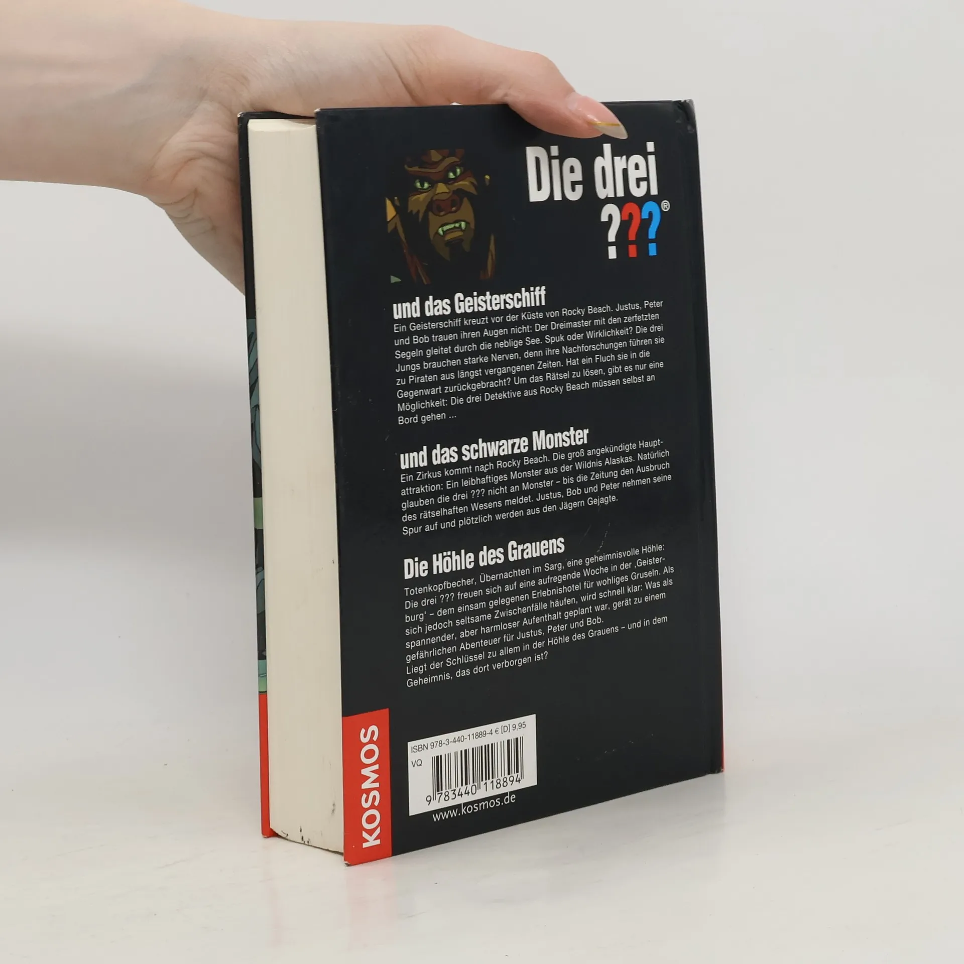 Drei spannende Fälle in einem Band! Die drei ??? und das Geisterschiff: Ein Geisterschiff kreuzt vor der Küste von Rocky Beach. Justus, Peter und Bob trauen ihren Augen nicht: Der Dreimaster mit den zerfetzten Segeln gleitet durch die neblige See. Spuk oder Wirklichkeit? Die drei Jungs brauchen starke Nerven, denn ihre Nachforschungen führen sie zu Piraten aus längst vergangenen Zeiten. Hat ein Fluch sie in die Gegenwart zurückgebracht? Um das Rätsel zu lösen, gibt es nur eine Möglichkeit: Die drei Detektive aus Rocky Beach müssen selbst an Bord gehen. Die drei ??? und das schwarze Monster: Ein Zirkus kommt nach Rocky Beach. Die groß angekündigte Hauptattraktion: Ein leibhaftiges Monster aus der Wildnis Alaskas. Natürlich glauben die drei ??? nicht an Monster - bis die Zeitung den Ausbruch des rätselhaften Wesens meldet. Justus, Bob und Peter nehmen seine Spur auf und plötzlich werden aus den Jägern Gejagte. Die drei ??? Die Höhle des Grauens: Totenkopfbecher, Übernachten im Sarg, eine geheimnisvolle Höhle: Die drei ??? freuen sich auf eine aufregende Woche in der 'Geisterburg' - dem einsam gelegenen Erlebnishotel für wohliges Gruseln. Als sich jedoch seltsame Zwischenfälle häufen, wird schnell klar: Was als spannender, aber harmloser Aufenthalt geplant war, gerät zu einem gefährlichen Abenteuer für Justus, Peter und Bob. Liegt der Schlüssel zu allem in der Höhle des Grauens - und in dem Geheimnis, das dort verborgen ist?