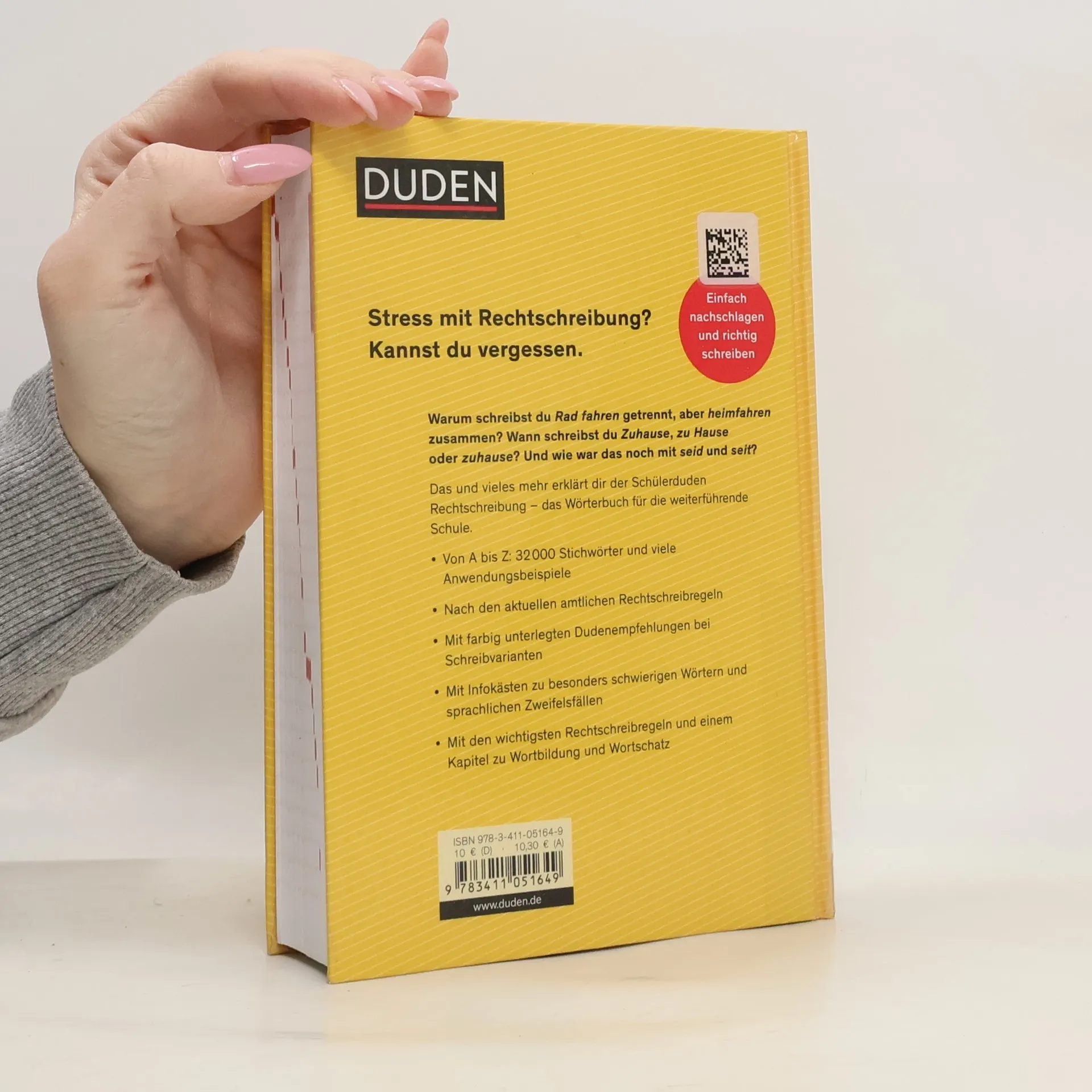 Einfach nachschlagen und richtig schreiben - mit dem Standardwörterbuch für die weiterführende Schule. - Von A bis Z: 32.000 Stichwörter, davon 800 Neuaufnahmen, u. a. aus Schul- und Unterrichtssprache; viele Anwendungsbeispiele, grammatische Angaben und Bedeutungserläuterungen - Nach den aktuellen amtlichen Rechtschreibregeln - Mit farbig unterlegten Dudenempfehlungen bei Schreibvarianten - Mit Infokästen zu besonders schwierigen Wörtern und sprachlichen Zweifelsfällen - Mit den wichtigsten Rechtschreibregeln und einem Kapitel zu den verbindlichen Lehrplanthemen Wortbildung, Wortfamilien und Wortschatz Extra: Lehrerhandreichung zum Downloaden
