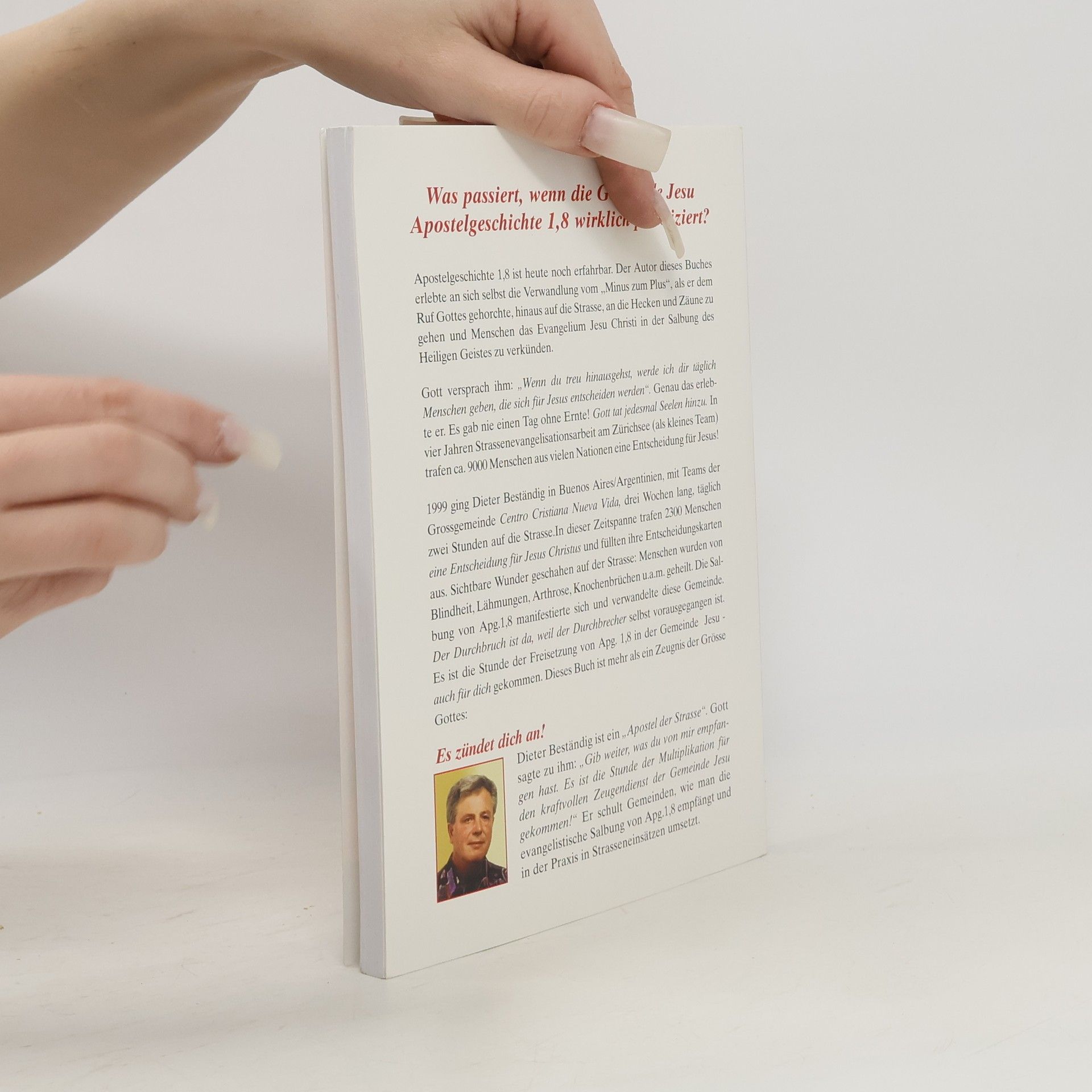 Was passiert, wenn die Gemeinde Jesu Apostelgeschichte 1,8 wirklich praktiziert? Der Autor erlebte die Verwandlung vom „Minus zum Plus“, als er dem Ruf Gottes folgte und das Evangelium Jesu Christi in der Salbung des Heiligen Geistes verkündete. Gott versprach ihm, dass er treue Menschen senden würde, die sich für Jesus entscheiden. Diese Verheißung erfüllte sich: Es gab nie einen Tag ohne Ernte, und in vier Jahren Straßen-Evangelisationsarbeit am Zürichsee trafen etwa 9000 Menschen aus verschiedenen Nationen eine Entscheidung für Jesus. 1999 ging der Autor mit Teams in Buenos Aires, wo sie täglich zwei Stunden auf die Straße gingen. In dieser Zeit trafen 2300 Menschen eine Entscheidung für Jesus Christus und erlebten sichtbare Wunder: Heilungen von Blindheit, Lähmungen und anderen Krankheiten. Die Salbung von Apostelgeschichte 1,8 manifestierte sich und verwandelte die Gemeinde. Der Durchbruch ist da, weil der Durchbrecher selbst vorausgegangen ist. Es ist die Stunde der Freisetzung von Apostelgeschichte 1,8 in der Gemeinde Jesu auch für dich. Dieses Buch ist mehr als ein Zeugnis der Größe Gottes: Es zündet dich an!