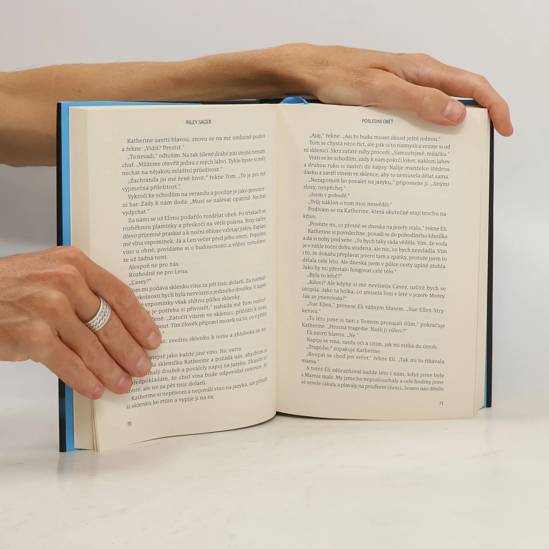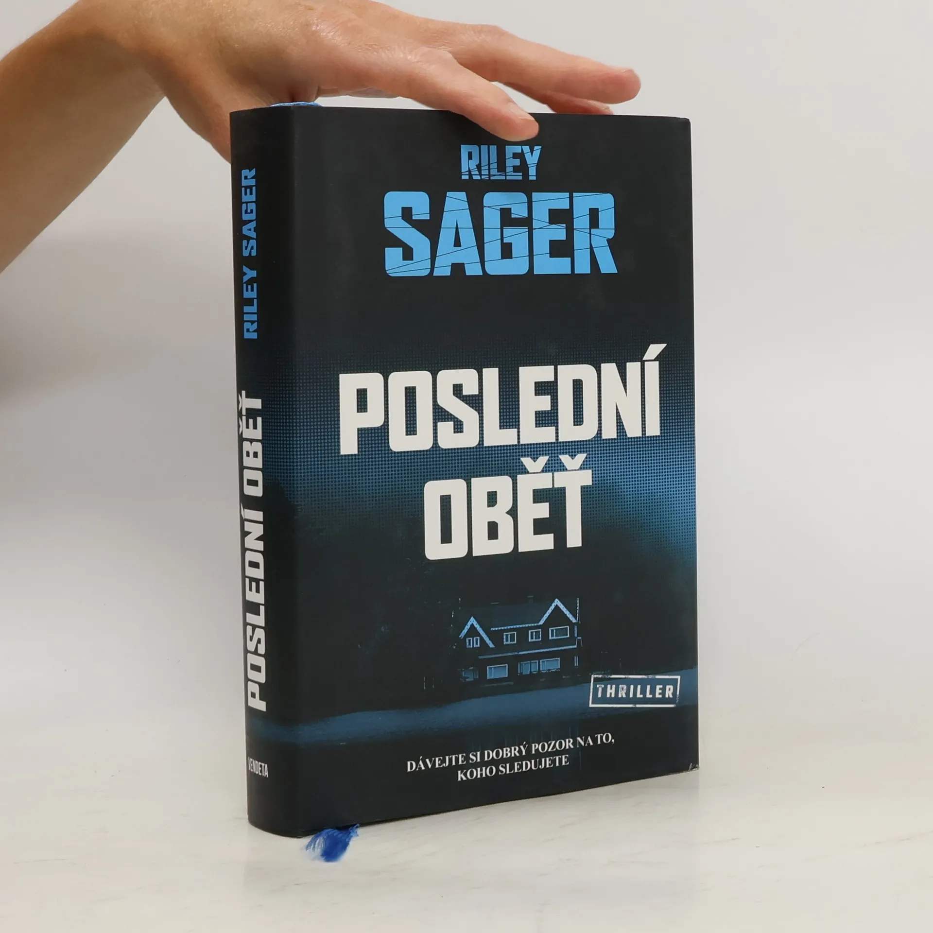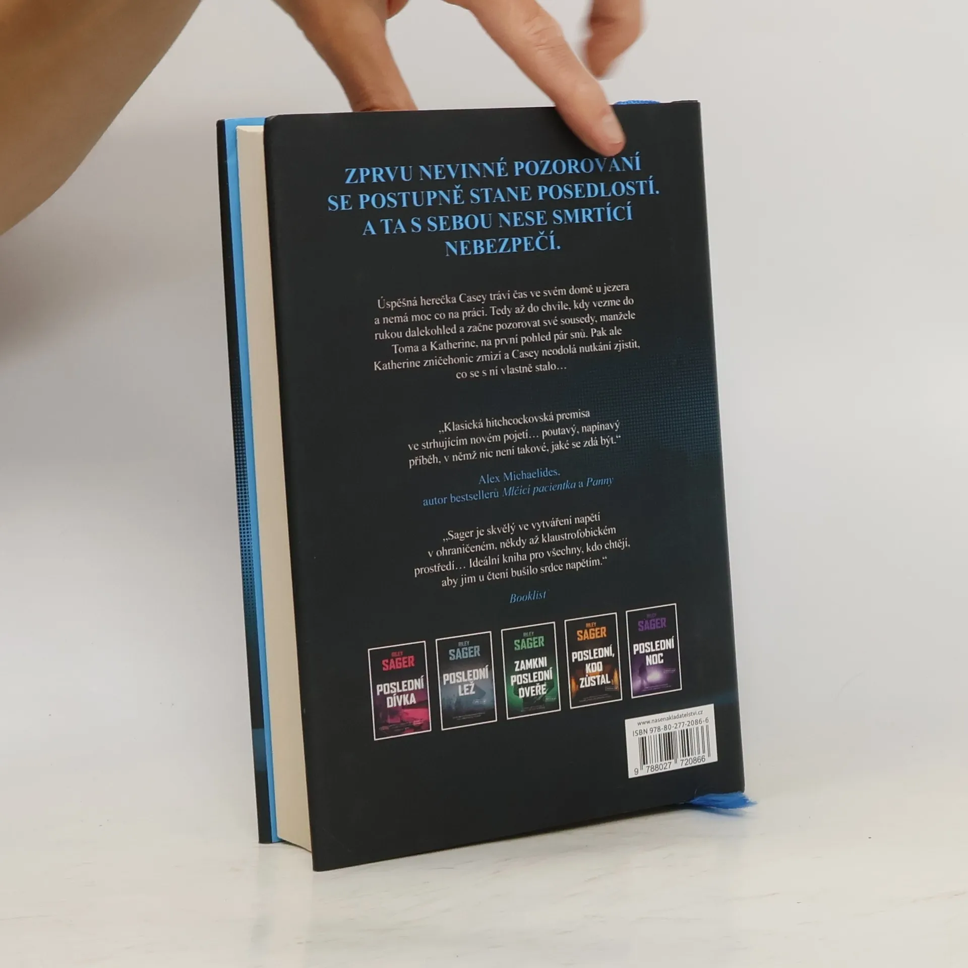 Nedávno ovdovělá herečka Casey Fletcherová se ukryla před bulvárními novináři do letního sídla u klidného jezera ve Vermontu. Vyzbrojena dalekohledem a zásobou lahví svého oblíbeného alkoholu si krátí čas pozorováním Toma a Katherine Royceových, kteří bydlí v domě na protější straně jezera. Je to nádherný pár: Tom je bohatý technologický inovátor, Katherine bývalá modelka. Jednoho dne Casey zachrání Katherine před utonutím v jezeře a vznikne mezi nimi přátelství. Čím více se však poznávají a čím déle Casey sousedy sleduje, tím je jasnější, že manželství Katherine a Toma není zdaleka tak dokonalé a klidné, jak by se mohlo zdát. Když Katherine náhle zmizí, Casey se pokouší zjistit, co se s ní stalo. Odhaluje přitom děsivé a temné pravdy, v jejichž světle se příběh o voyeurismu a podezírání mění v příběh o vině, posedlosti a o tom, jak moc může zdání klamat. Riley Sager ve své nové knize Poslední oběť namíchal typickou směsici výrazných postav, psychologického napětí a překvapivých zvratů, nad nimiž budou čtenáři žasnout až do poslední stránky.