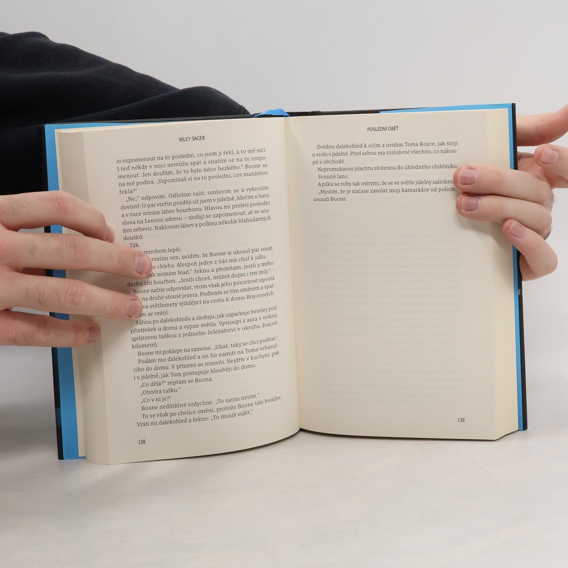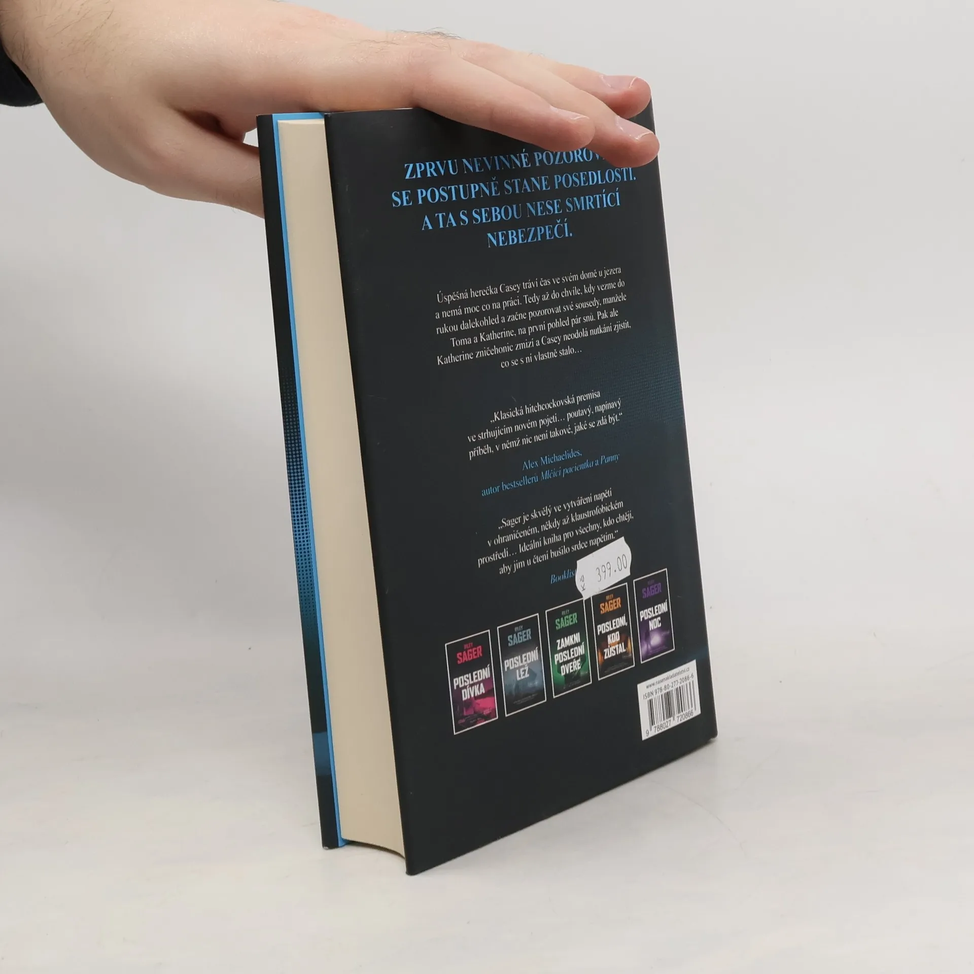 Nedávno ovdovělá herečka Casey Fletcherová se ukryla před bulvárními novináři do letního sídla u klidného jezera ve Vermontu. Vyzbrojena dalekohledem a zásobou lahví svého oblíbeného alkoholu si krátí čas pozorováním Toma a Katherine Royceových, kteří bydlí v domě na protější straně jezera. Je to nádherný pár: Tom je bohatý technologický inovátor, Katherine bývalá modelka. Jednoho dne Casey zachrání Katherine před utonutím v jezeře a vznikne mezi nimi přátelství. Čím více se však poznávají a čím déle Casey sousedy sleduje, tím je jasnější, že manželství Katherine a Toma není zdaleka tak dokonalé a klidné, jak by se mohlo zdát. Když Katherine náhle zmizí, Casey se pokouší zjistit, co se s ní stalo. Odhaluje přitom děsivé a temné pravdy, v jejichž světle se příběh o voyeurismu a podezírání mění v příběh o vině, posedlosti a o tom, jak moc může zdání klamat. Riley Sager ve své nové knize Poslední oběť namíchal typickou směsici výrazných postav, psychologického napětí a překvapivých zvratů, nad nimiž budou čtenáři žasnout až do poslední stránky.