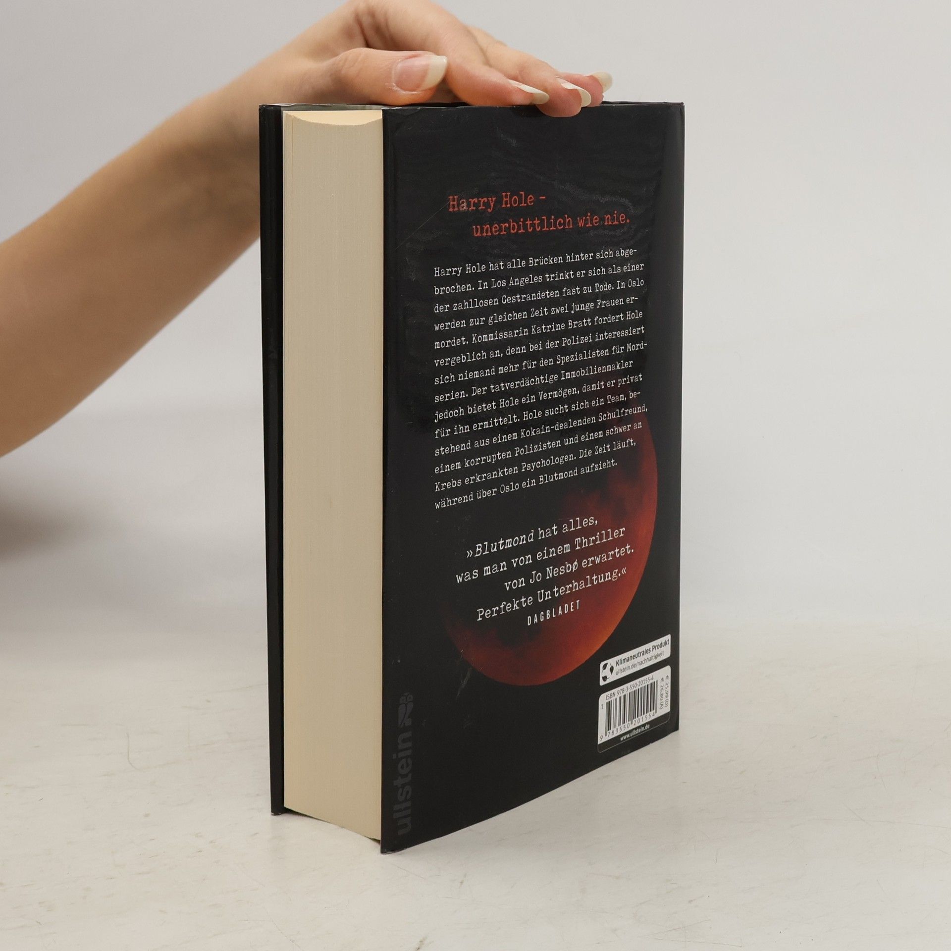 Harry Hole – unerbittlich wie nie. Harry Hole hat alle Brücken hinter sich abgebrochen. In Los Angeles trinkt er sich als einer der zahllosen Gestrandeten fast zu Tode. In Oslo werden zur selben Zeit zwei junge Frauen ermordet. Kommissarin Katrine Bratt fordert Harry Hole vergeblich an, denn bei der Polizei interessiert sich niemand mehr für den Spezialisten für Mordserien. Der tatverdächtige Immobilienmakler jedoch bietet Hole ein Vermögen, damit er privat für ihn ermittelt. Hole sucht sich ein Team, bestehend aus einem Kokain-dealenden Schulfreund, einem korrupten Polizisten und einem schwer an Krebs erkrankten Psychologen. Die Zeit läuft, während über Oslo ein Blutmond aufzieht. Der neue Bestseller aus Skandinavien, der Sie zum Schaudern bringt.
