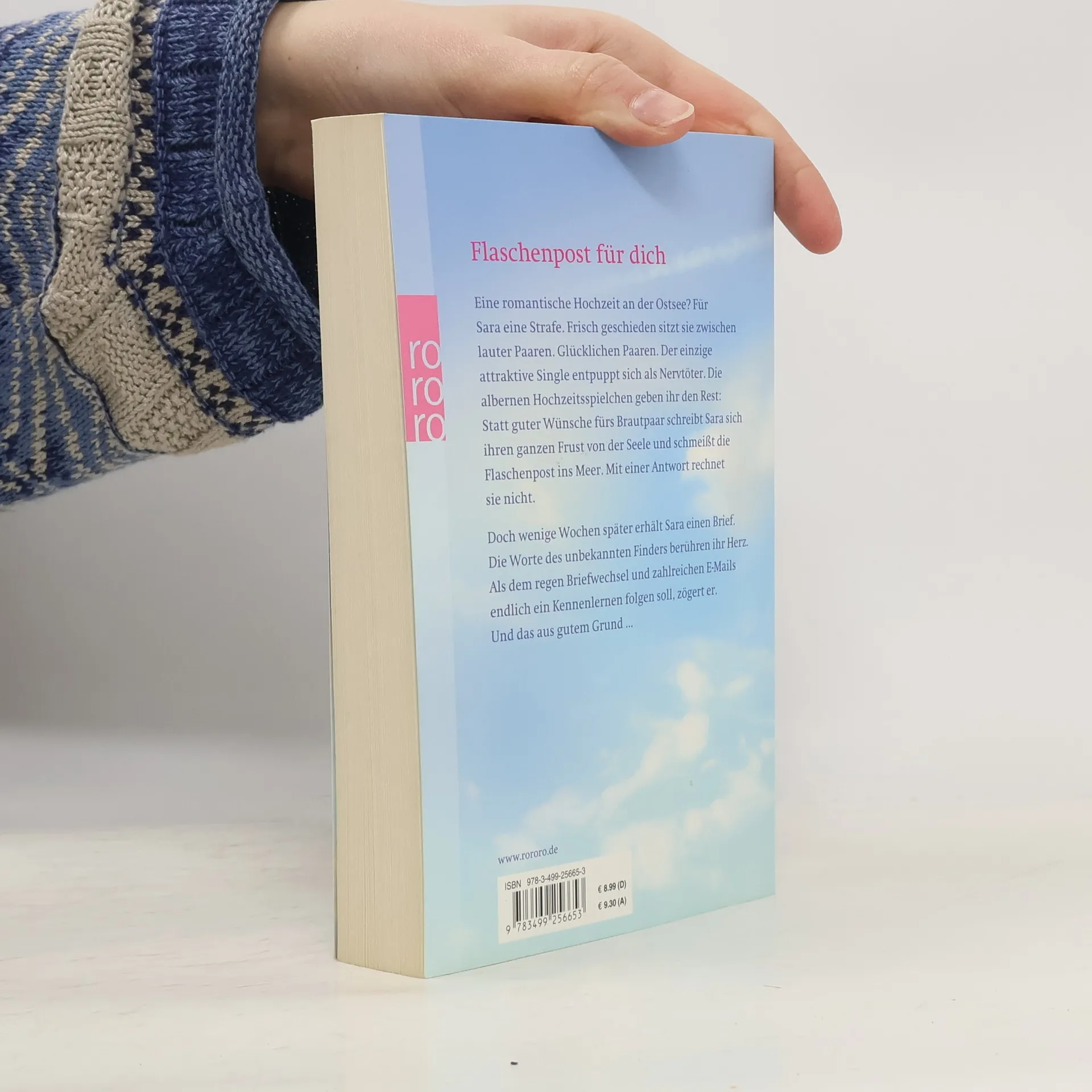 Flaschenpost für dich. Eine romantische Hochzeit an der Ostsee? Für Sara eine Strafe. Frisch geschieden sitzt sie zwischen lauter Paaren. Glücklichen Paaren. Der einzige attraktive Single entpuppt sich als Nervtöter. Die albernen Hochzeitsspielchen geben ihr den Rest: Statt guter Wünsche fürs Brautpaar schreibt Sara sich ihren ganzen Frust von der Seele und schmeißt die Flaschenpost ins Meer. Mit einer Antwort rechnet sie nicht. Doch wenige Wochen später erhält Sara einen Brief. Die Worte des unbekannten Finders berühren ihr Herz. Als dem regen Briefwechsel und zahlreichen E-Mails endlich ein Kennenlernen folgen soll, zögert er. Und das aus gutem Grund …