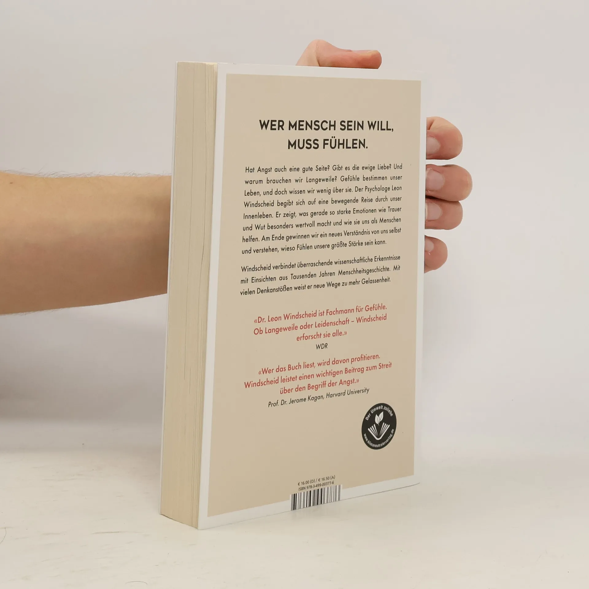 Wer Mensch sein will, muss fühlen. Der Psychologe Leon Windscheid begibt sich auf eine bewegende Reise durch unser Innenleben. Gefühle bestimmen unser Leben, und doch wissen wir wenig über sie. Windscheid geht den Fragen nach, ob Angst auch eine gute Seite hat, ob es die ewige Liebe gibt, und wofür wir eigentlich Langeweile brauchen? Er zeigt, was gerade so starke Emotionen wie Trauer und Wut besonders wertvoll macht und wie sie uns als Menschen helfen. Am Ende gewinnen wir ein neues Verständnis von uns selbst und verstehen, wieso Fühlen unsere größte Stärke sein kann. Windscheid verbindet überraschende wissenschaftliche Erkenntnisse mit Einsichten aus Tausenden Jahren Menschheitsgeschichte. Mit vielen Denkanstößen weist er neue Wege zu mehr Gelassenheit. «Dr. Leon Windscheid ist Fachmann für Gefühle. Ob Langeweile oder Leidenschaft – Windscheid erforscht sie alle.» WDR «Wer das Buch liest, wird davon profitieren. Windscheid leistet einen wichtigen Beitrag zum Streit über den Begriff der Angst.» Prof. Dr. Jerome Kagan, Harvard University