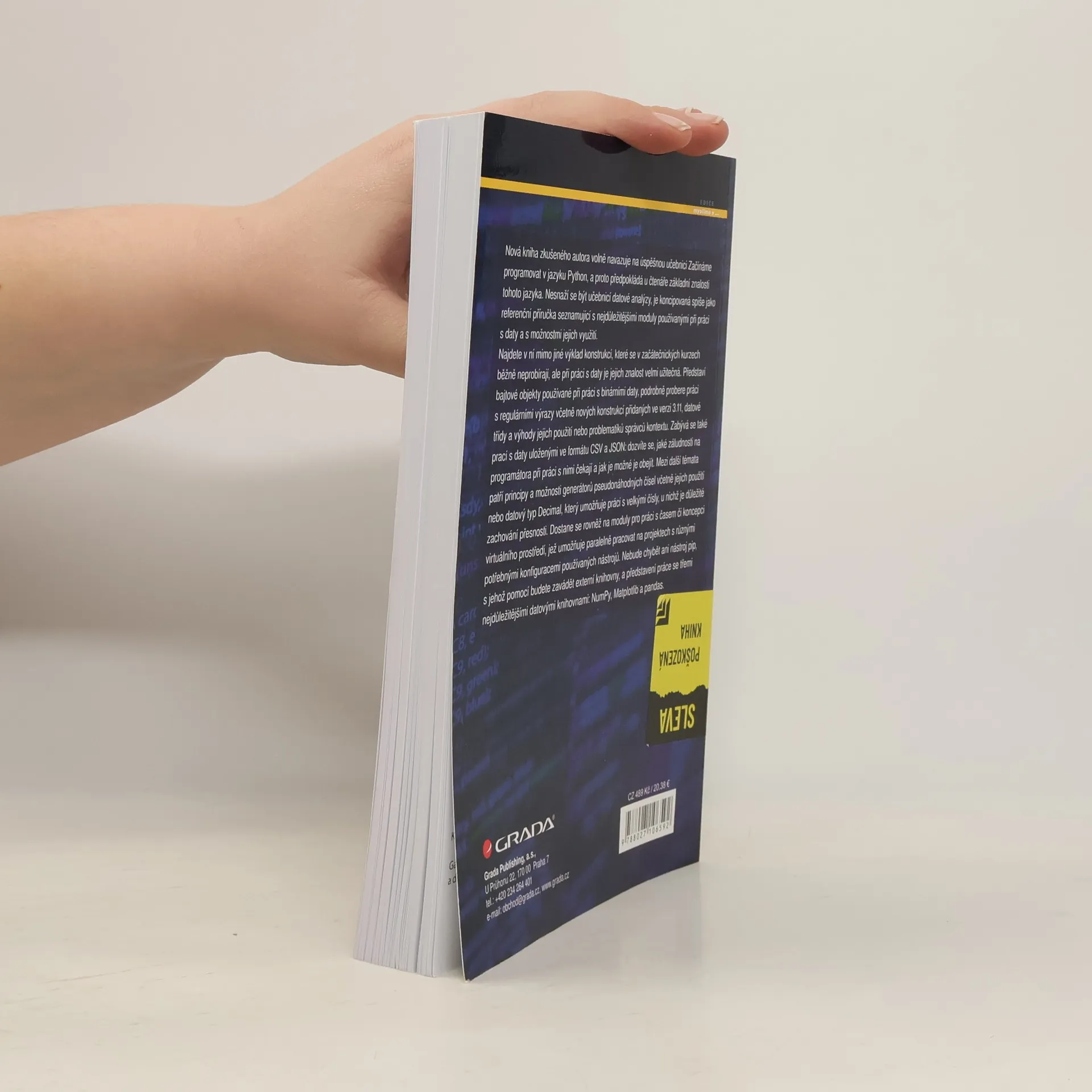 Nová kniha zkušeného autora volně navazuje na úspěšnou učebnici Začínáme programovat v jazyku Python, a proto předpokládá u čtenáře základní znalosti tohoto jazyka. Nesnaží se být učebnicí datové analýzy, je koncipovaná spíše jako referenční příručka seznamující s nejdůležitějšími moduly používanými při práci s daty a s možnostmi jejich využití. Najdete v ní mimo jiné výklad konstrukcí, které se v začátečnických kurzech běžně neprobírají, ale při práci s daty je jejich znalost velmi užitečná. Představí bajtové objekty používané při práci s binárními daty, podrobně probere práci s regulárními výrazy včetně nových konstrukcí přidaných ve verzi 3.11, datové třídy a výhody jejich použití nebo problematiků správců kontextu. Zabývá se také prací s daty uloženými ve formátu CSV a JSON: dozvíte se, jaké záludnosti na programátora při práci s nimi čekají a jak je možné je obejít. Mezi další témata patří principy a možnosti generátorů pseudonáhodných čísel včetně jejich použití nebo datový typ Decimal, který umožňuje práci s velkými čísly, u nichž je důležité zachování přesnosti. Dostane se rovněž na moduly pro práci s časem či koncepci virtuálního prostředí, jež umožňuje paralelně pracovat na projektech s různými potřebnými konfiguracemi používaných nástrojů. Nebude chybět ani nástroj pip, s jehož pomocí budete zavádět externí knihovny, a představení práce se třemi nejdůležitějšími datovými knihovnami: NumPy, Matplotlib a pandas.