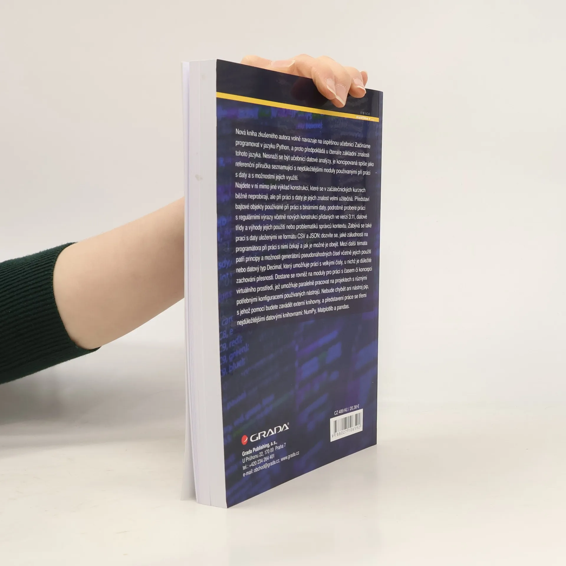 Nová kniha zkušeného autora volně navazuje na úspěšnou učebnici Začínáme programovat v jazyku Python, a proto předpokládá u čtenáře základní znalosti tohoto jazyka. Nesnaží se být učebnicí datové analýzy, je koncipovaná spíše jako referenční příručka seznamující s nejdůležitějšími moduly používanými při práci s daty a s možnostmi jejich využití. Najdete v ní mimo jiné výklad konstrukcí, které se v začátečnických kurzech běžně neprobírají, ale při práci s daty je jejich znalost velmi užitečná. Představí bajtové objekty používané při práci s binárními daty, podrobně probere práci s regulárními výrazy včetně nových konstrukcí přidaných ve verzi 3.11, datové třídy a výhody jejich použití nebo problematiků správců kontextu. Zabývá se také prací s daty uloženými ve formátu CSV a JSON: dozvíte se, jaké záludnosti na programátora při práci s nimi čekají a jak je možné je obejít. Mezi další témata patří principy a možnosti generátorů pseudonáhodných čísel včetně jejich použití nebo datový typ Decimal, který umožňuje práci s velkými čísly, u nichž je důležité zachování přesnosti. Dostane se rovněž na moduly pro práci s časem či koncepci virtuálního prostředí, jež umožňuje paralelně pracovat na projektech s různými potřebnými konfiguracemi používaných nástrojů. Nebude chybět ani nástroj pip, s jehož pomocí budete zavádět externí knihovny, a představení práce se třemi nejdůležitějšími datovými knihovnami: NumPy, Matplotlib a pandas.