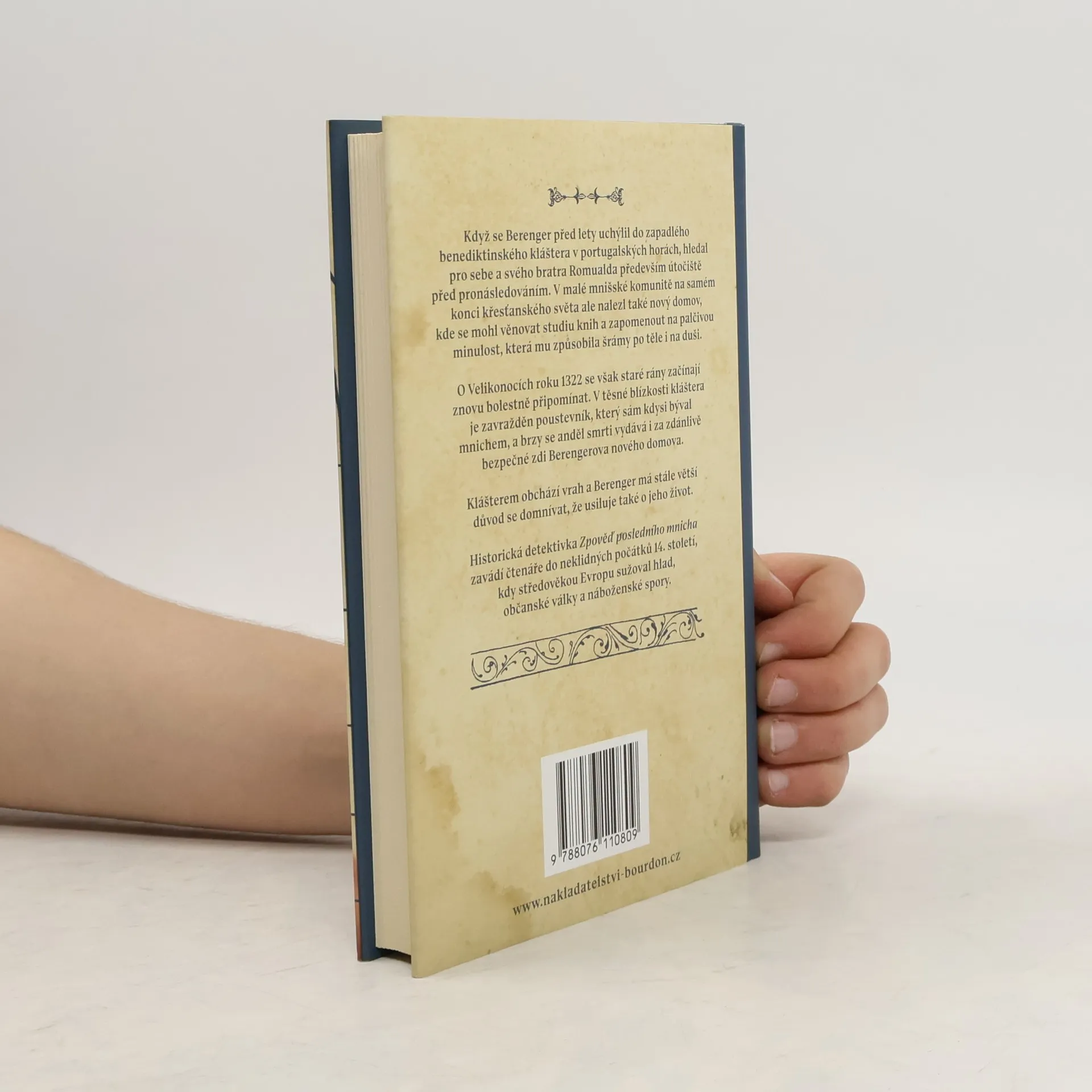 Když se Berenger před lety uchýlil do zapadlého benediktinského kláštera v portugalských horách, hledal pro sebe a svého bratra Romualda především útočiště před pronásledováním. V malé mnišské komunitě na samém konci křesťanského světa ale nalezl také nový domov, kde se mohl věnovat studiu knih a zapomenout na palčivou minulost, která mu způsobila šrámy po těle i na duši.O Velikonocích roku 1322 se však staré rány začínají znovu bolestně připomínat. V těsné blízkosti kláštera je zavražděn poustevník, který sám kdysi býval mnichem, a brzy se anděl smrti vydává i za zdánlivě bezpečné zdi Berengerova nového domova.Klášterem obchází vrah a Berenger má stále větší důvod se domnívat, že usiluje také o jeho život.Historická detektivka Zpověď posledního mnicha zavádí čtenáře do neklidných počátků 14. století, kdy středověkou Evropu sužoval hlad, občanské války a náboženské spory.