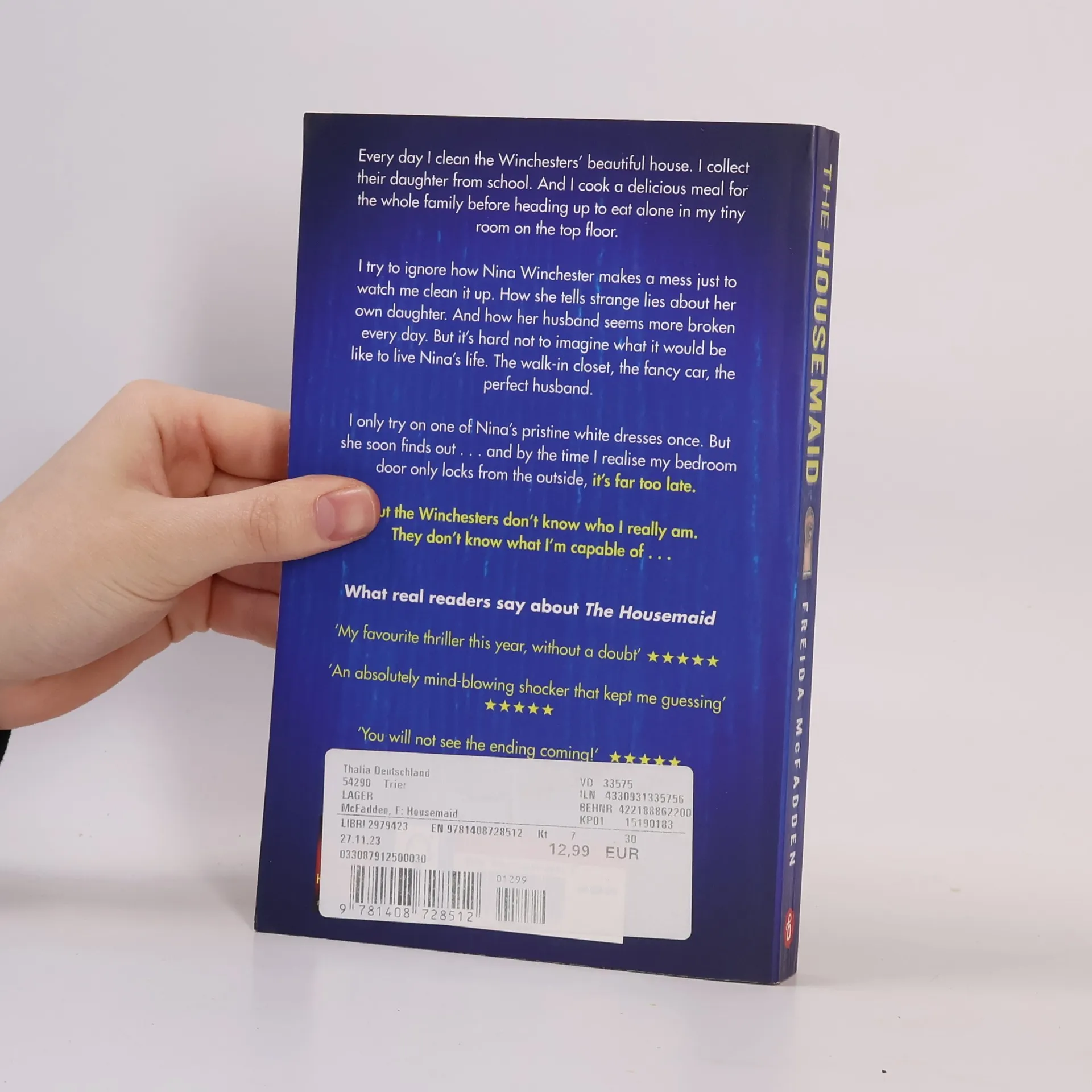"Welcome to the family," Nina Winchester says as I shake her elegant, manicured hand. I smile politely, gazing around the marble hallway. Working here is my last chance to start fresh. I can pretend to be whoever I like. But I'll soon learn that the Winchesters' secrets are far more dangerous than my own . . .Every day I clean the Winchesters' beautiful house top to bottom. I collect their daughter from school. And I cook a delicious meal for the whole family before heading up to eat alone in my tiny room on the top floor. I try to ignore how Nina makes a mess just to watch me clean it up. How she tells strange lies about her own daughter. And how her husband Andrew seems more broken every day. But as I look into Andrew's handsome brown eyes, so full of pain, it's hard not to imagine what it would be like to live Nina's life. The walk-in closet, the fancy car, the perfect husband. I only try on one of Nina's pristine white dresses once. Just to see what it's like. But she soon finds out... and by the time I realize my attic bedroom door only locks from the outside, it's far too late. But I reassure myself: the Winchesters don't know who I really am. They don't know what I'm capable of . . .