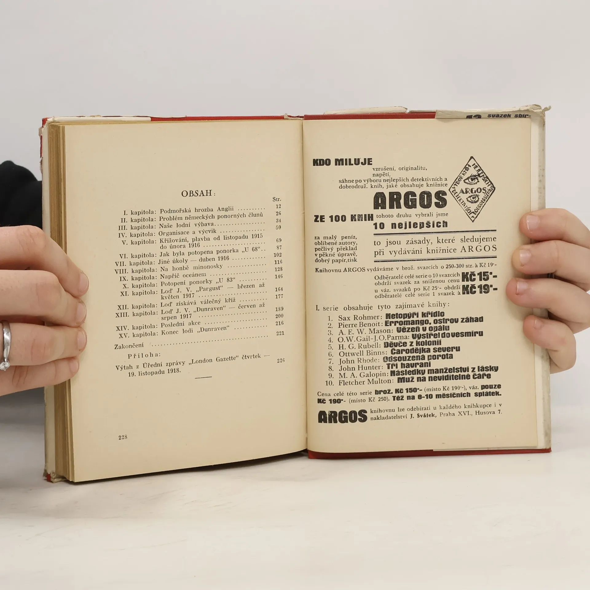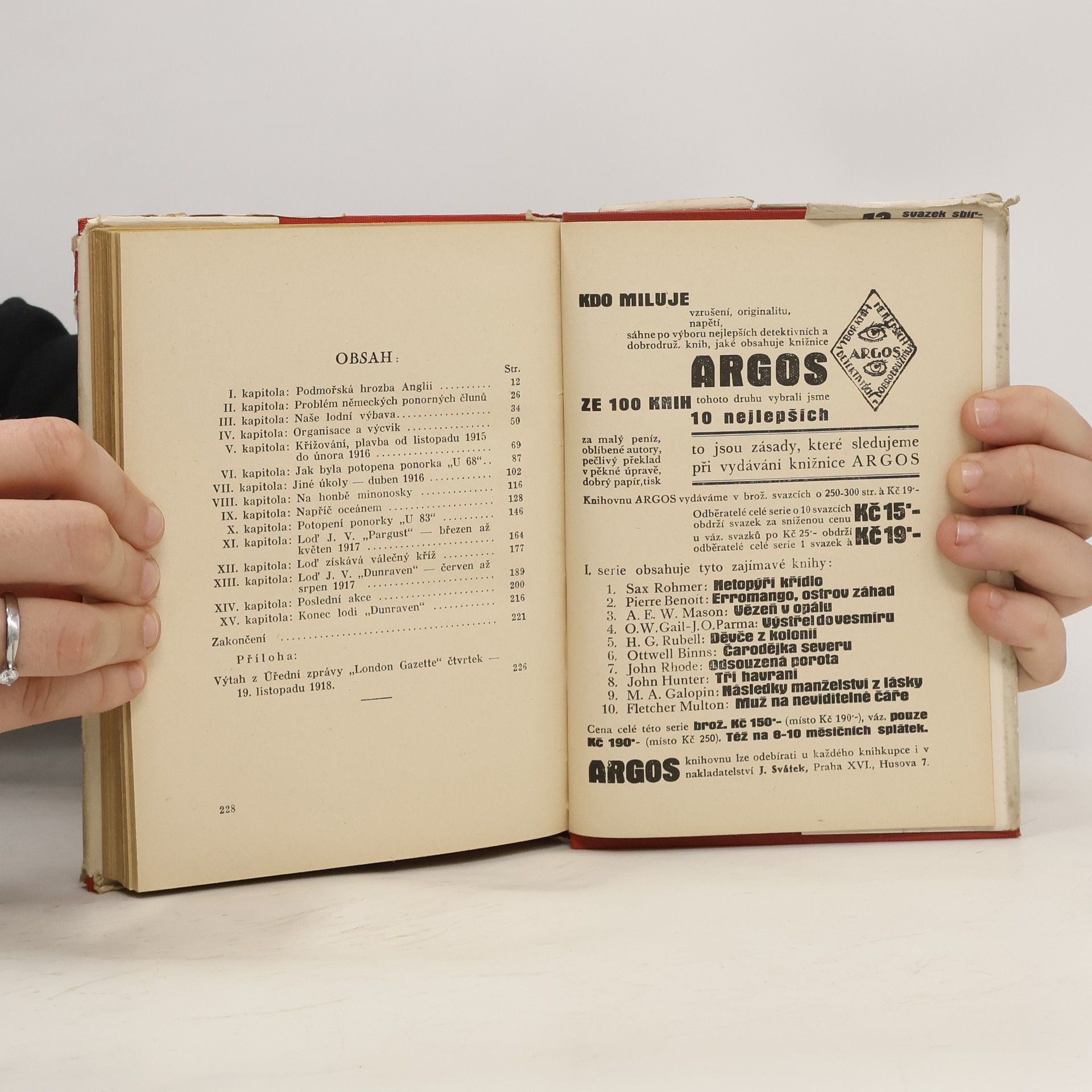 Admirál píše svoje vzpomínky z námořních bojů v I. svět. válce jako velitel lapačů německých ponorek. S předmluvou admirála Sira Lewise Baylyho.