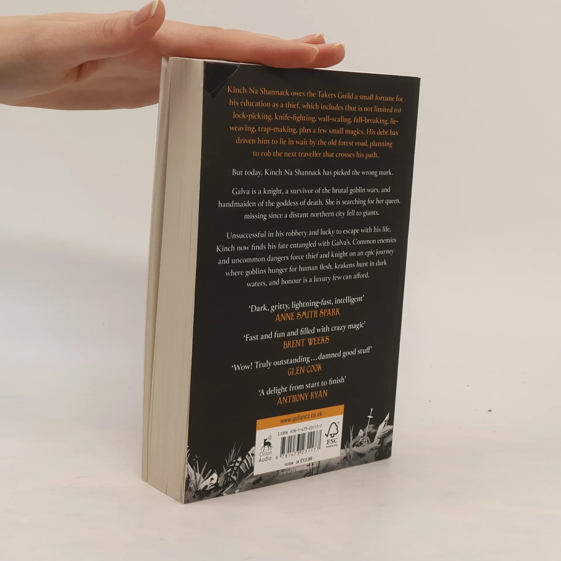 Kinch Na Shannack owes the Takers Guild a small fortune for his education as a thief, which includes (but is not limited to) lock-picking, knife-fighting, wall-scaling, fall-breaking, lie-weaving, trap-making, plus a few small magics. His debt has driven him to lie in wait by the old forest road, planning to rob the next traveler that crosses his path. But today, Kinch Na Shannack has picked the wrong mark. Galva is a knight, a survivor of the brutal goblin wars, and handmaiden of the goddess of death. She is searching for her queen, missing since a distant northern city fell to giants. Unsuccessful in his robbery and lucky to escape with his life, Kinch now finds his fate entangled with Galva's. Common enemies and uncommon dangers force thief and knight on an epic journey where goblins hunger for human flesh, krakens hunt in dark waters, and honor is a luxury few can afford.