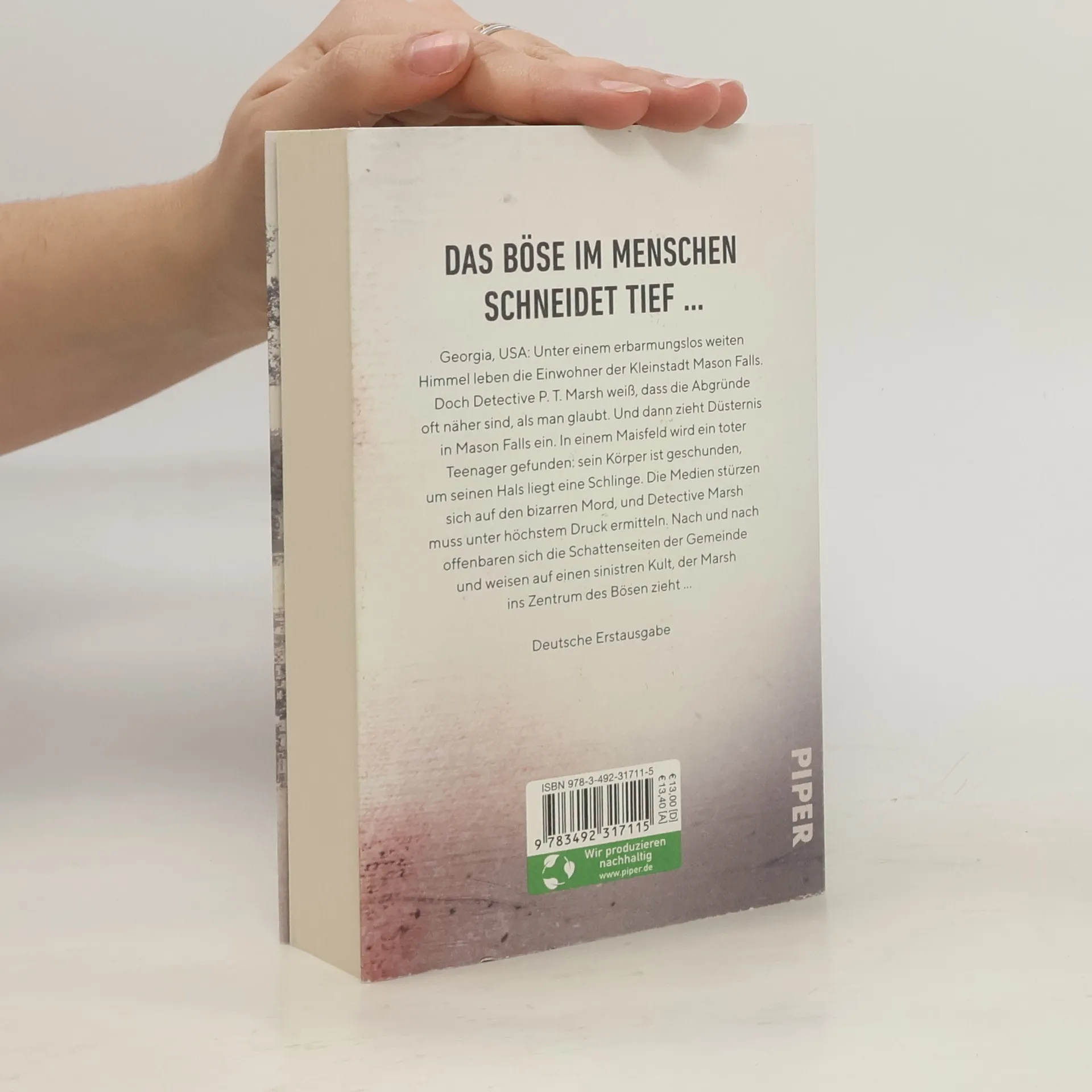 Das Böse im Menschen schneidet tief ... Georgia, USA: Unter einem erbarmungslos weiten Himmel leben die Einwohner der Kleinstadt Mason Falls. Doch Detective P. T. Marsh weiß, dass die Abgründe oft näher sind, als man glaubt. Und dann zieht Düsternis in Mason Falls ein. In einem Maisfeld wird ein toter Teenager gefunden: sein Körper ist geschunden, um seinen Hals liegt eine Schlinge. Die Medien stürzen sich auf den bizarren Mord, und Detective Marsh muss unter höchstem Druck ermitteln. Nach und nach offenbaren sich die Schattenseiten der Gemeinde und führen zu einem sinistren Kult, der Marsh ins Zentrum des Bösen zieht … Für LeserInnen von Don Winslow und Fans von »True Detective«
