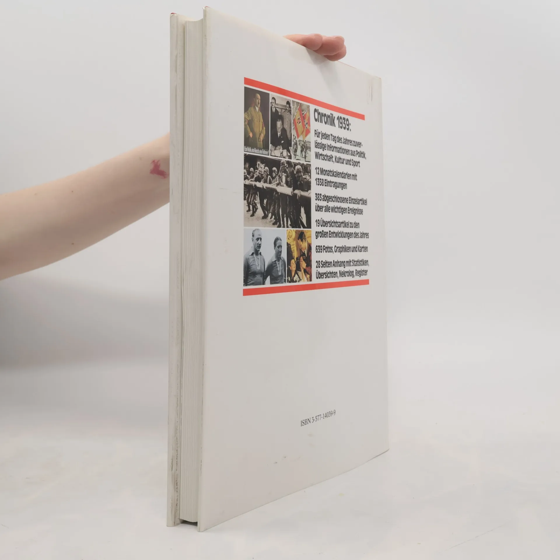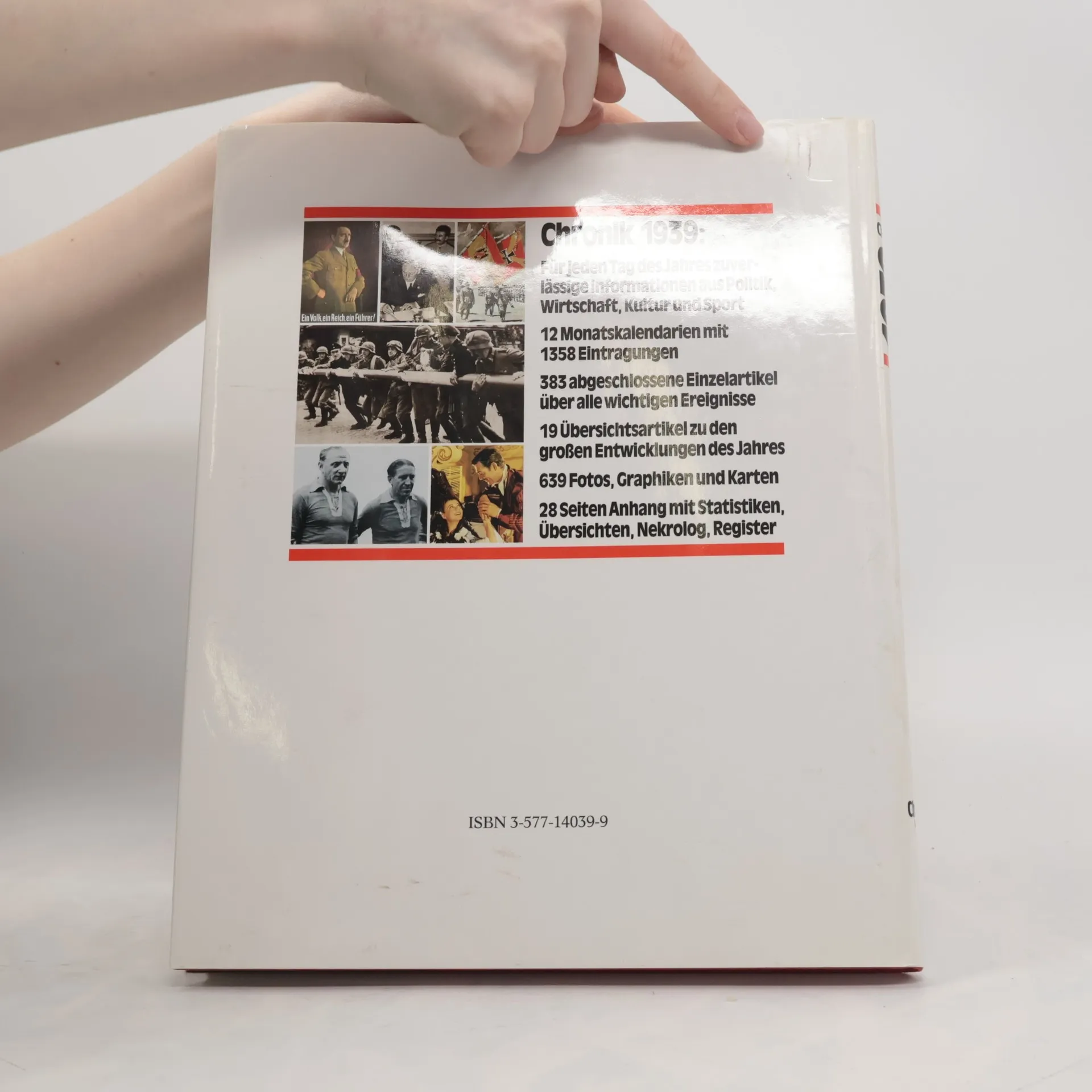 Die "Chronik 1939" unfasst 12 Monatskalendarien mit 1358 Eintragungen und 383 abgeschlossene Einzelartikel über alle wichtigen Ereignisse. Illustriert wird der Band mit 639 Fotos, Graphiken und Karten. Nützlich sind auch die 28 Seiten Anhang mit Statistiken, Übersichten, Nekrolog und Register.§Die "Chronik 1939" enthält für jeden Tag des Jahres zuverlässige Informationen aus Politik, Wirtschaft, Kultur und Sport.§
