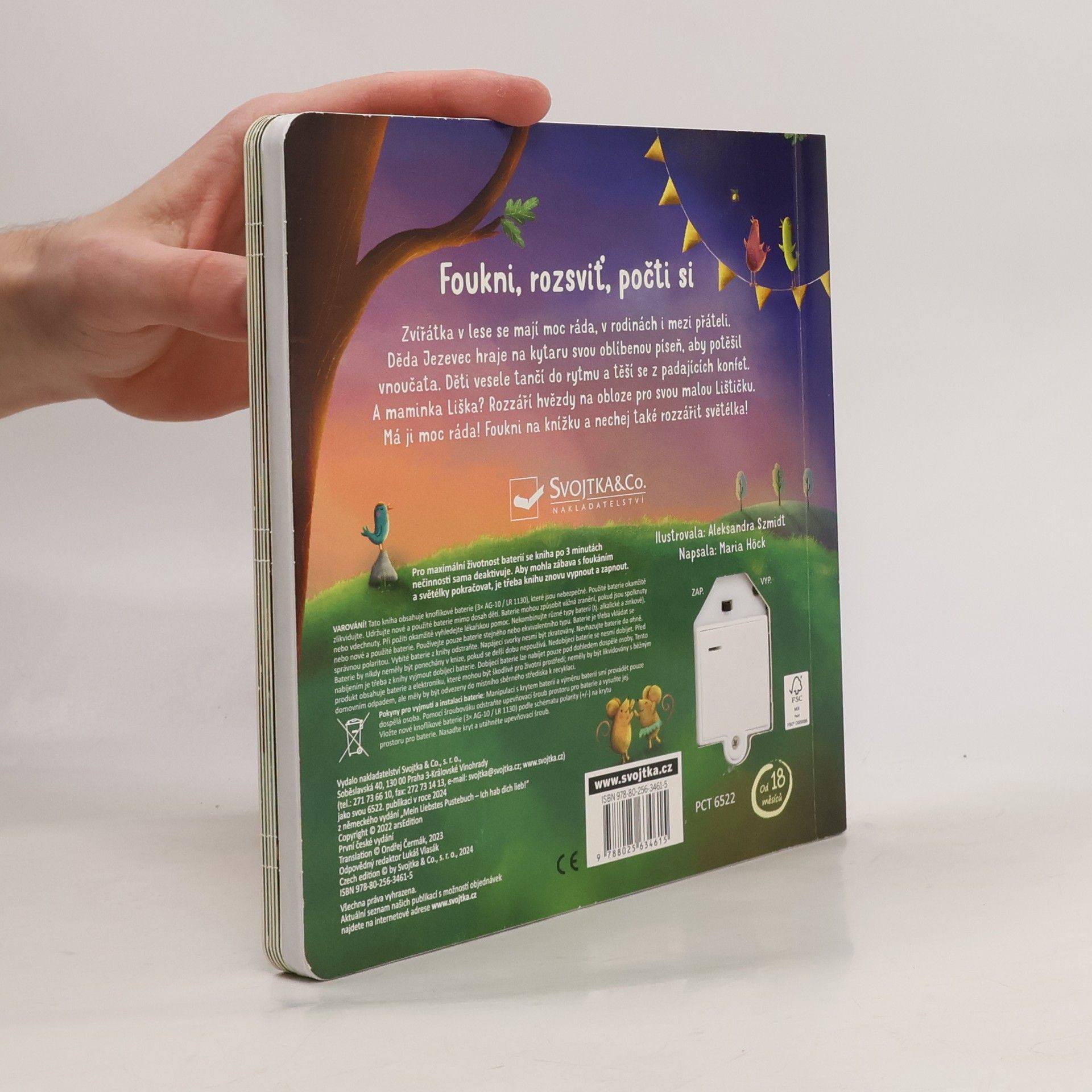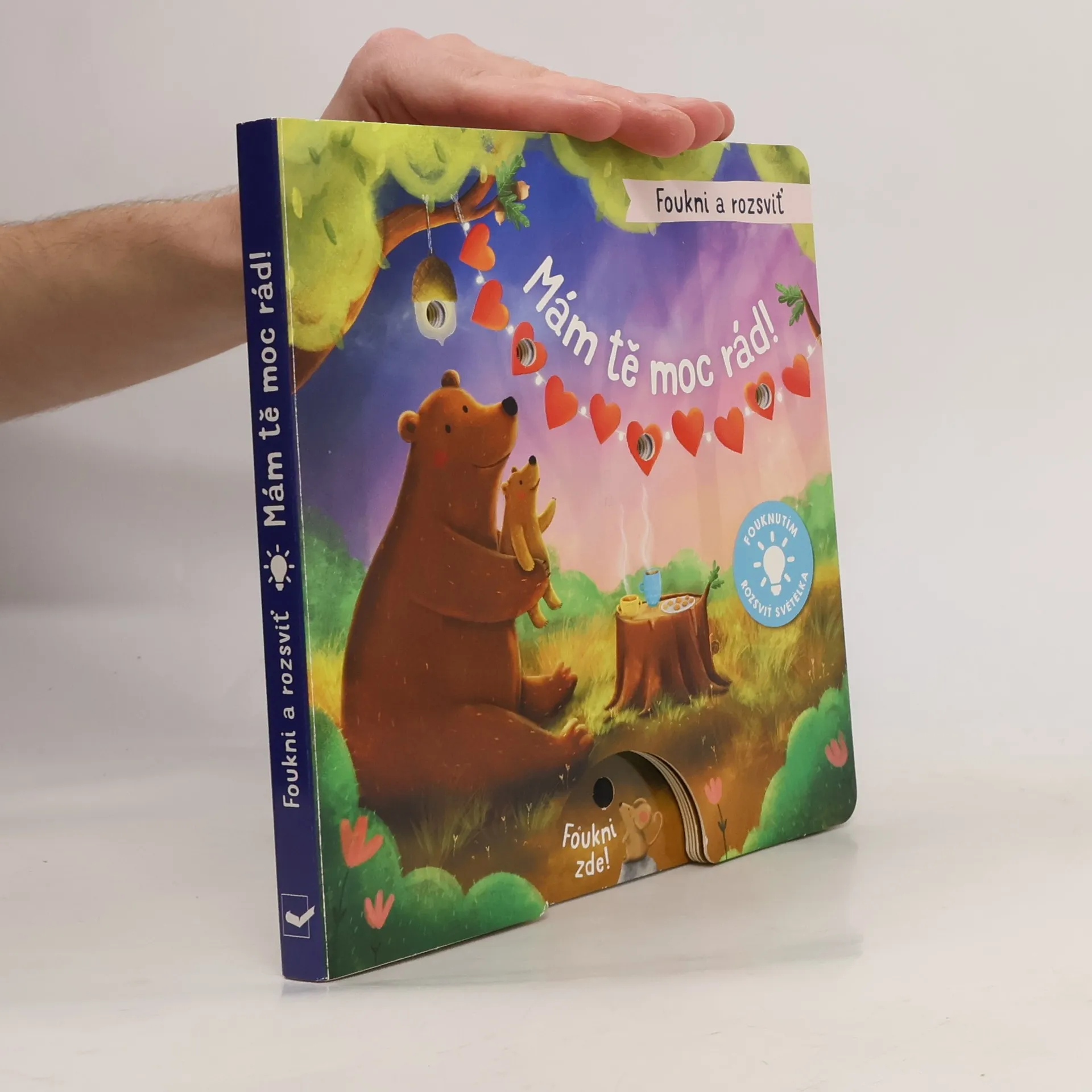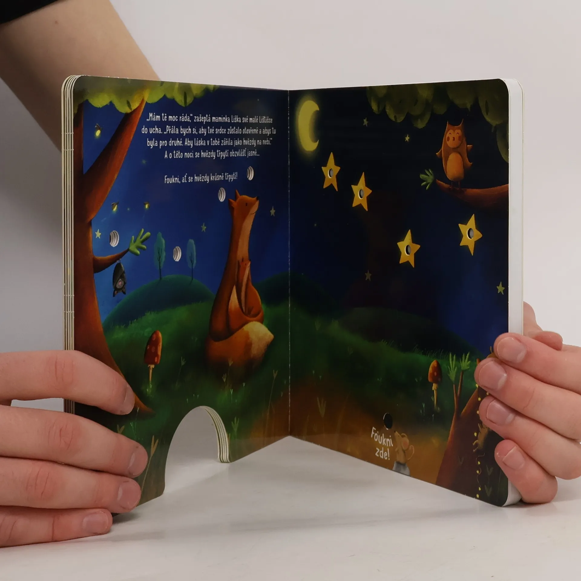 Foukni, rozsviť, počti si - fouknutím rozsviť světélka. Zvířátka v lese se mají moc ráda, v rodinách i mezi přáteli. Děda Jezevec hraje na kytaru svou oblíbenou píseň, aby potěšil vnoučata. Děti vesele tančí do rytmu a těší se z padajících konfet. A maminka Liška? Rozzáří hvězdy na obloze pro svou malou Lištičku. Má ji moc ráda! Foukni na knížku a nechej také rozzářit světélka!