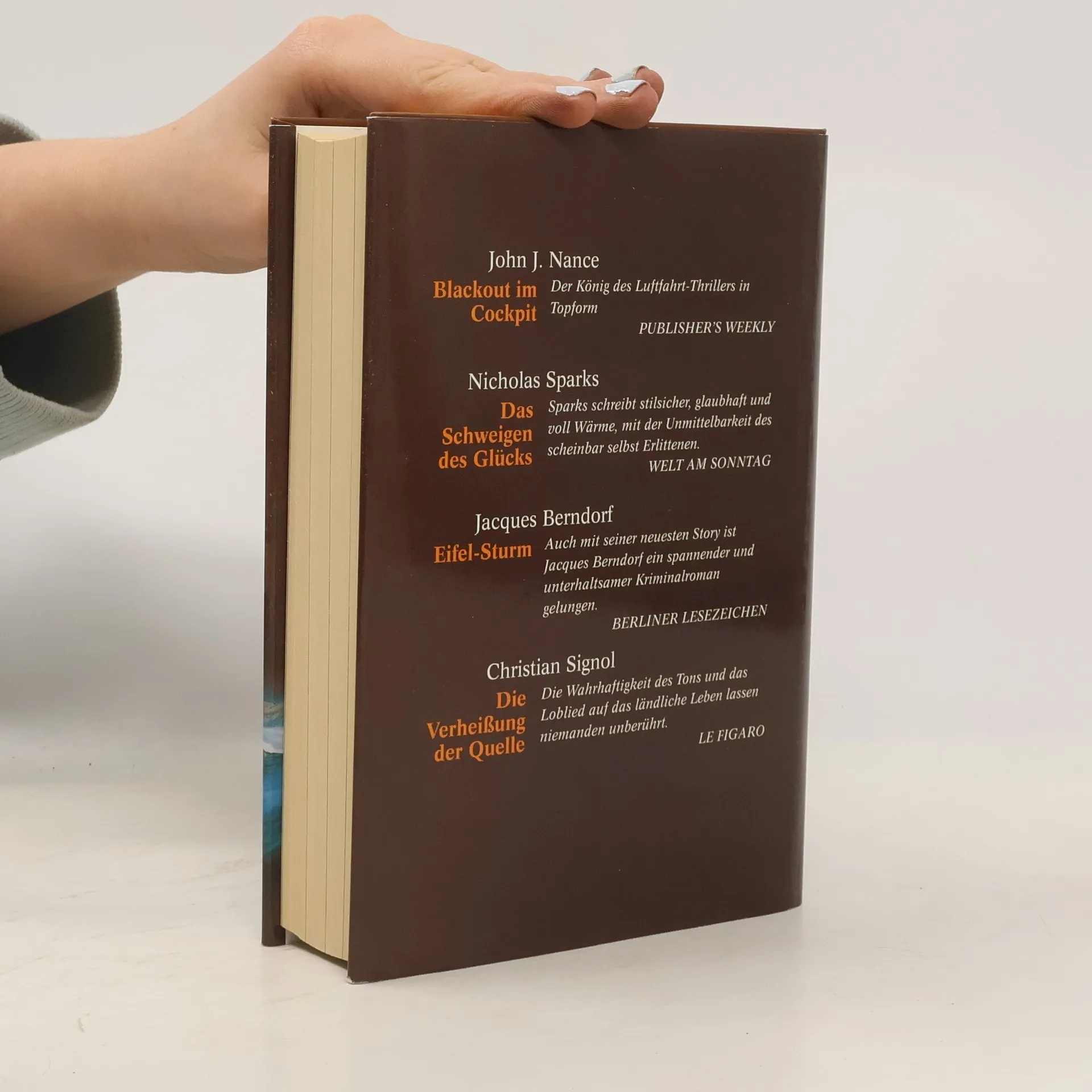 Reader's Digest Auswahlbücher. Blackout im Cockpit. Das Schweigen des Glucks. Eifel-sturm. Die Verheissung der Quelle, Nicholas Sparks, John J. Nance, Christian Signol, Jacques Berndorf