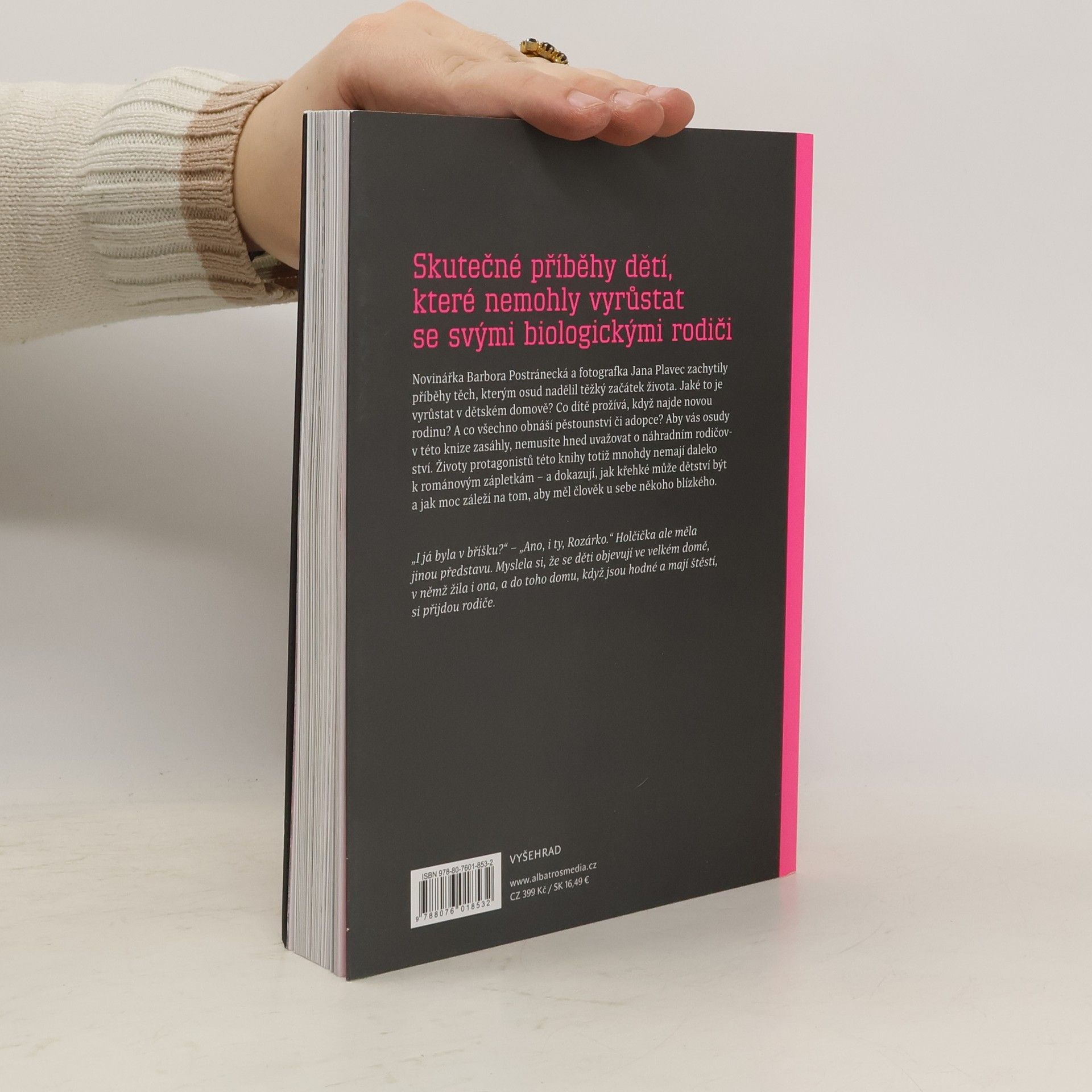 Skutečné příběhy dětí, které nemohly vyrůstat se svými biologickými rodičiNovinářka Barbora Postránecká a fotografka Jana Plavec zachytily příběhy těch, kterým osud nadělil těžký začátek života. Jaké to je vyrůstat v dětském domově? Co dítě prožívá, když najde novou rodinu? A co všechno obnáší pěstounství či adopce? Aby vás osudy v této knize zasáhly, nemusíte hned uvažovat o náhradním rodičovství. Životy protagonistů totiž mnohdy nemají daleko k románovým zápletkám – a dokládají, jak moc záleží na tom, aby měl člověk během dětství u sebe někoho blízkého.