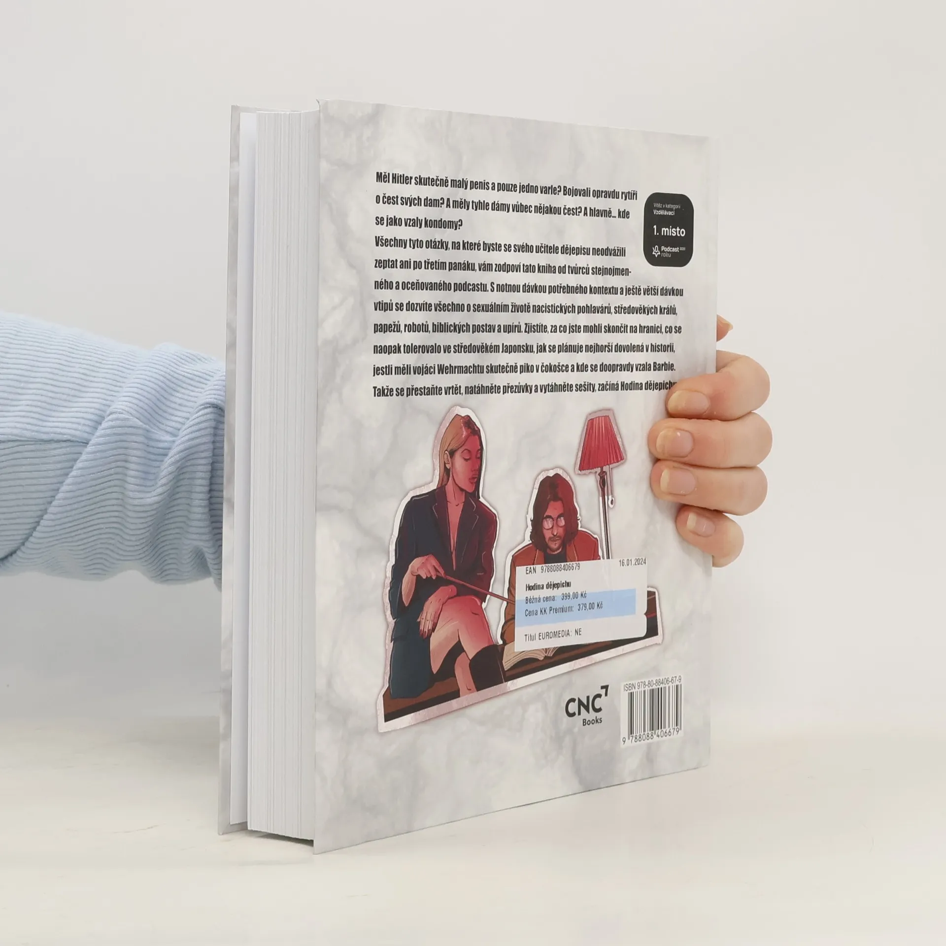 Měl Hitler skutečně malý penis a pouze jedno varle? Bojovali opravdu rytíři o čest svých dam? A měly tyhle dámy vůbec nějakou čest? A hlavně… kde se jako vzaly kondomy? Všechny tyto otázky, na které byste se svého učitele dějepisu neodvážili zeptat ani po třetím panáku, vám zodpoví tato kniha od tvůrců stejnojmenného a oceňovaného podcastu. S notnou dávkou potřebného kontextu a ještě větší dávkou vtipů se dozvíte všechno o sexuálním životě nacistických pohlavárů, středověkých králů, papežů, robotů, biblických postav a upírů. Zjistíte, za co jste mohli skončit na hranici, co se naopak tolerovalo ve středověkém Japonsku, jak se plánuje nejhorší dovolená v historii, jestli měli vojáci Wehrmachtu skutečně piko v čokošce a kde se doopravdy vzala Barbie. Takže se přestaňte vrtět, natáhněte přezůvky a vytáhněte sešity, začíná Hodina dějepichu.