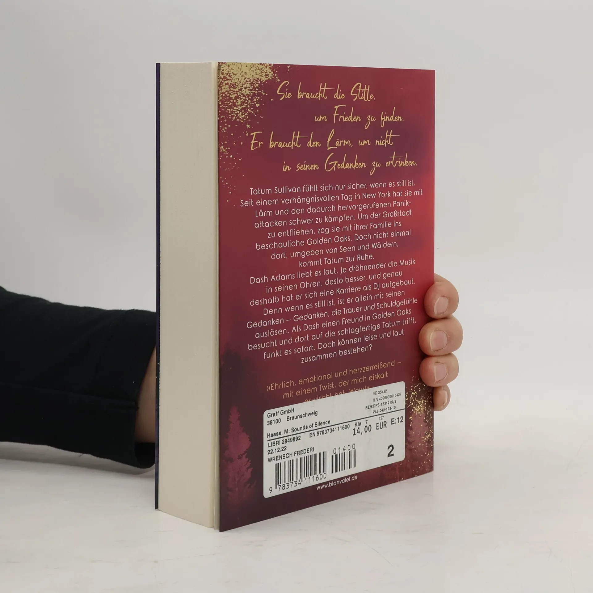 Tatum & Dash: Sie braucht die Stille, um Frieden zu finden. Er braucht den Lärm, um mit seinen Gedanken nicht alleine zu sein. Doch können leise und laut gemeinsam bestehen? Tatum Sullivan fühlt sich nur sicher, wenn es still ist. Seit einem verhängnisvollen Tag in New York hat sie mit Lärm und den dadurch hervorgerufenen Panikattacken schwer zu kämpfen. Um der lauten Großstadt zu entfliehen, zog sie vor einigen Jahren mit ihrer Familie ins beschauliche Golden Oaks, Connecticut. Doch nicht einmal dort, umgeben von Seen und endlosen Wäldern, kommt Tatum zur Ruhe. Dash Adams liebt es laut. Je dröhnender die Musik in seinen Ohren, desto besser, und genau deshalb hat er sich auch eine Karriere als DJ aufgebaut. Denn wenn es still ist, ist er allein mit seinen Gedanken – Gedanken, die Trauer und Schuldgefühle auslösen. Als Dash einen Freund in Golden Oaks besucht und dort auf die schlagfertige Tatum trifft, funkt es sofort. Doch können leise und laut zusammen bestehen? »Ich bin Tatum und Dash hoffnungslos verfallen. Ihre Geschichte ist ehrlich, emotional und herzzerreißend – mit einem Twist, der mich eiskalt erwischt hat. Wow!« Anya Omah