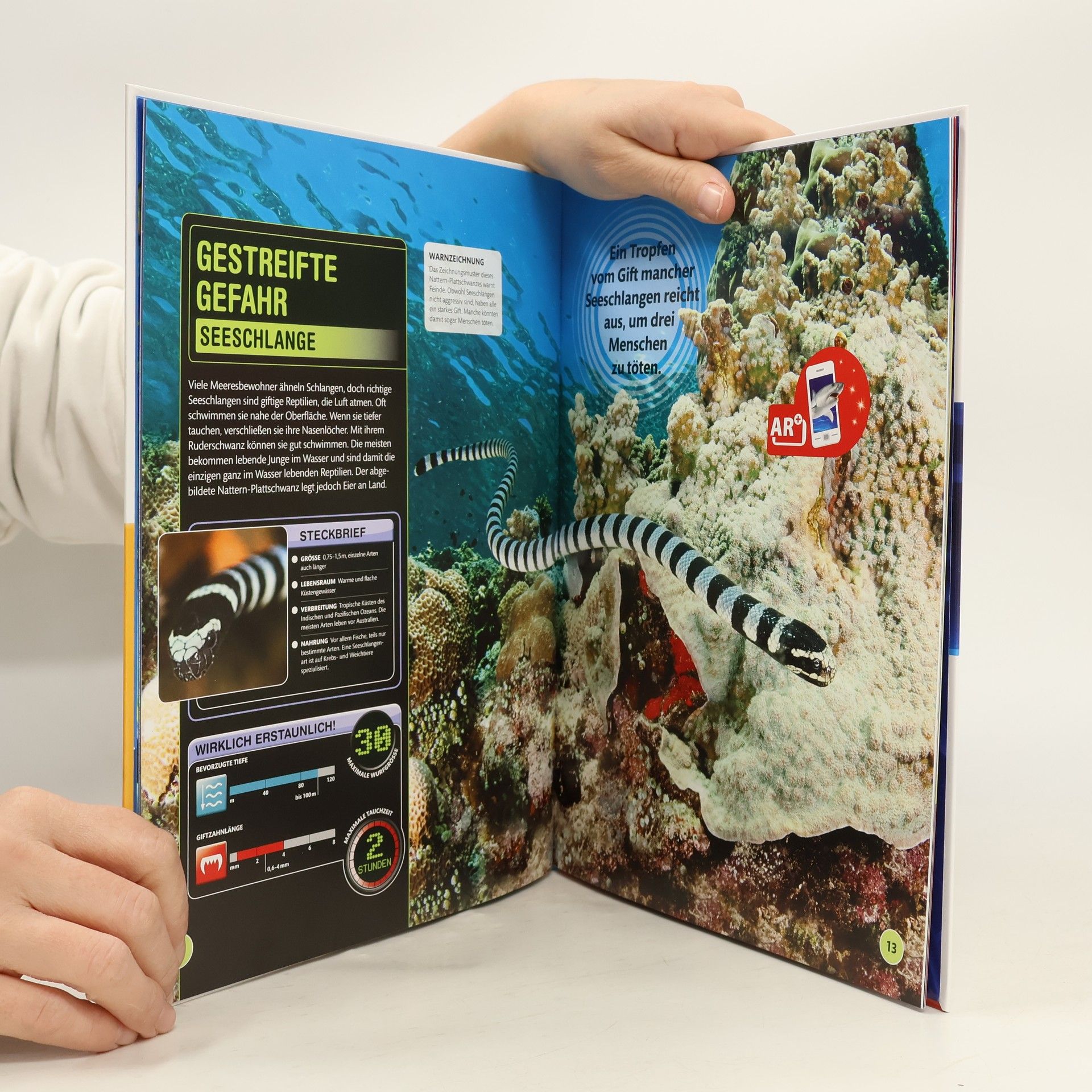 Hai-lights aus der Tiefe! Blitzschnell zuschnappen, im trüben Wasser sehen und Beute kilometerweit wahrnehmen – Haie sind zu wahren Superleistungen fähig. Aber auch andere Meeresbewohner stehen ihnen in nichts nach. Dieses Buch verrät alles über die beeindruckendsten Meeresbewohner: vom größten aller Fische, dem Walhai, bis hin zum Tiefsee-Anglerfisch, der eine leuchtende Laterne auf dem Kopf trägt. Im doppelseitigen Porträt werden über 80 verschiedene Tiere der Ozeane mit verblüffenden Eigenschaften und Verhaltensweisen vorgestellt. Steckbriefe geben einen kurzen Überblick über Größe, Lebensraum, Verbreitung und Nahrung. Die Rubrik "Wirklich erstaunlich!" stellt interessante Daten grafisch dar. Eindrucksvolle, große Farbfotos setzen die Meeresbewohner perfekt in Szene. Spektakuläre 3D-Grafiken enthüllen anatomische Besonderheiten und gewähren ungewöhnliche Einblicke. Dieses Buch stillt jeden Wissenshunger von Tierfans und geht vielen spannenden Geheimnissen auf den (Meeres-)Grund!