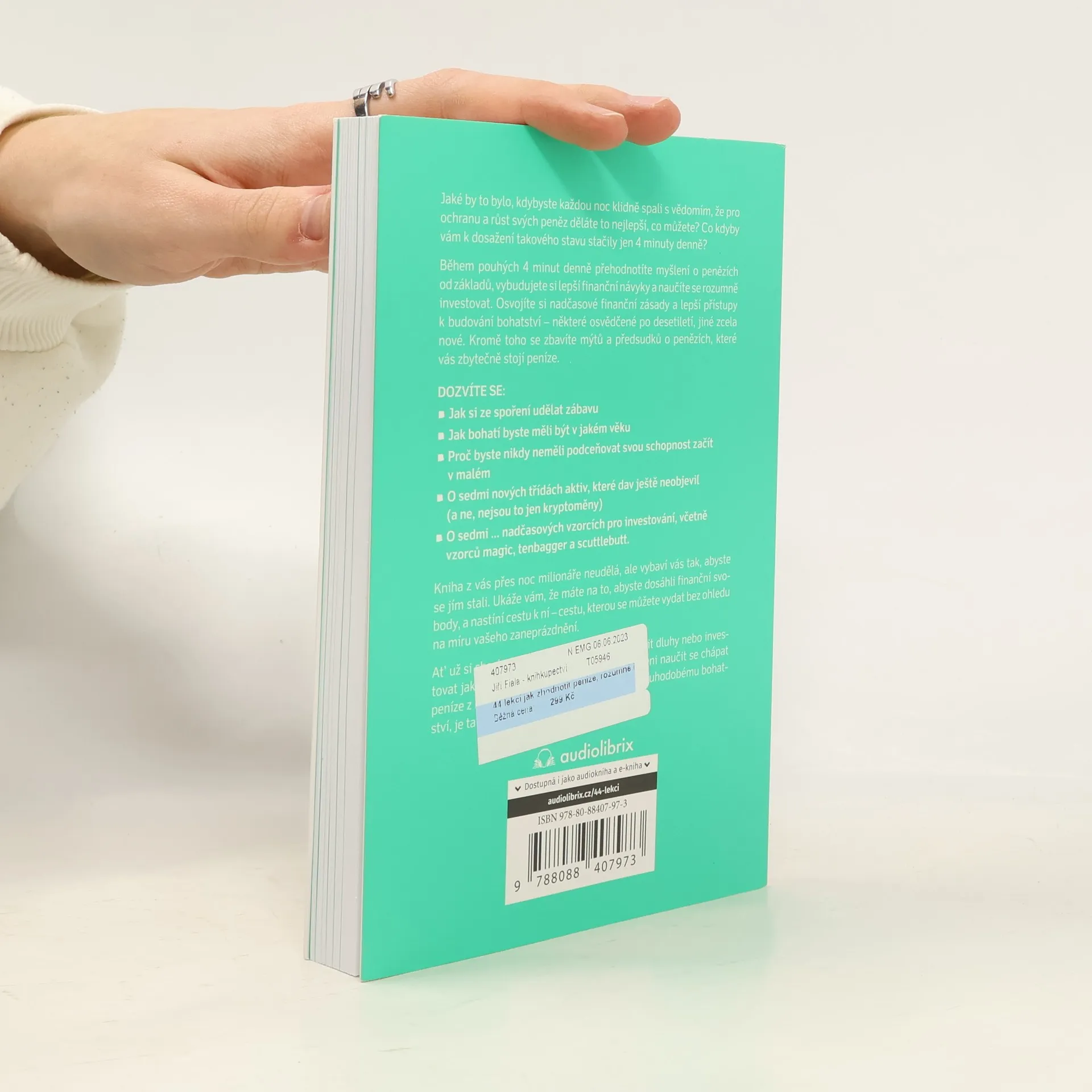 Jaké by to bylo, kdybyste každou noc klidně spali s vědomím, že pro ochranu a růst svých peněz děláte to nejlepší, co můžete? Co kdyby vám k dosažení tohoto pocitu stačily jen 4 minuty denně?Během pouhých 4 minut denně přehodnotíte myšlení o penězích od základů, vybudujete si lepší finanční návyky a naučíte se rozumně investovat. Osvojíte si nadčasové finanční zásady a lepší přístupy k budování bohatství – některé osvědčené po desetiletí, jiné zcela nové. Kromě toho se zbavíte mýtů a předsudků o penězích, které vás zbytečně stojí peníze.Dozvíte se:Jak si ze spoření udělat zábavu Jak bohatí byste měli být v jakém věku Proč byste nikdy neměli podceňovat svou schopnost začít v malém O 7 nových třídách aktiv, které dav ještě neobjevil (a ne, nejsou to jen kryptoměny) O 7 nadčasových vzorcích pro investování, včetně vzorce „Magic“, „Tenbagger“ a „Scuttlebutt“Kniha z vás přes noc milionáře neudělá, ale vybaví vás tak, abyste se jím stali. Ukáže vám, že máte na to, abyste dosáhli finanční svobody, a nastíní cestu k ní – cestu, kterou se můžete vydat bez ohledu na míru vašeho zaneprázdnění.Ať už si chcete vybudovat návyk spoření, splatit dluhy nebo investovat jako profesionálové – pokud jste připraveni naučit se chápat peníze z nové perspektivy a vybudovat si dlouhodobé bohatství, je tato kniha určena právě vám.