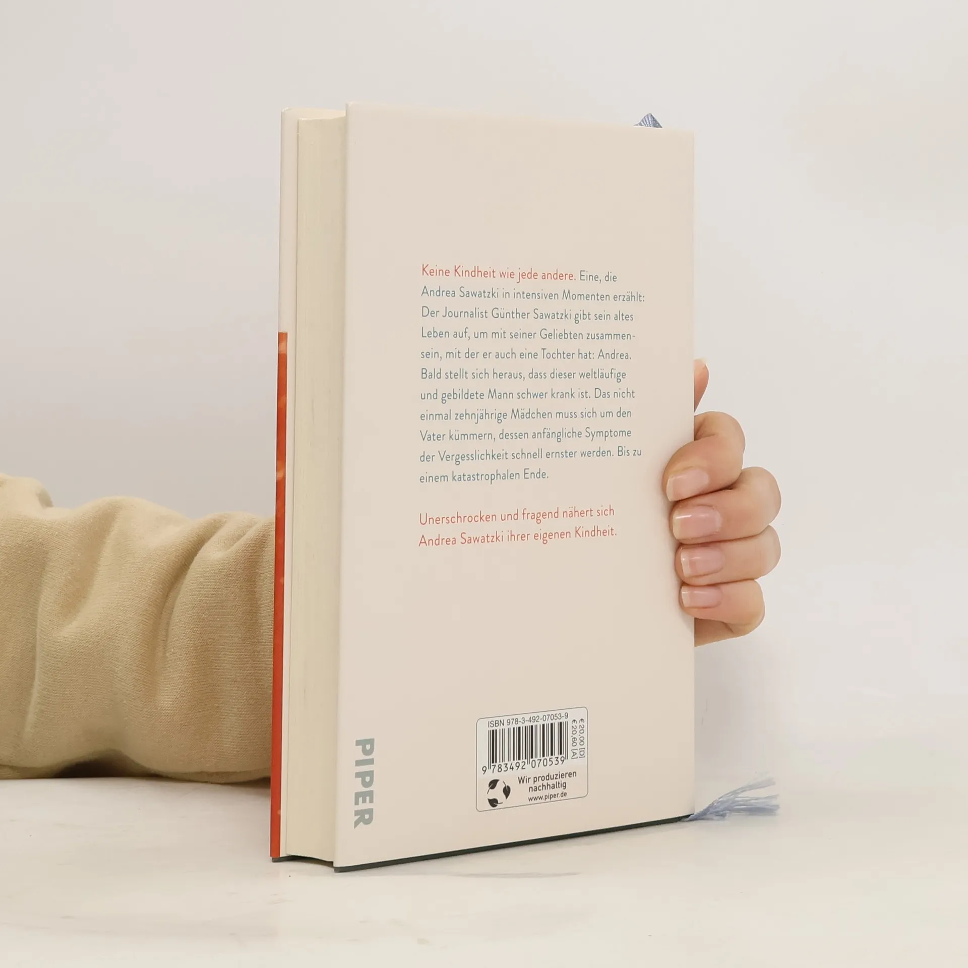 Andrea Sawatzkis ungeschminkter autofiktionaler Roman Keine Kindheit wie jede andere. Eine, die Andrea Sawatzki wie in einem Kurzfilm einfängt: 1971 wird der Journalist Günther Sawatzki von seiner Stelle in London abgezogen und geht zu seiner Familie nach Deutschland zurück. Aber er will sein altes Leben aufgeben und mit seiner Geliebten zusammen sein, mit der er eine Tochter hat: Andrea. Doch bald stellt sich heraus, dass dieser weltläufige und gebildete Mann schwer krank ist. Das Geld wird knapp, die Mutter muss wieder als Nachtschwester arbeiten, und die zehnjährige Andrea kümmert sich um den dementen Vater, der launisch, ungeduldig und jähzornig ist. Es entspinnt sich ein geheimes Leben zwischen den beiden von Nähe und Entfremdung, Liebe und Überforderung. Bis zu seinem katastrophalen Ende. Ein eindringlicher und sehr persönlicher Roman der Bestsellerautorin