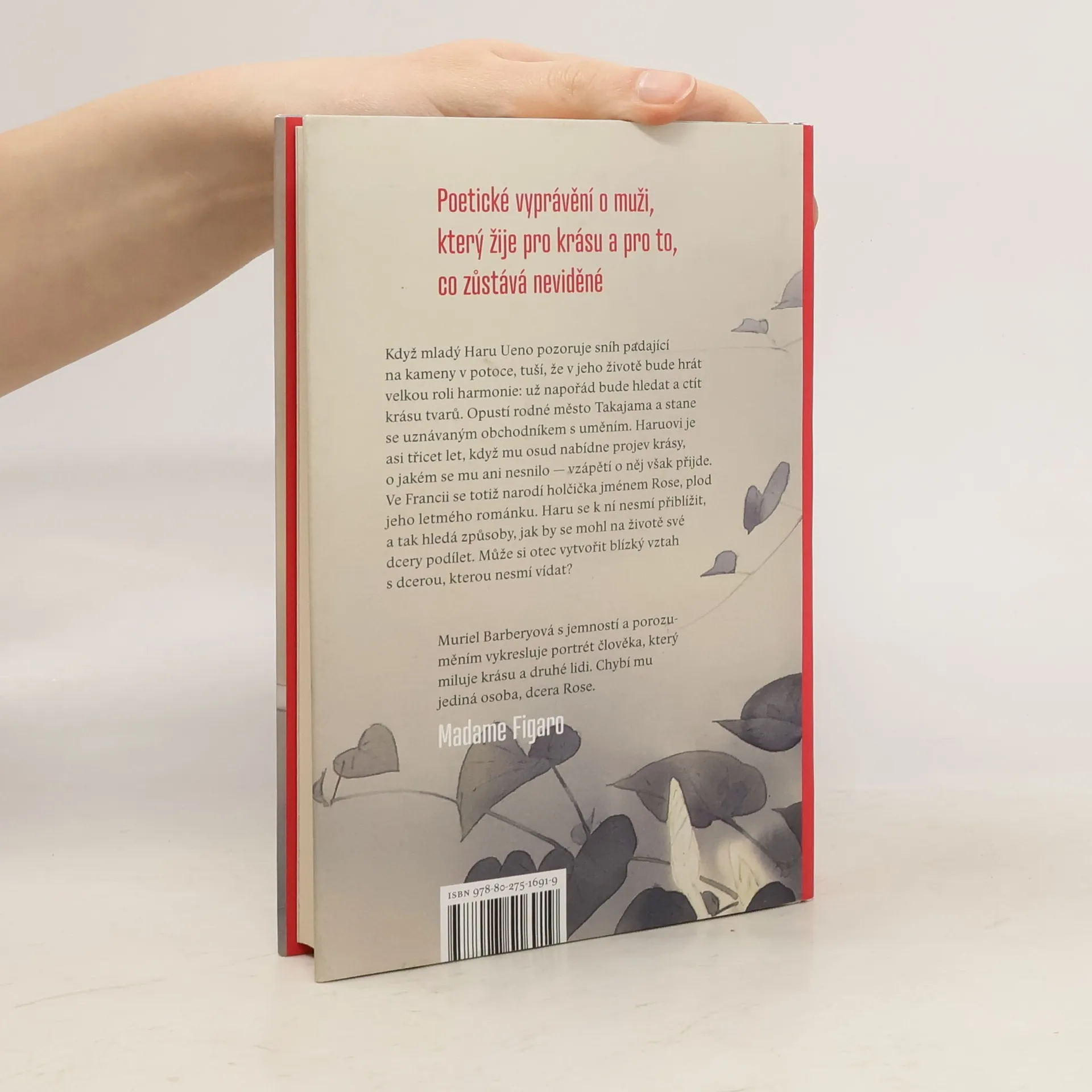 Poetické vyprávění o muži, který žije pro krásu a pro to, co zůstává neviděné. Když mladý Haru Ueno pozoruje sníh padající na kameny v potoce, tuší, že v jeho životě bude hrát velkou roli harmonie: už napořád bude hledat a ctít krásu tvarů. Opustí rodné město Takajama a stane se uznávaným obchodníkem s uměním. V Kjótu si postaví dům s javorem rostoucím ve skleněném atriu v hlavní obytné místnosti, kam se vrací po četných večírcích s přáteli z umělecké branže. Haruovi je asi třicet let, když mu osud nabídne nejkrásnější projev krásy, o jakém se mu ani nesnilo. Vzápětí však o něj přijde. Ve Francii totiž přijde na svět malá holčička jménem Rose, plod jeho letmého románku. Haru se k ní nesmí přiblížit, a tak hledá způsoby, jak by se mohl na životě své dcery i nadále podílet. Může si otec vytvořit blízký vztah s dcerou, kterou nesmí vídat? Muriel Barberyová čtenáře opět zavádí mezi japonské chrámy a zahrady a jedinečným stylem postihuje témata, která se týkají nás všech.