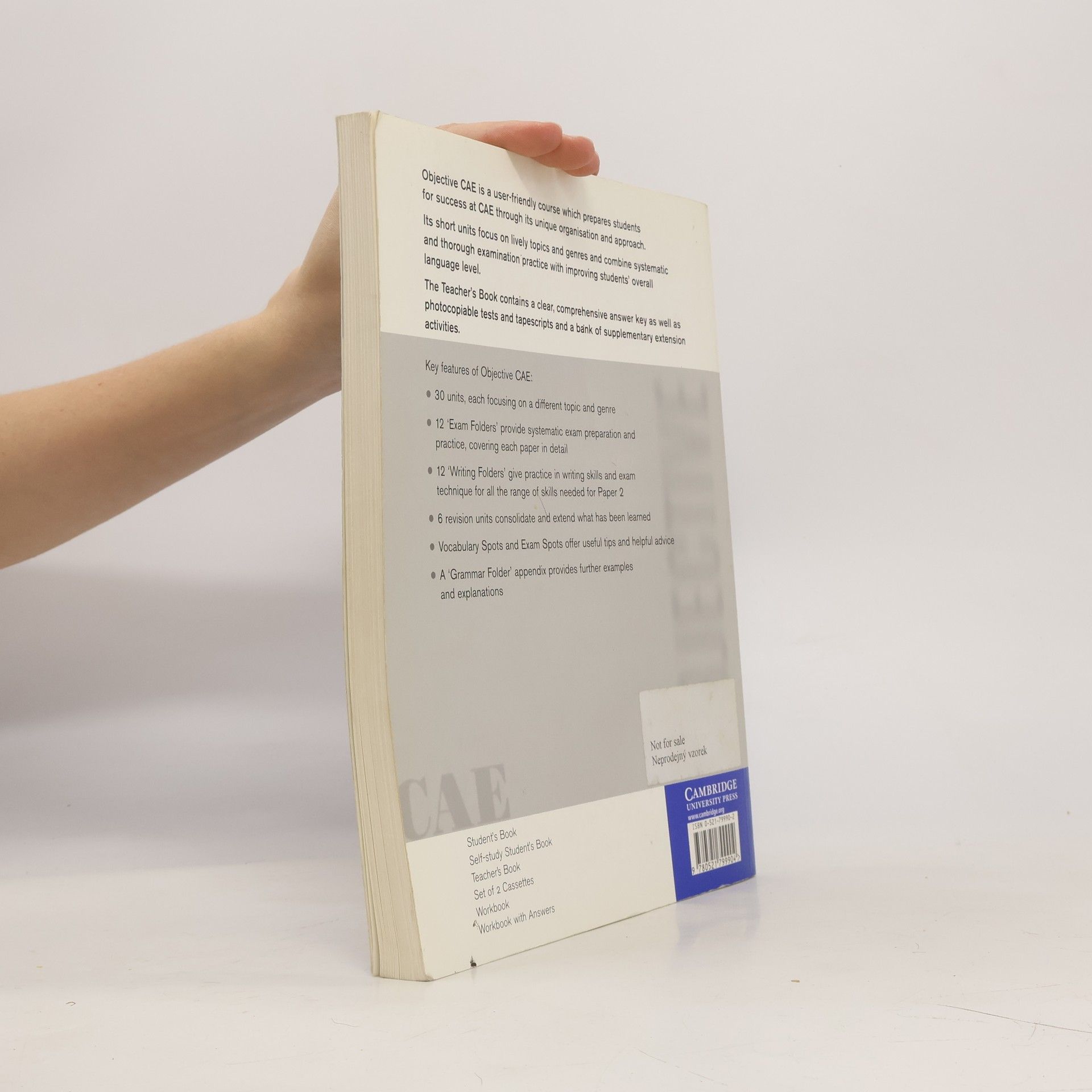 Objective CAE contains thirty short units which take a fresh approach to a wide variety of topics, and examine related genres useful for the exam. Authentic language examples illustrate a wide range of real English usage and a ?Grammar folder? appendix provides further examples and explanations. The course is written by experienced examiners who have an in-depth knowledge of the CAE exam, and contains material informed by the Cambridge Learner Corpus which highlights typical mistakes made by CAE candidates.