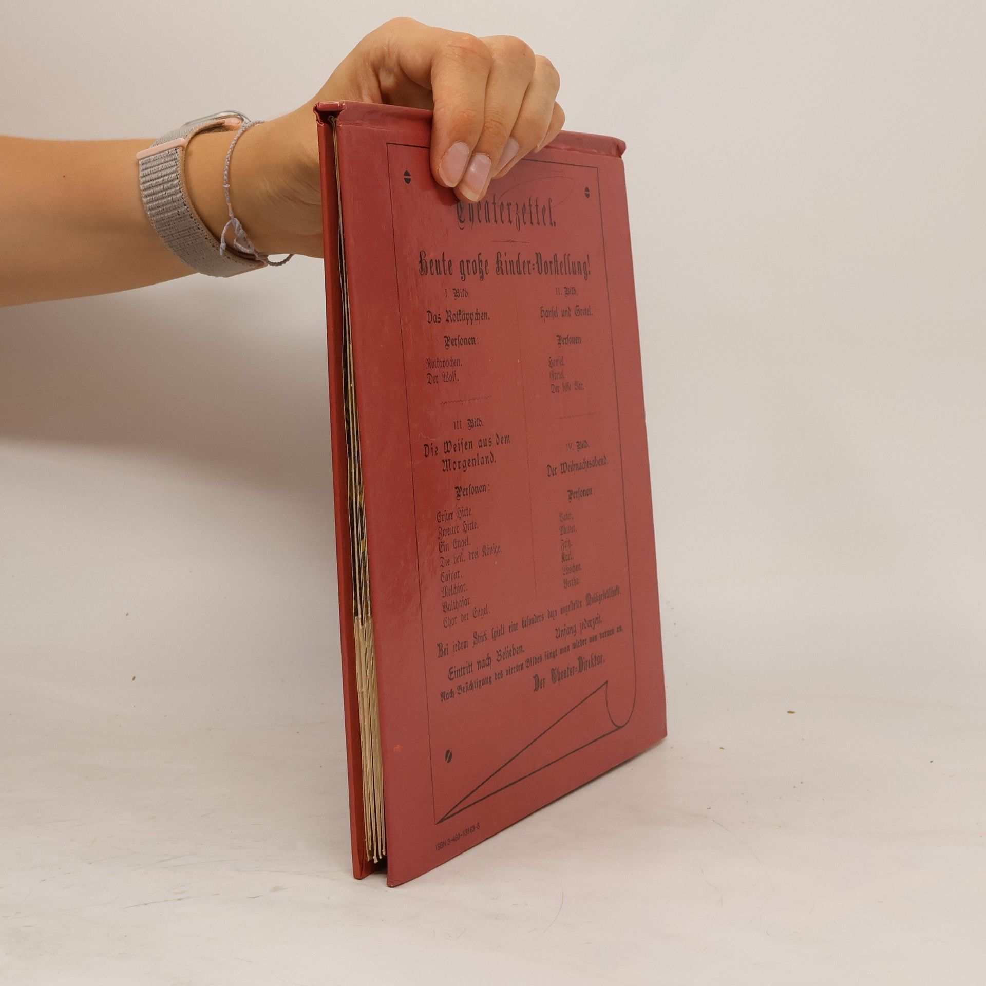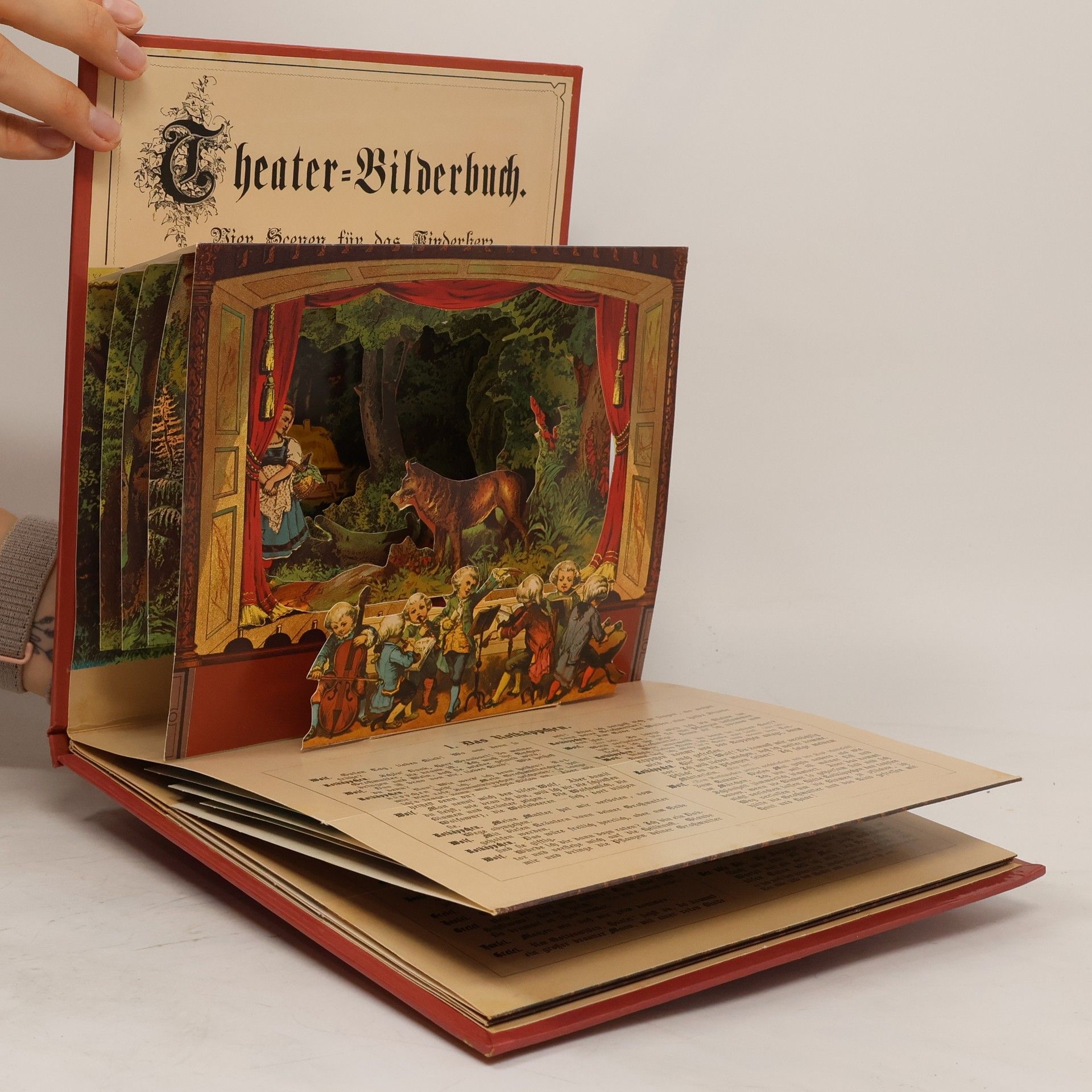 Rotkäppchen, Hänsel und Gretel, die Weisen aus dem Morgenland und der Weihnachtsabend sind dargestellt auf den vier liebevoll gestalteten dreidimensionalen Theaterbildern. Zu jeder Szene sind die entsprechenden Dialoge sowie das 'Drehbuch niedergeschrieben. Und auch mehr als hundert Jahre nach dem Erscheinen folgt der Betrachter der Anweisung des Theater-Direktors gerne: 'Nach Besichtigung des vierten Bildes fängt man wieder von vorne an.