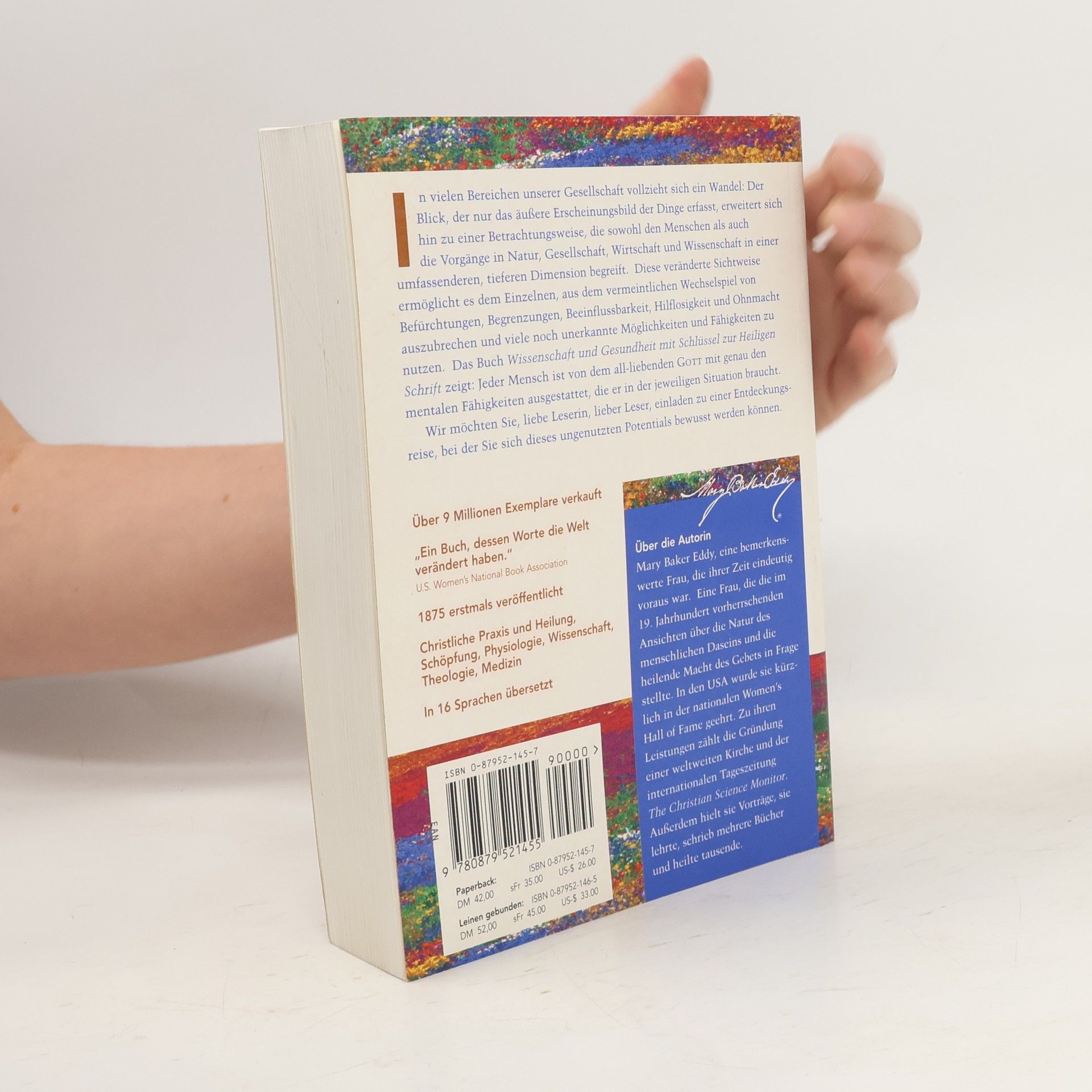 Geistige Ideen, die heilen - praktische spirituelle Antworten auf alle Lebensfragen Bestseller seit 125 Jahren - weltweit über 10 Millionen mal verkauft. Enthält 100 Seiten mit Berichten von Lesern, die mit Hilfe dieser neuen und einzigartigen Perspektiven Freiheit und Heilung erfahren haben. Die Autorin Mary Baker Eddy veröffentlichte ihr Hauptwerk, Wissenschaft und Gesundheit mit Schlüssel zur Heiligen Schrift, im Jahre 1875. Die Ideen in diesem Buch erwuchsen aus ihrer eigenen lebenslangen Suche nach Heilung. Sie suchte Hilfe in der damaligen Schulmedizin und in verschiedenen alternativen Heilmethoden. Ihre Experimente mit der Homöopathie überzeugten sie davon, dass es eine unleugbare Verbindung zwischen dem Gemüt (Mind) und dem Körper (Body) gibt. Obwohl Mary Baker Eddy keine finanziellen Mittel besaß und auf keine der heutzutage Frauen zur Verfügung stehenden Grundrechte bauen konnte, gab sie nicht auf. Sie nahm schwer kranke Patienten an und heilte sie. Sie schrieb das Buch Wissenschaft und Gesundheit und publizierte es. Sie hielt Vorträge, gründete ein metaphysisches College und gab mehrere Zeitschriften heraus. Im Alter von siebenundachtzig Jahren gründete sie die Tageszeitung 'The Christian Science Monitor'. Wissenschaft und Gesundheit das Praxis-Handbuch für metaphysisches Heilen