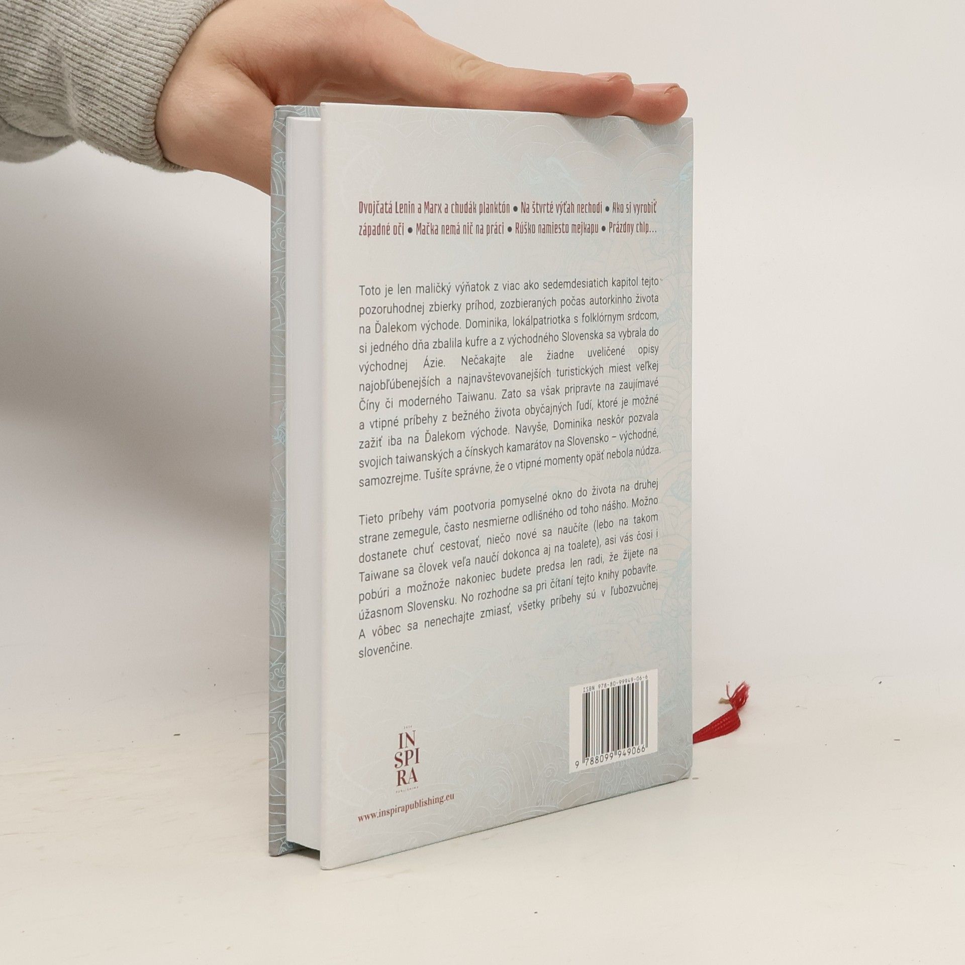 Dvojčatá Lenin a Marx a chudák planktón ● Na štvrté výťah nechodí ● Ako si vyrobiť západné oči ● Mačka nemá nič na práci ● Rúško namiesto mejkapu ● Prázdny chlp... Toto je len maličký výňatok z viac ako sedemdesiatich kapitol tejto pozoruhodnej zbierky príhod, zozbieraných počas autorkinho života na Ďalekom východe. Dominika, lokálpatriotka s folklórnym srdcom, si jedného dňa zbalila kufre a z východného Slovenska sa vybrala do východnej Ázie. Nečakajte ale žiadne uveličené opisy najobľúbenejších a najnavštevovanejších turistických miest veľkej Číny či moderného Taiwanu. Zato sa však pripravte na zaujímavé a vtipné príbehy z bežného života obyčajných ľudí, ktoré je možné zažiť iba na Ďalekom východe. Navyše, Dominika neskôr pozvala svojich taiwanských a čínskych kamarátov na Slovensko – východné, samozrejme. Tušíte správne, že o vtipné momenty opäť nebola núdza. Tieto príbehy vám pootvoria pomyselné okno do života na druhej strane zemegule, často nesmierne odlišného od toho nášho. Možno dostanete chuť cestovať, niečo nové sa naučíte (lebo na takom Taiwane sa človek veľa naučí dokonca aj na toalete), asi vás čosi i pobúri a možnože nakoniec budete predsa len radi, že žijete na úžasnom Slovensku. No rozhodne sa pri čítaní tejto knihy pobavíte. A vôbec sa nenechajte zmiasť, všetky príbehy sú v ľubozvučnej slovenčine.