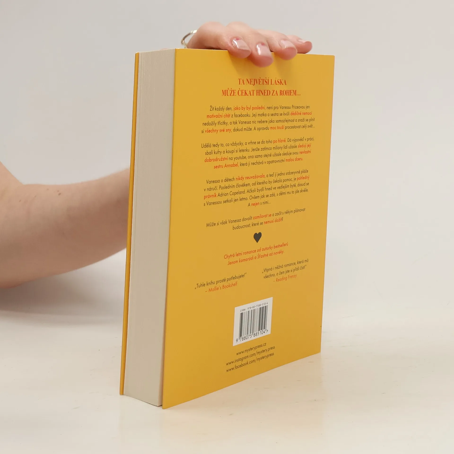 TA NEJVĚTŠÍ LÁSKA MŮŽE ČEKAT HNED ZA ROHEM…Žít každý den, jako by byl poslední, není pro Vanessu Priceovou jen motivační citát z facebooku. Její matka a sestra se kvůli dědičné nemoci nedožily třicítky, a tak Vanessa nic nebere jako samozřejmost a snaží se plnit si všechny své sny, dokud může. A opravdu moc touží procestovat celý svět…Udělá tedy to, co vždycky, a vrhne se do toho po hlavě. Dá výpověď v práci, sbalí kufry a koupí si letenku. Jenže zatímco miliony lidí užasle sledují její dobrodružství na youtube, ona sama stejně užasle sleduje svou nevlastní sestru Annabel, která jí nechává v opatrovnictví malou dceru.Vanessa o dětech nikdy neuvažovala, a teď jí jedno srdceryvně pláče v náručí. Posledním člověkem, od kterého by čekala pomoc, je pohledný právník Adrian Copeland. Ačkoli bydlí hned ve vedlejším bytě, dosud se s Vanessou setkali jen letmo. Ovšem jak se zdá, s dětmi mu to jde skvěle. A nejen s nimi…Může si však Vanessa dovolit zamilovat se a začít s někým plánovat budoucnost, které se nemusí dožít?____Chytrá letní romance od autorky bestsellerů Jenom kamarádi a Šťastně až navěky.„Tuhle knihu prostě potřebujete!“ – Mollie’s Bookshelf„Vtipná i něžná romance, která má všechno, o čem jste si přáli číst!“ – Reading Frenzy