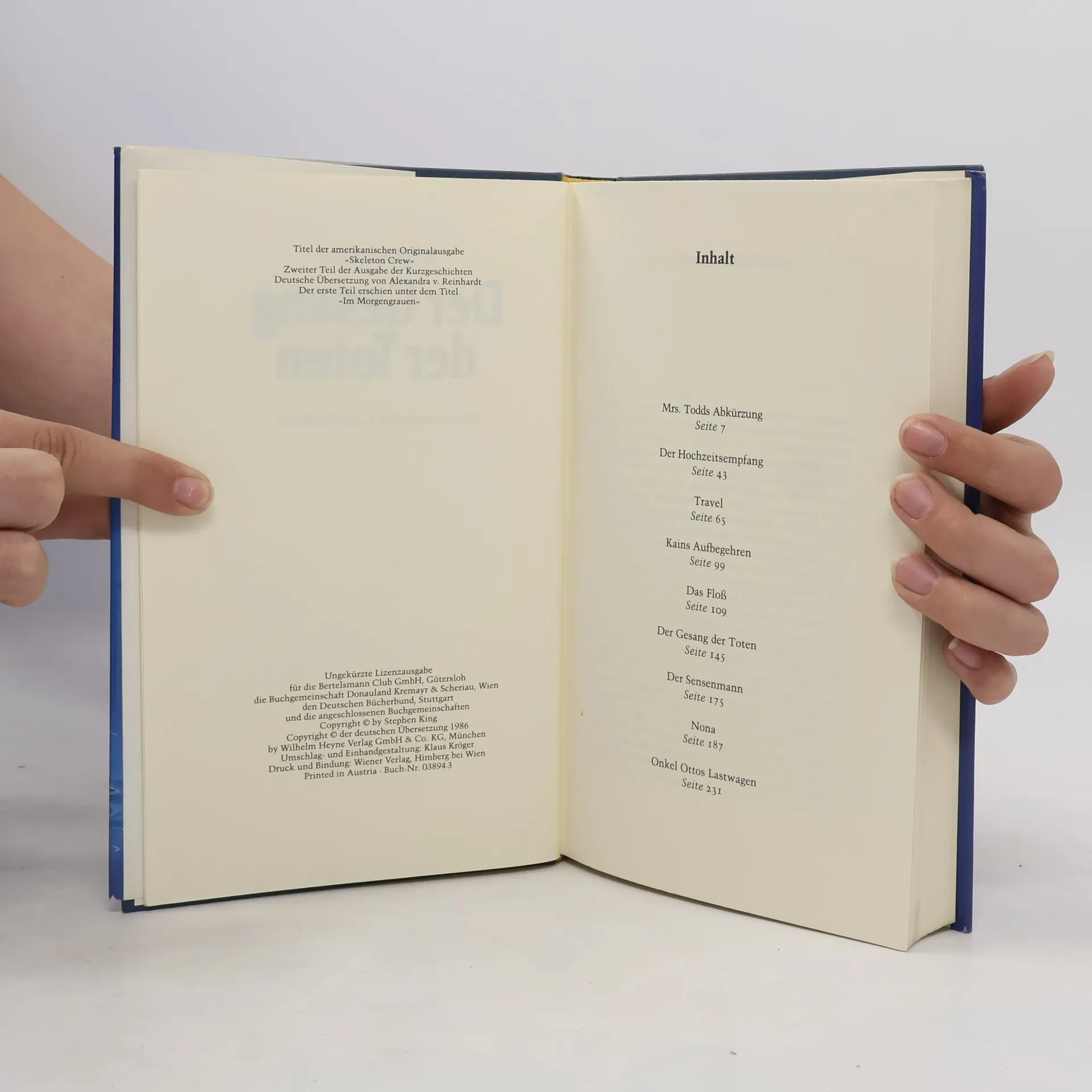* Mrs. Todds Abkürzung * Der Hochzeitsempfang * Travel * Kains Aufbegehren * Das Floß * Der Gesang der Toten * Der Sensenmann * Nona * Onkel Ottos Lastwagen Teil eins von drei der deutschsprachigen Ausgabe von \"Skeleton Crew\"