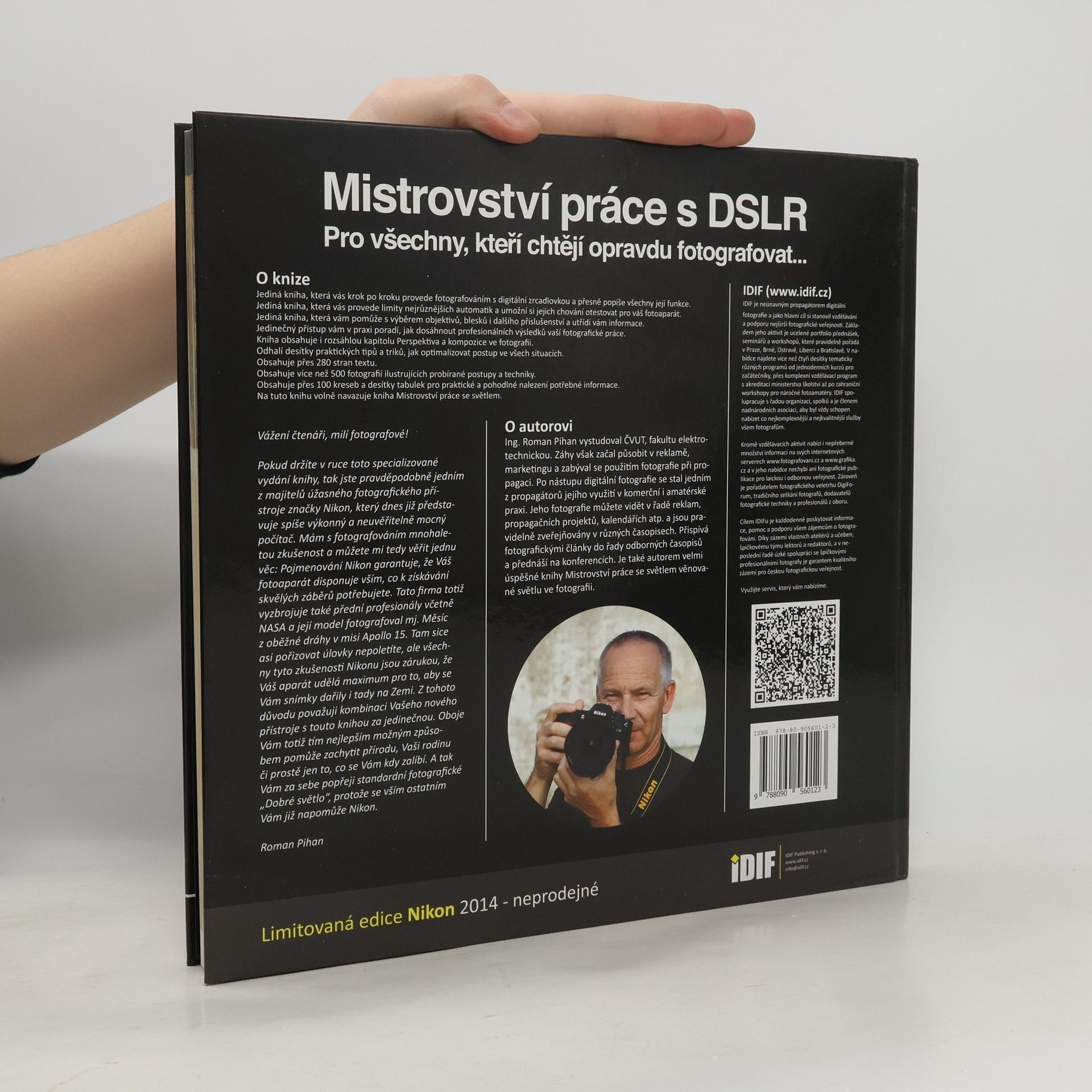 Kniha Mistrovství práce s DSLR jako první nabízí opravdu vyčerpávající odpovědi na všechny vaše otázky týkající se práce s DSLR. Jde o původní českou publikaci, na které tým lektorů IDIFu pracoval skoro rok. Autorem textu je Roman Pihan, který se problematice práce s DSLR věnuje soustavně již přes pět let. Začtěte se do této unikátní knihy a najděte odpovědi na své otázky.Kniha je napsána sice velice odborně, ale Roman Pihan tyto termíny vždy vysvětlí velice přesně, jasně a srozumitelně. Proto se člověk nemusí bát, že by něco nepochopil. Jeho jazyk je ale spíše odbornější. Sám Roman Pihan o ní mluví jako o knize, která má seznámit uživatele s provozem zrcadlovky, jejím pochopením a samozřejmě bezchybnou obsluhou. Na tuto publikaci navazuje Mistrovství práce se světlem, kde naopak rozebírá taje světla, tonalitu barev a bere na zřetel jeho zpracování.