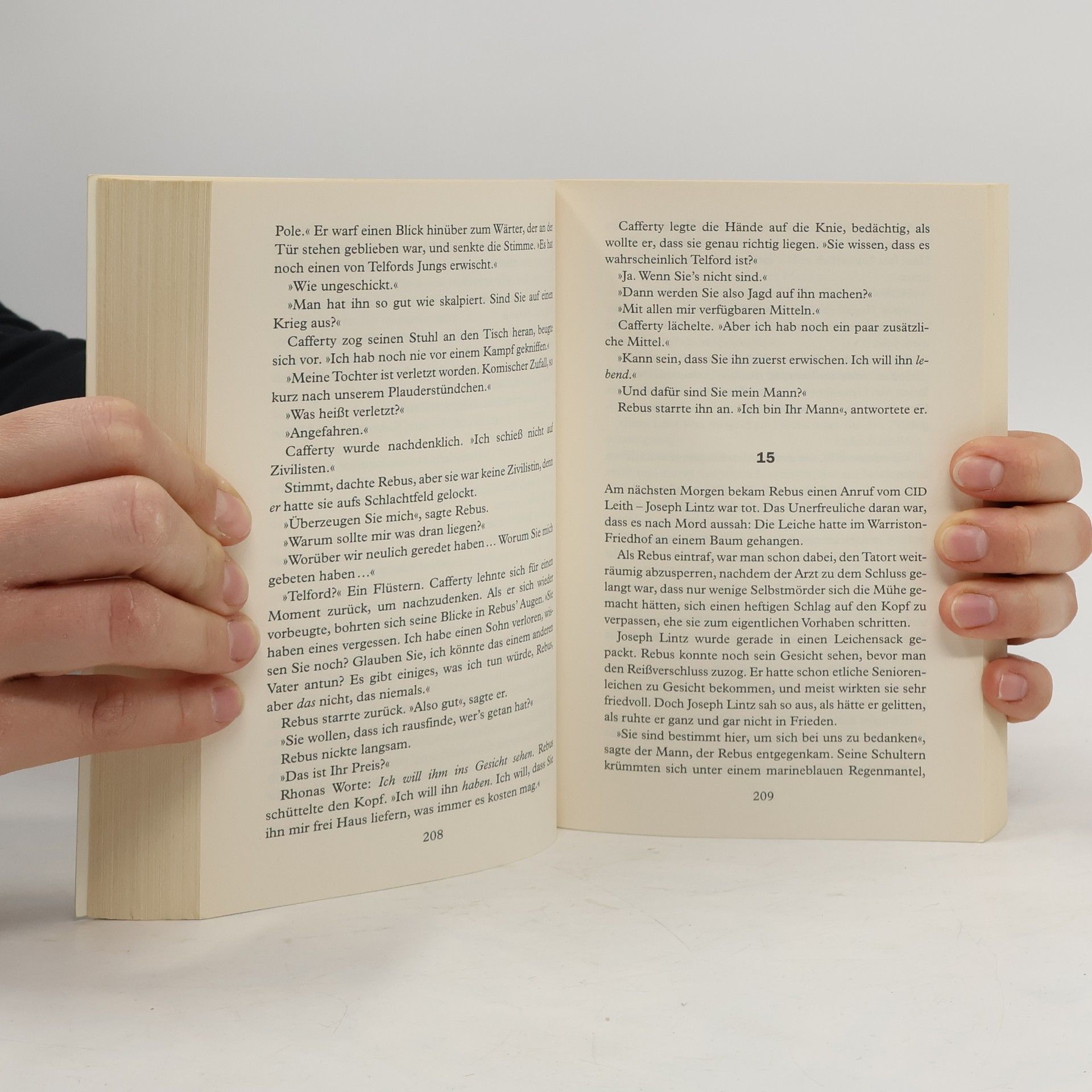 Es sind zwei Fälle, die scheinbar nichts miteinander zu tun haben: Ein alter Mann wird eines Naziverbrechens bezichtigt, leugnet aber vehement jede Schuld. Und die zur Prostitution gezwungene Candice weigert sich, die Namen ihrer Zuhälter preiszugeben. Noch bevor Rebus erste Beweise sammeln kann, überschlagen sich die Ereignisse: der alte Mann wird erhängt aufgefunden, Candice entführt und Rebus Tochter Sammy liegt nach einem offenbar gezielt verursachten Unfall im Koma. Die Fäden scheinen beim Unterweltneuling Tommy Telford zusammenzulaufen – und Rebus sinnt auf persönliche Rache an dem Fahrer des Unfallwagens …