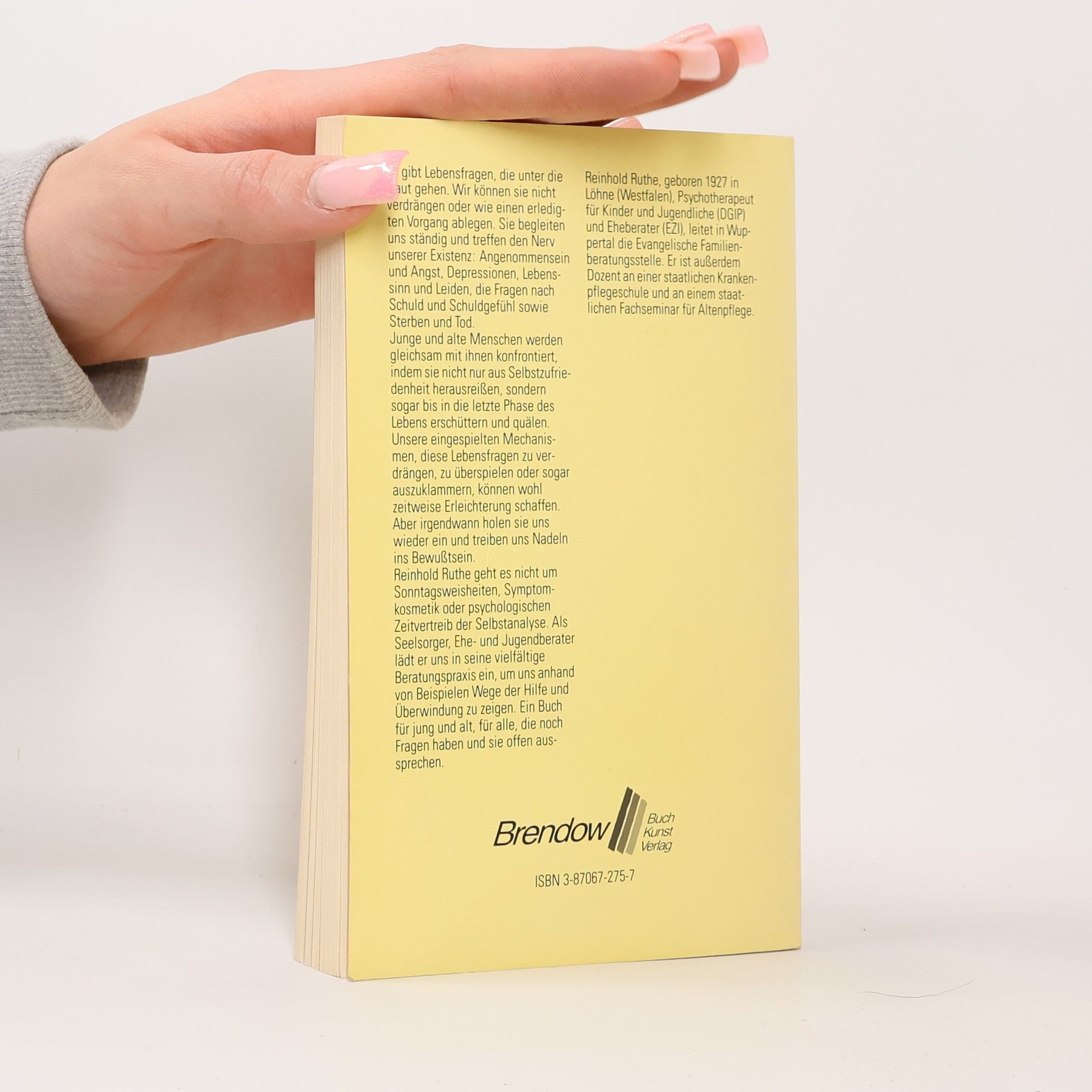 Reinhold Ruthe gibt aus seiner Beratungspraxis Hinweise zur Lösung der sieben Grundfragen des Lebens: Angenommensein, Angst, Leiden, Schuld, Sinn des Lebens, Depression und Sterben.