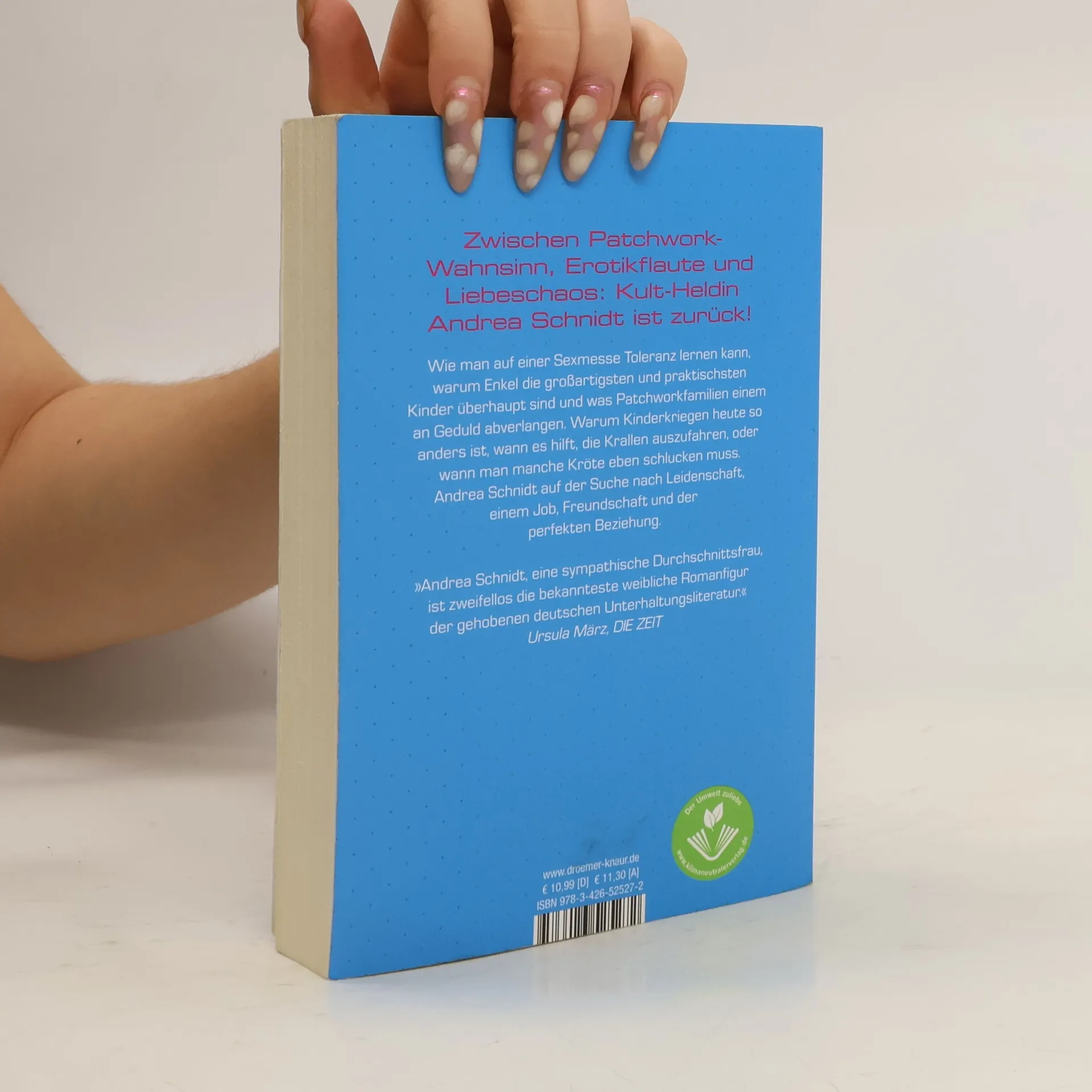 Zwischen Patchwork-Familien-Wahnsinn, Erotik-Flaute und Chaos in Sachen Liebe: In Susanne Fröhlichs 11. humorvollen Roman um Andrea Schnidt bleibt der Kult-Alltagsheldin kaum Zeit zum Verschnaufen – und dann wird sie auch noch Oma! Fragen über Fragen, die sich vor Andrea Schnidt auftürmen: Warum ist im heimischen Bett plötzlich so wenig los? Hilft da ein schickes Reizwäscheset oder hat Sex eben auch ein Verfallsdatum? Warum zieht die Ex des Liebsten, die perfekte Bea, ausgerechnet in die nächste Nachbarschaft? Muss man Patchwork-Familie lieben? Warum wird Ex-Schwiegervater Rudi nachts von der Polizei aufgegriffen, und wie fühlt es sich eigentlich an, Oma zu werden? Müssen Babys heutzutage wirklich schon im Kreissaal die erste Lektion Mandarin bekommen? Oder sind die jungen Mütter einfach alle nur ein bisschen wahnsinnig? Von Vaterschaftstests, One-Night-Stands und verwöhnten Jung-Erwachsenen, von neuen Freundinnen und Hobby-Detektiven. Vom Leben und seinen Wirrungen! Empathisch und voller lebensklugem Humor: der 11. Andrea-Schnidt-Roman im Taschenbuch. Die humorvollen Romane um Andrea Schnidt von Bestseller-Autorin Susanne Fröhlich sind in folgender Reihenfolge erschienen: Frisch gepresst Frisch gemacht! Familienpackung Treuepunkte Lieblingsstücke Lackschaden Aufgebügelt Wundertüte Feuerprobe Verzogen Abgetaucht