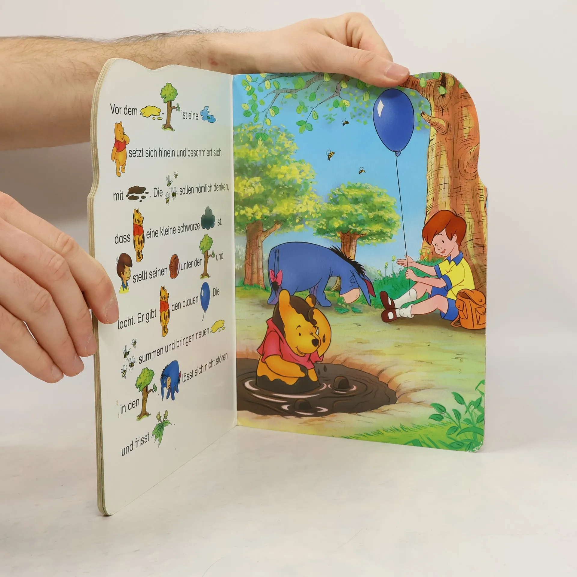 Mit allen Tricks versucht Winnie Puuh, den Bienen Honig zu entlocken. Ob es ihm wohl gelingt?