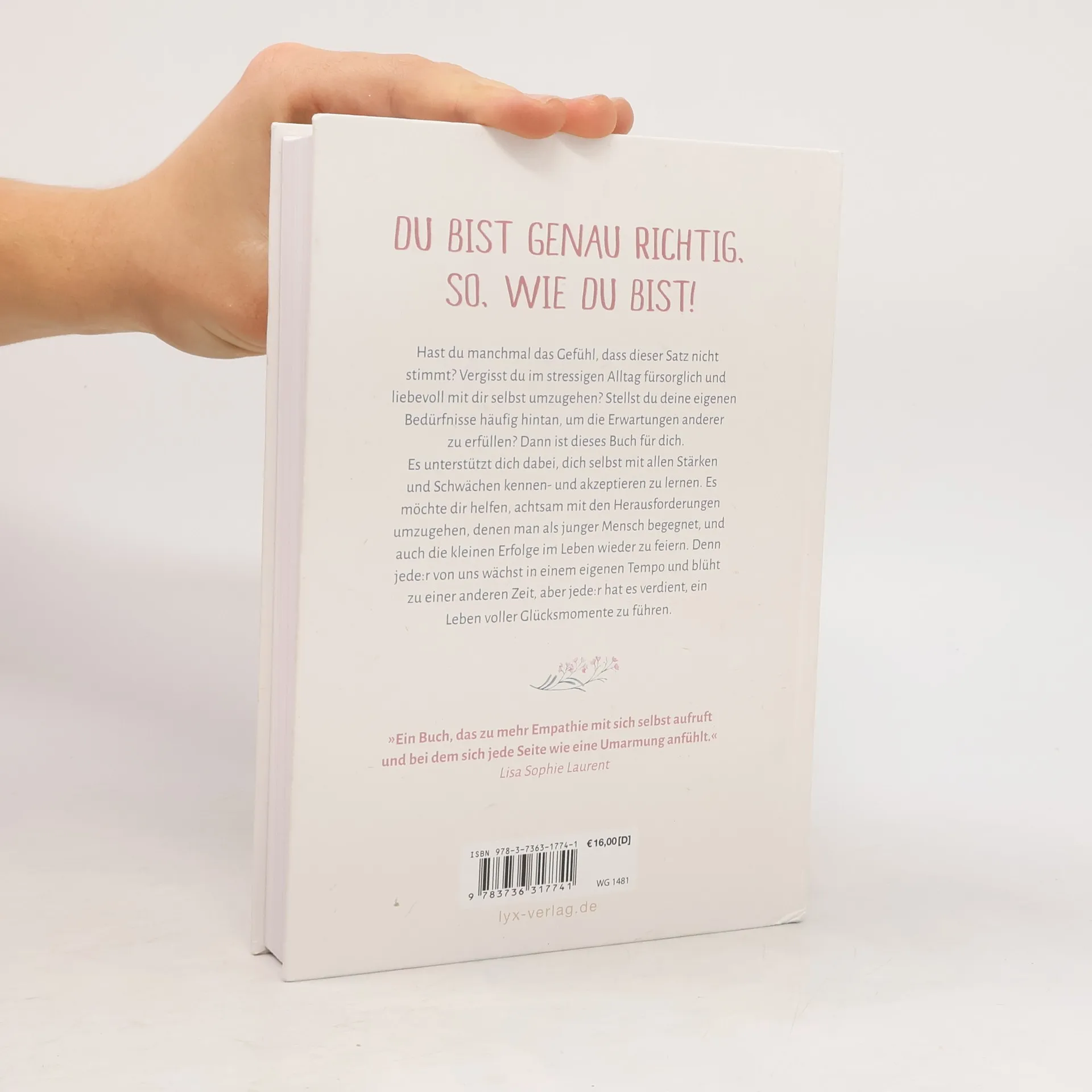 Du bist genau richtig, so, wie du bist! Hast du manchmal das Gefühl, dass dieser Satz nicht stimmt? Vergisst du im stressigen Alltag fürsorglich und liebevoll mit dir selbst umzugehen? Stellst du deine eigenen Bedürfnisse häufig hintan, um die Erwartungen anderer zu erfüllen? Dann ist dieses Buch für dich. Es unterstützt dich dabei, dich selbst mit allen Stärken und Schwächen kennen- und akzeptieren zu lernen. Es möchte dir helfen, achtsam mit den Herausforderungen umzugehen, denen man als junger Mensch begegnet, und auch die kleinen Erfolge im Leben wieder zu feiern. Denn jede: r von uns wächst in einem eigenen Tempo und blüht zu einer anderen Zeit, aber jede: r hat es verdient, ein Leben voller Glücksmomente zu führen. „Ein Buch, das zu mehr Empathie mit sich selbst aufruft und bei dem sich jede Seite wie eine Umarmung anfühlt.“ LISA SOPHIE LAURENT